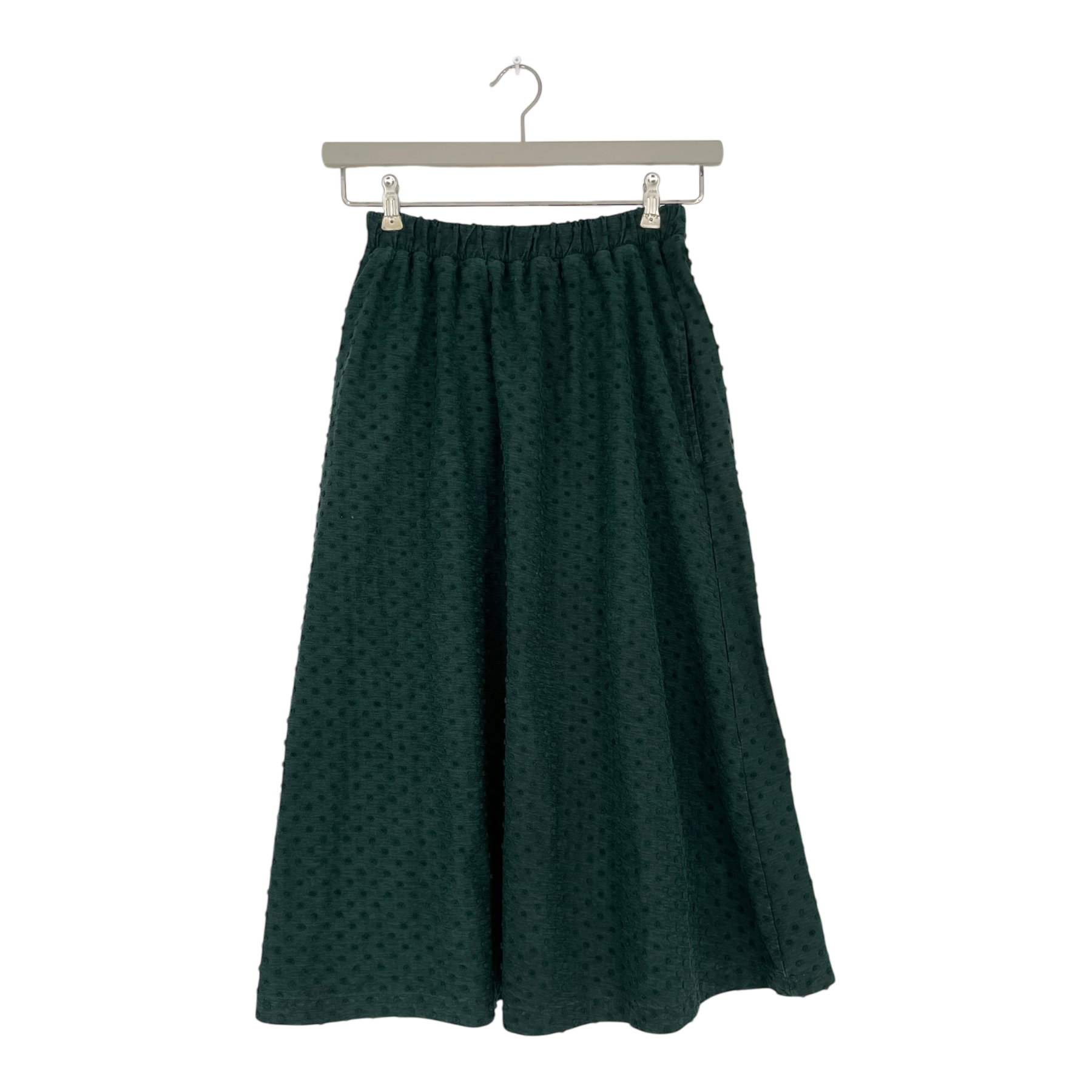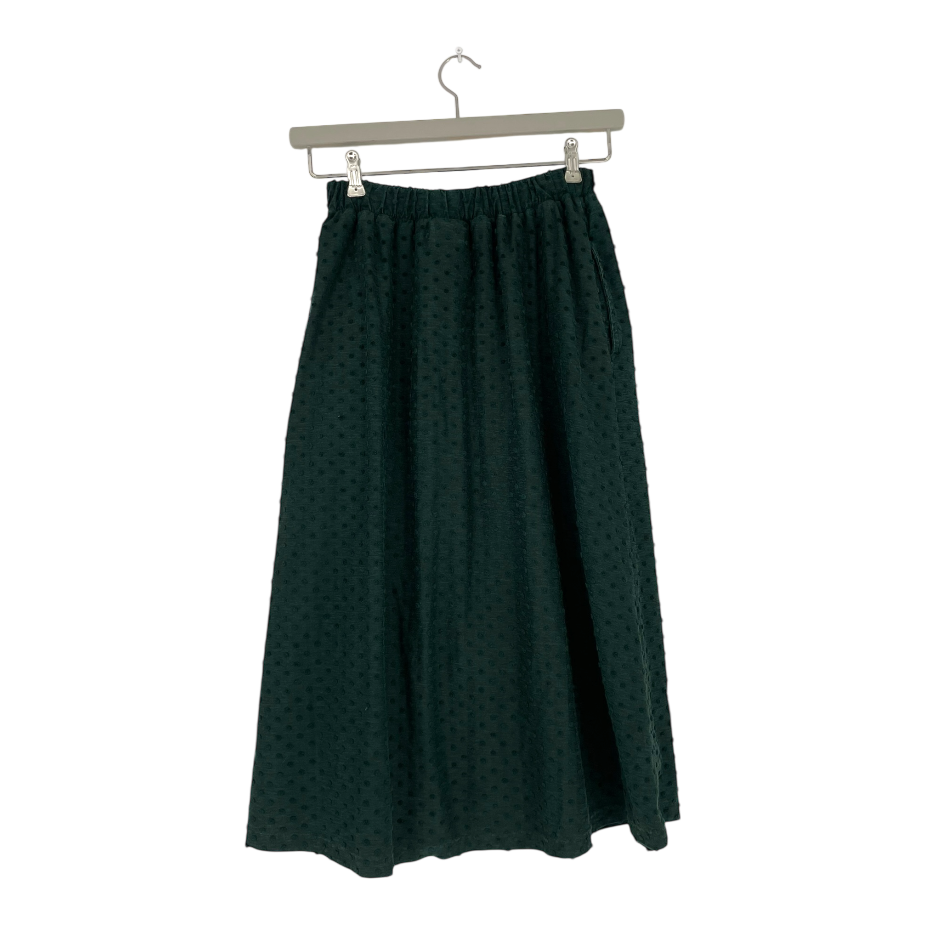 Aarrelabel women's ana skirt in green made of dot structure fabric. The skirt has pockets on the sides and is midi length.