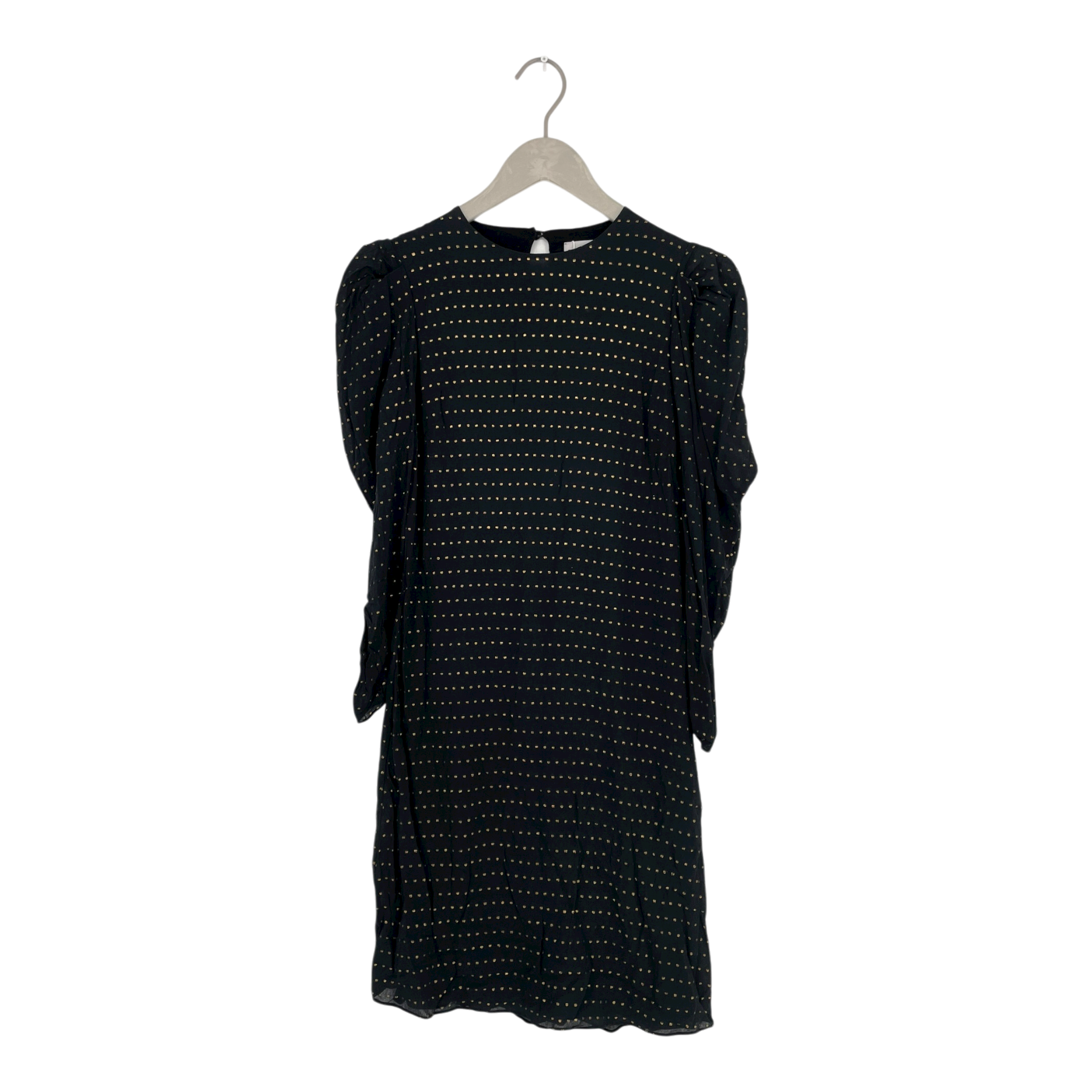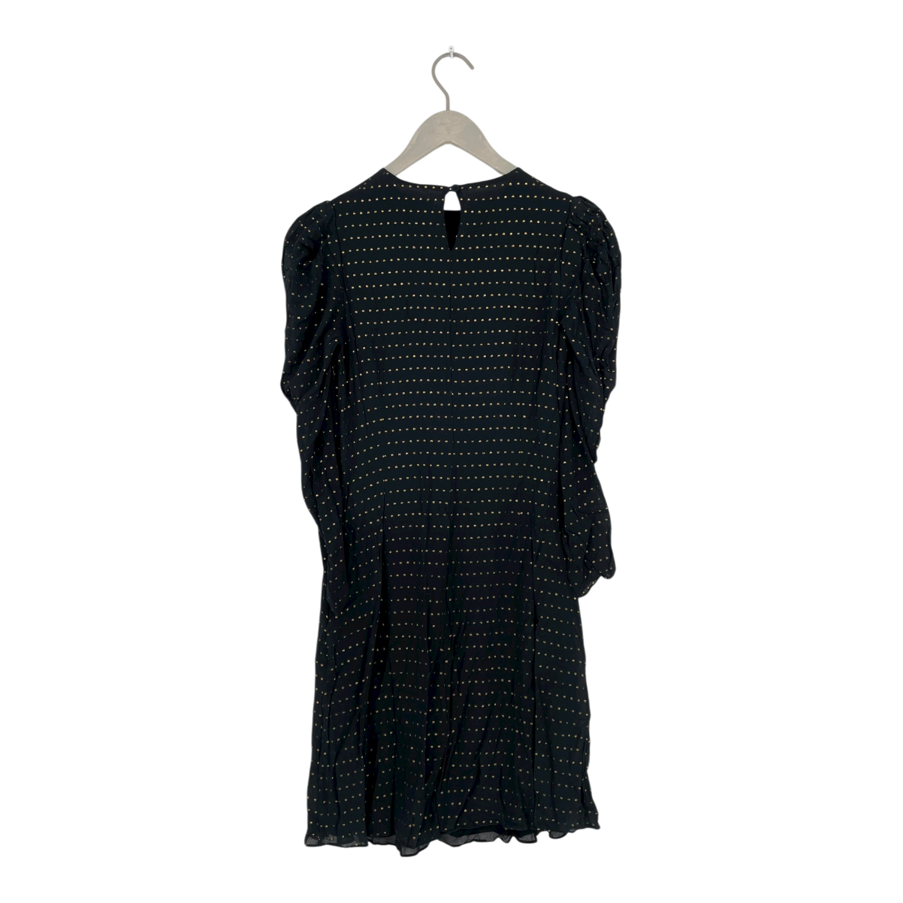 By Malene Birger Isaline long sleeve dress with slightly poofed sleeves on the shoulders,  button clasp closure on the back and a hidden side zipper. The dress has a full lining. The fabric has gold coloured detailing throughout.