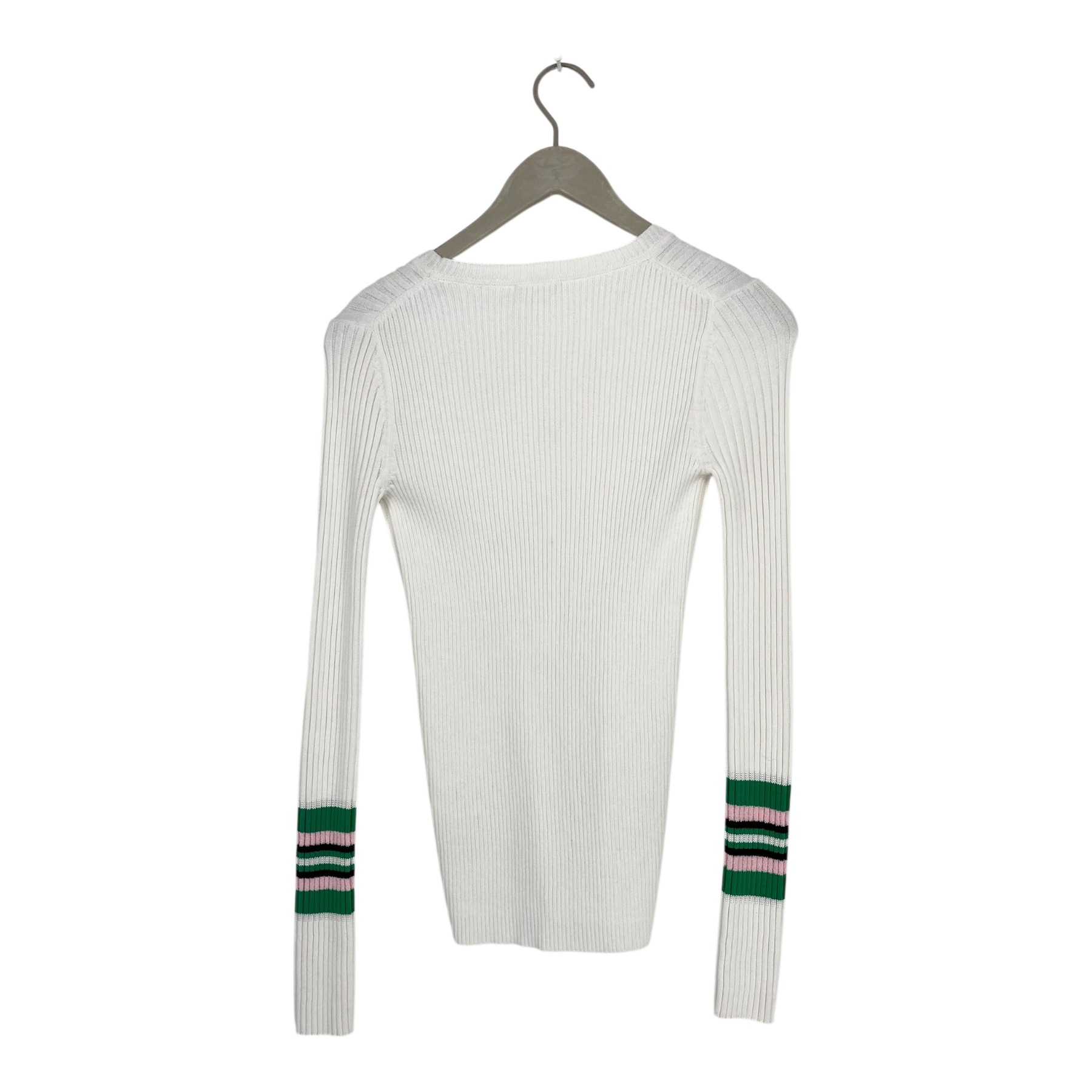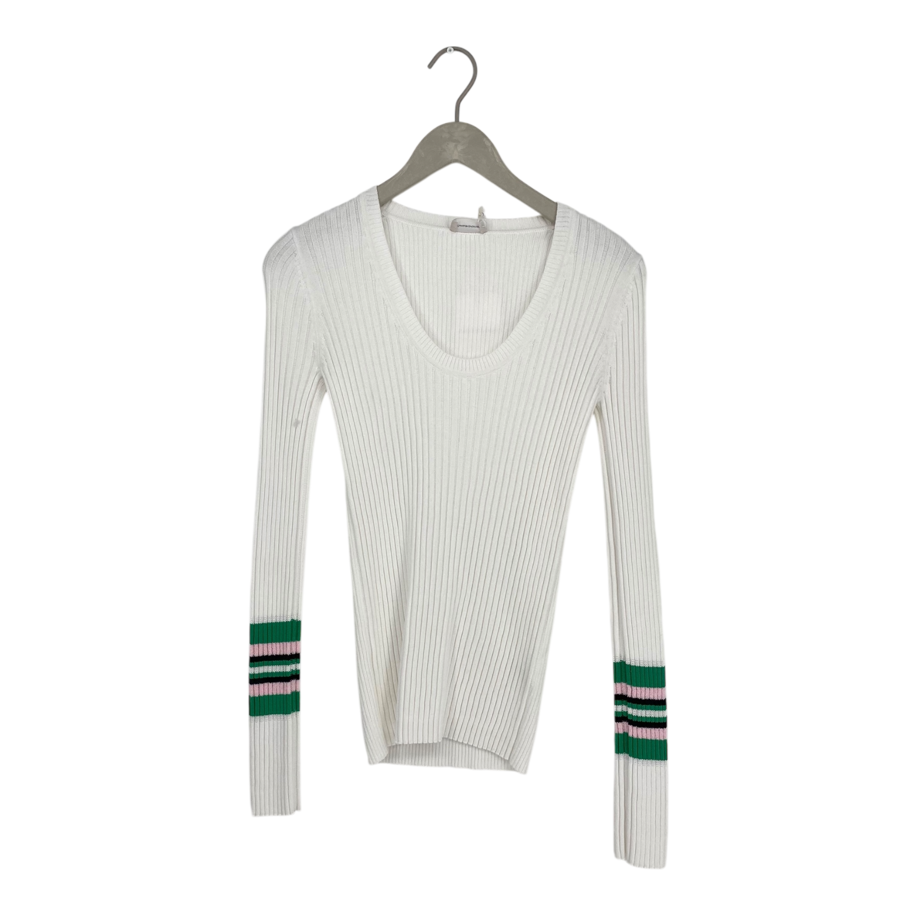 By Malene Birger light knit long sleeve blouse. Green, pink, white and black stripe details on the sleeves.