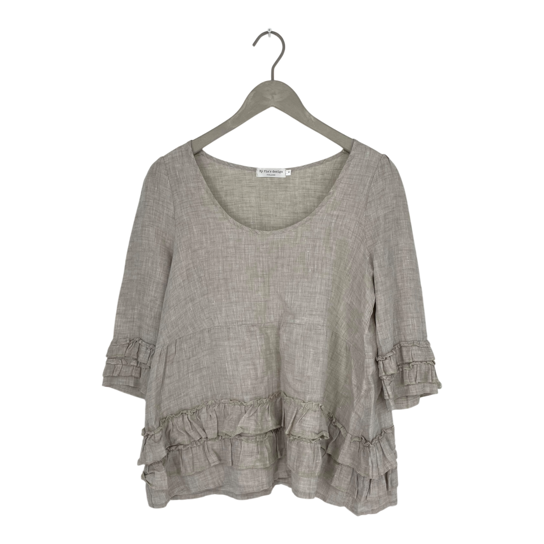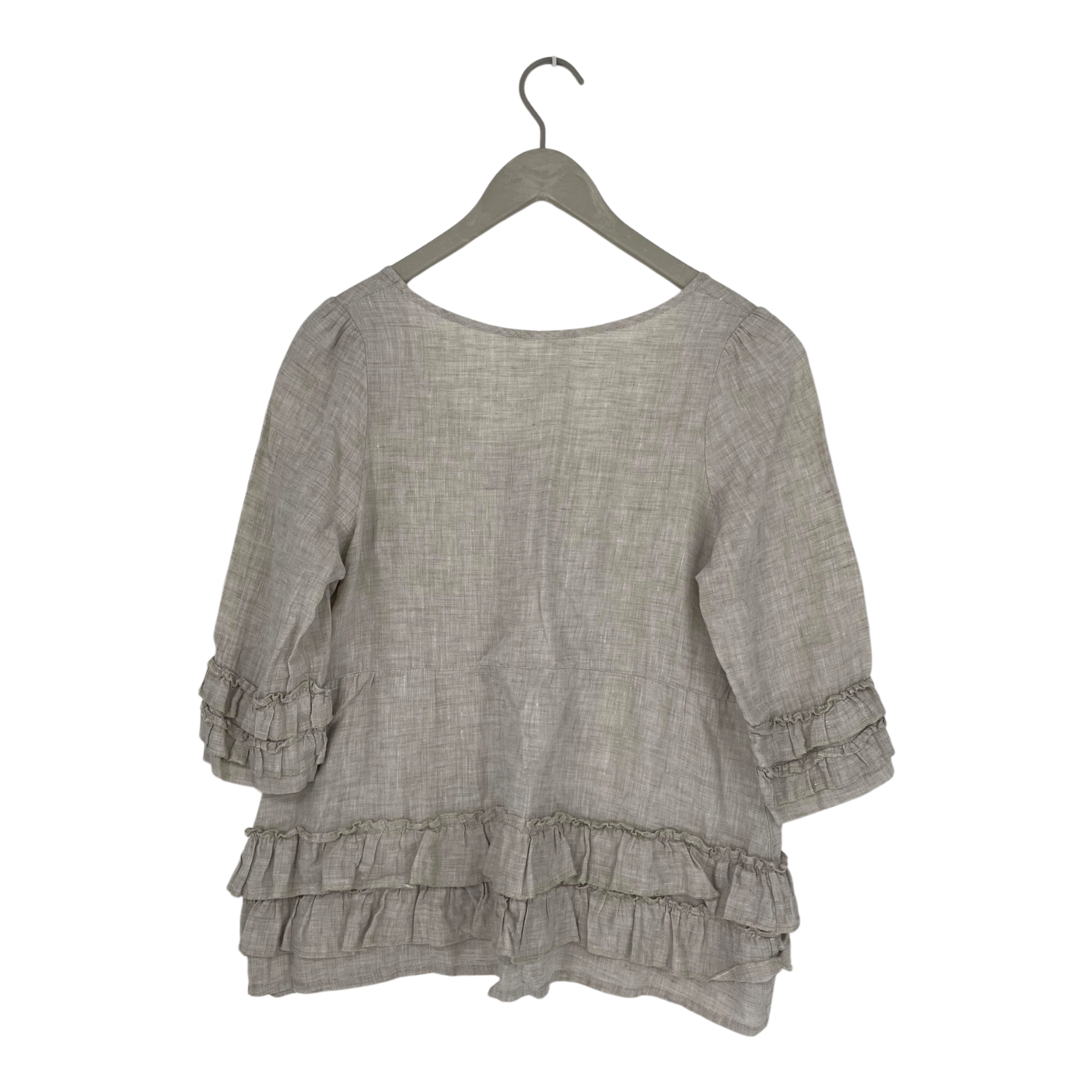 Bypias linen shirt with 1/2 sleeves and frill details on the sleeves and hemline.