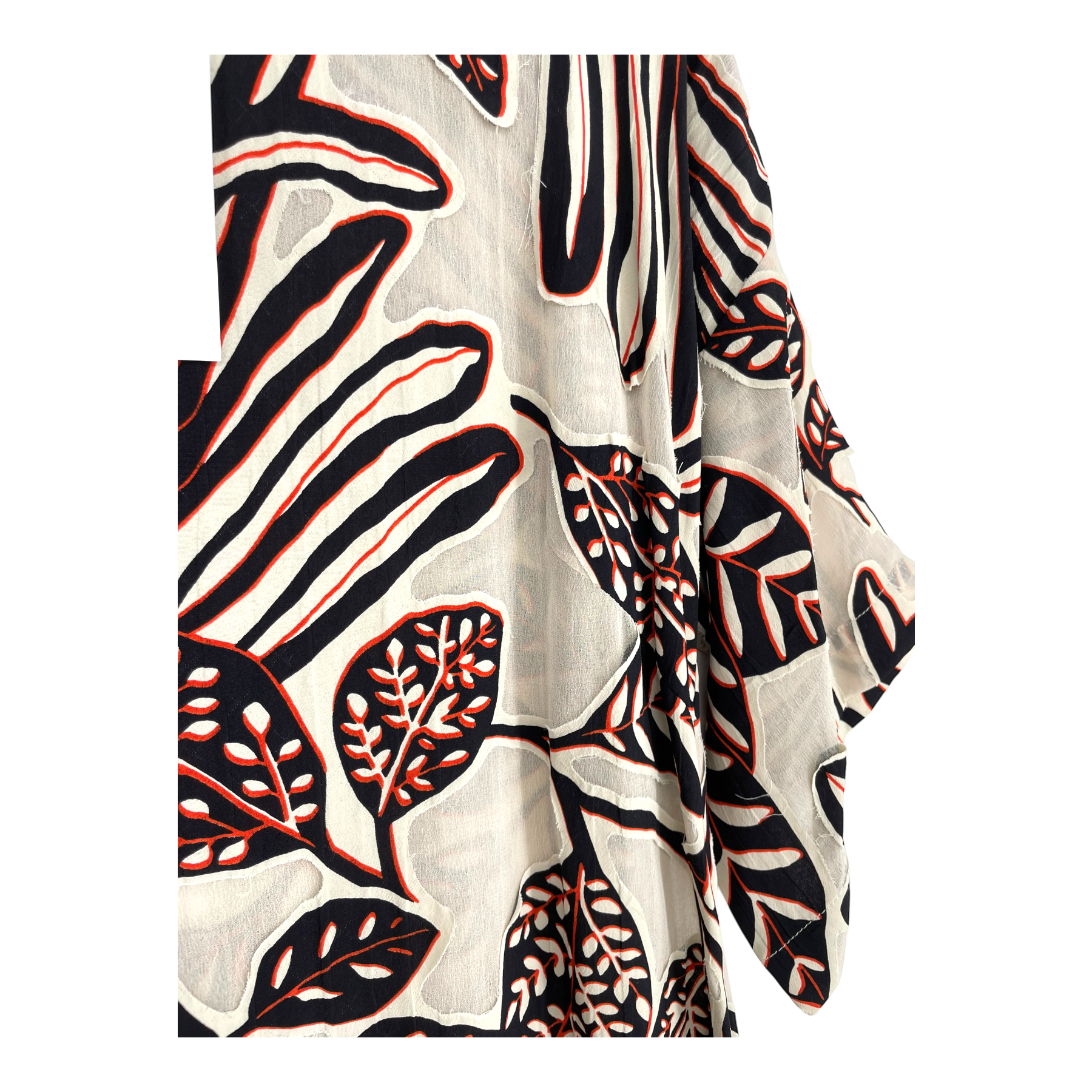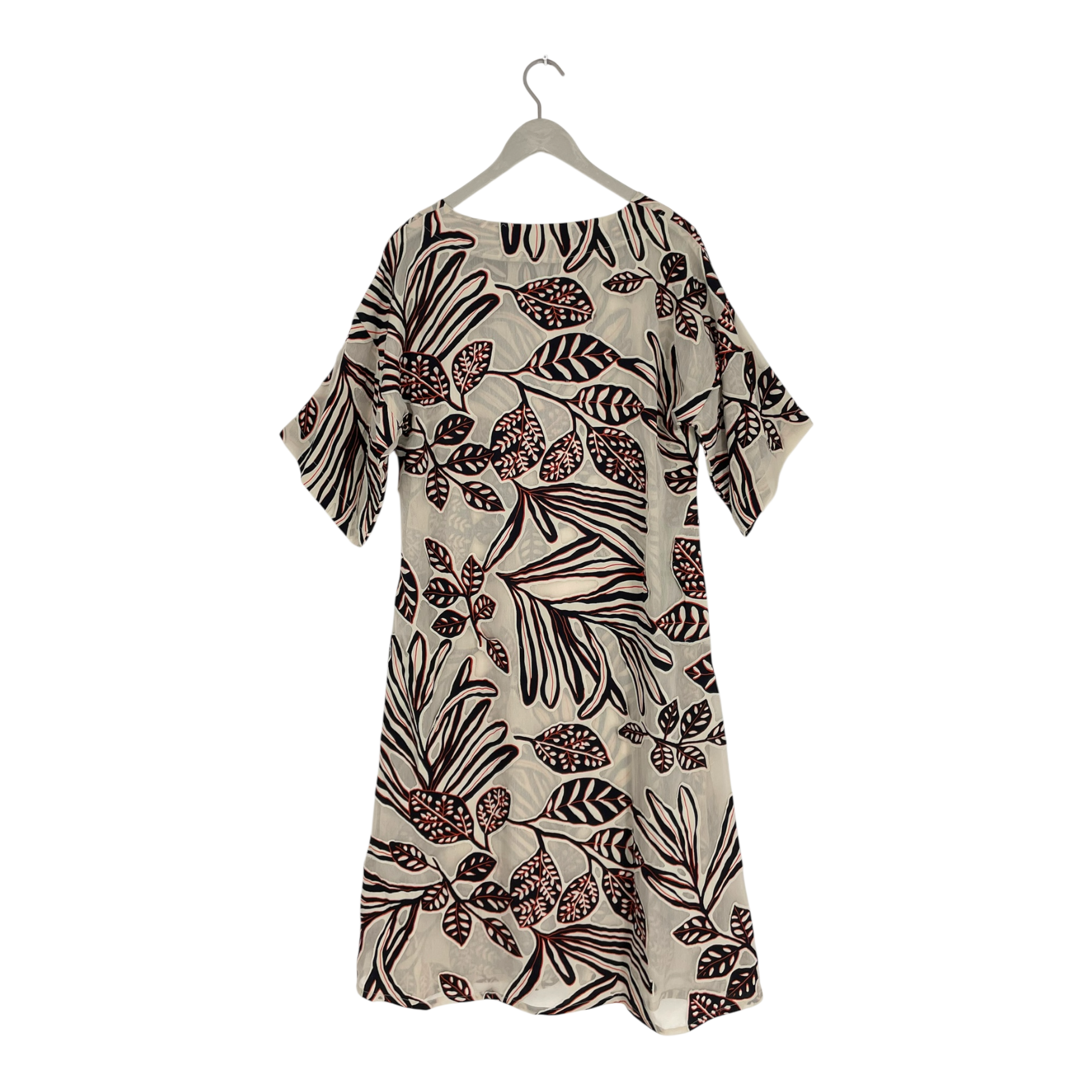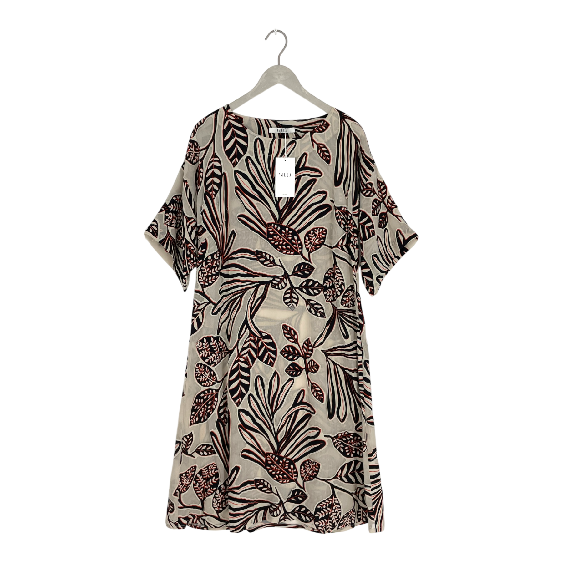 Falla Finland Tuokio Dress features a bold, printed fabric. The material is slightly sheer, and the print is stitched onto the fabric, with intentionally frayed edges for a unique, textured look. The dress has short sleeves and a round neckline.