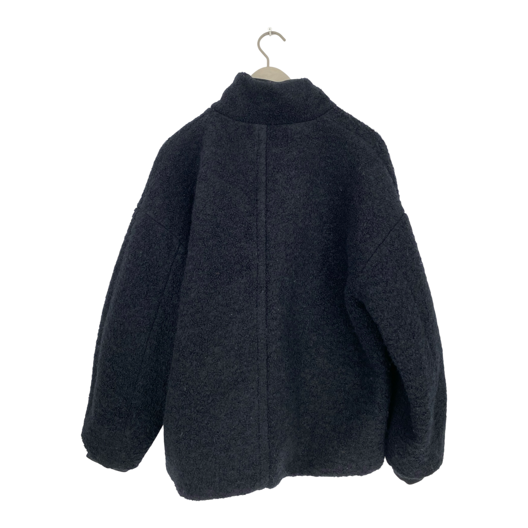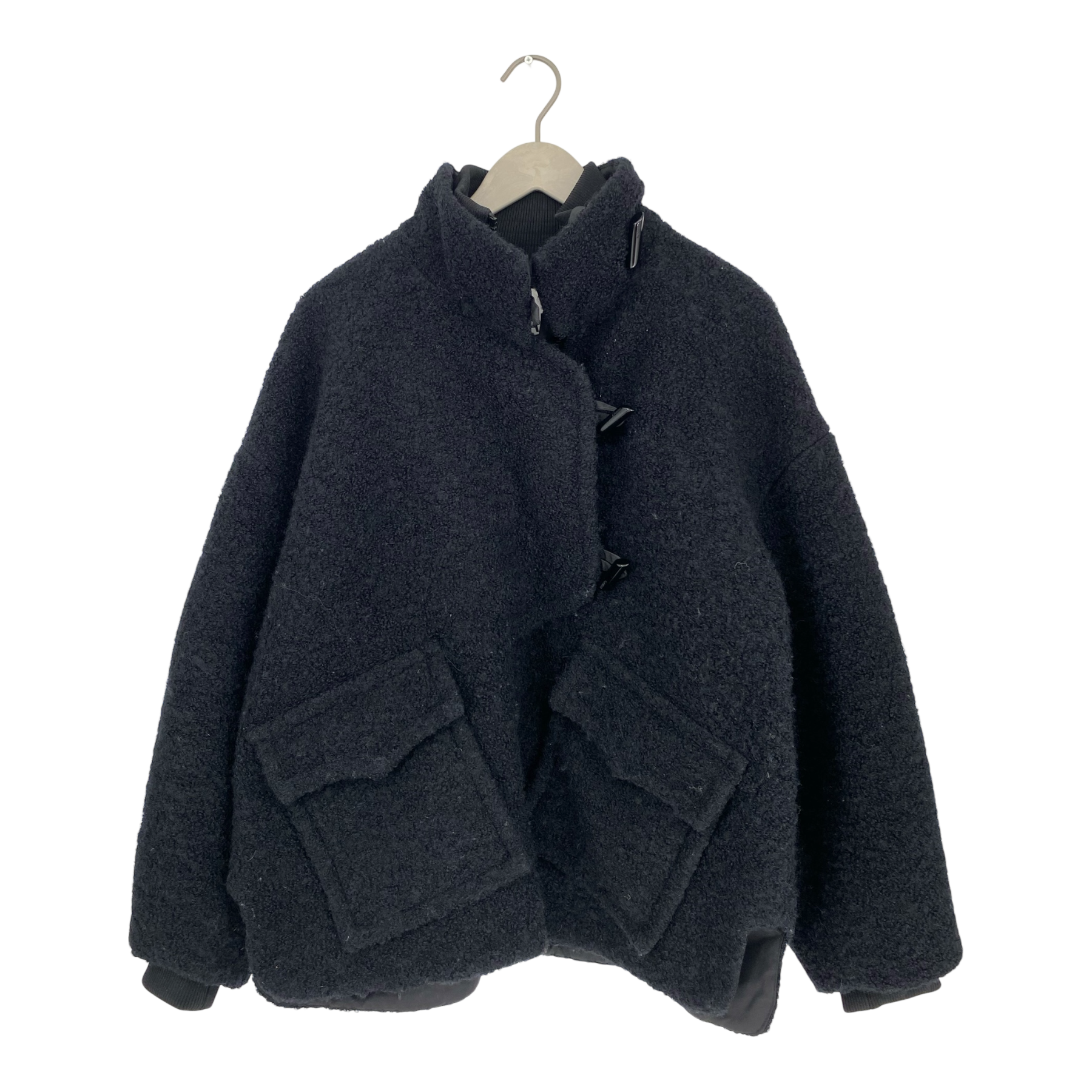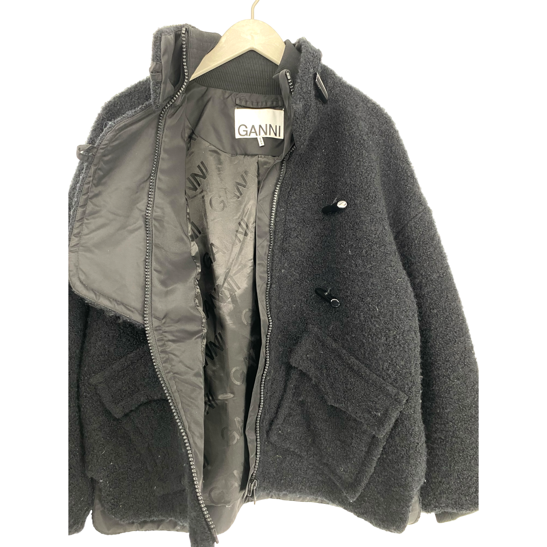 Ganni women's oversized jacket in boucle wool features a mock-turtleneck, patch pockets, dropped shoulders, and curved cocoon-style sleeves. The fabric is a bit fluffed.