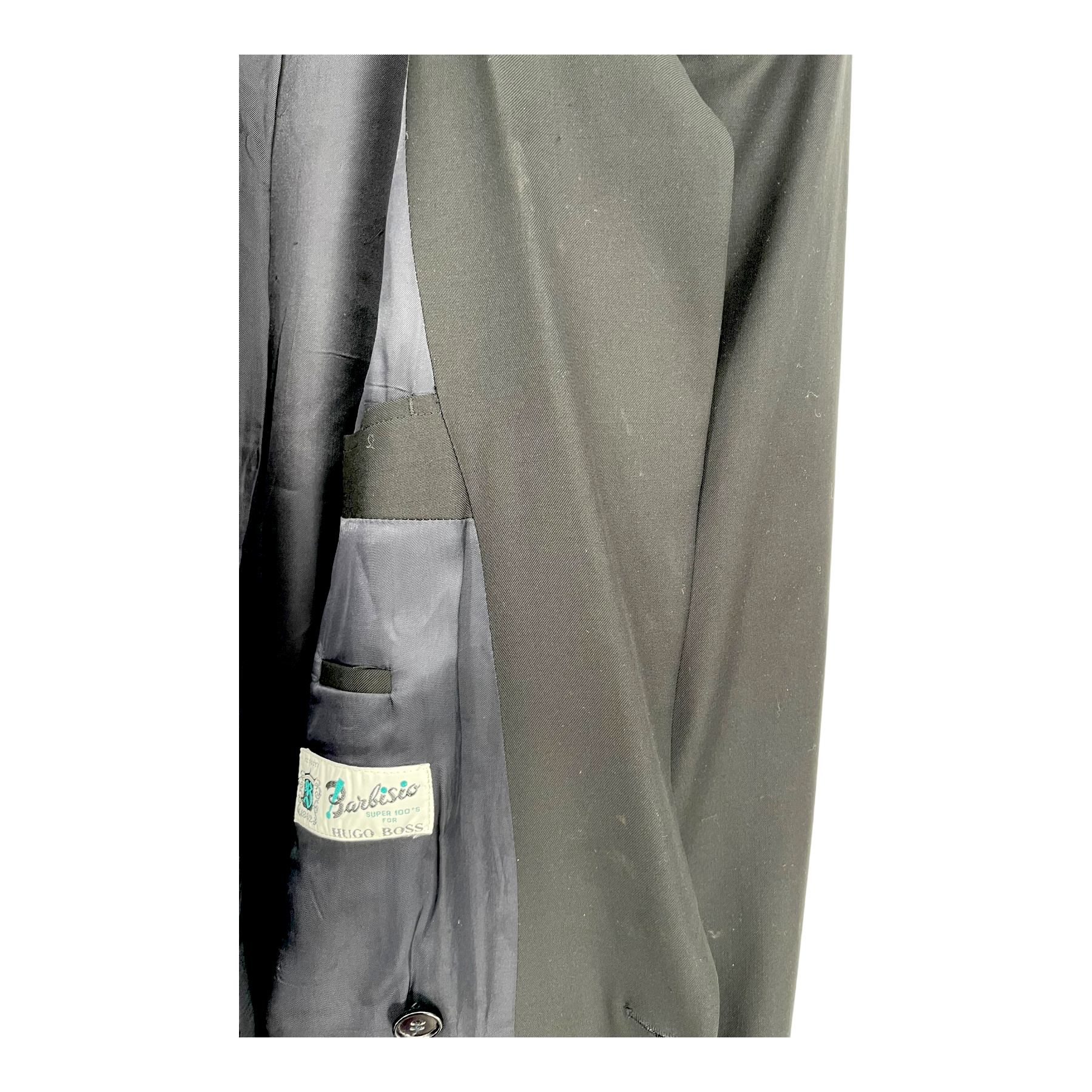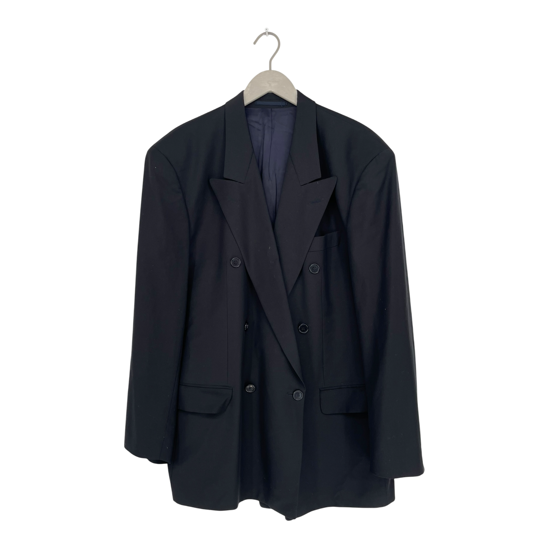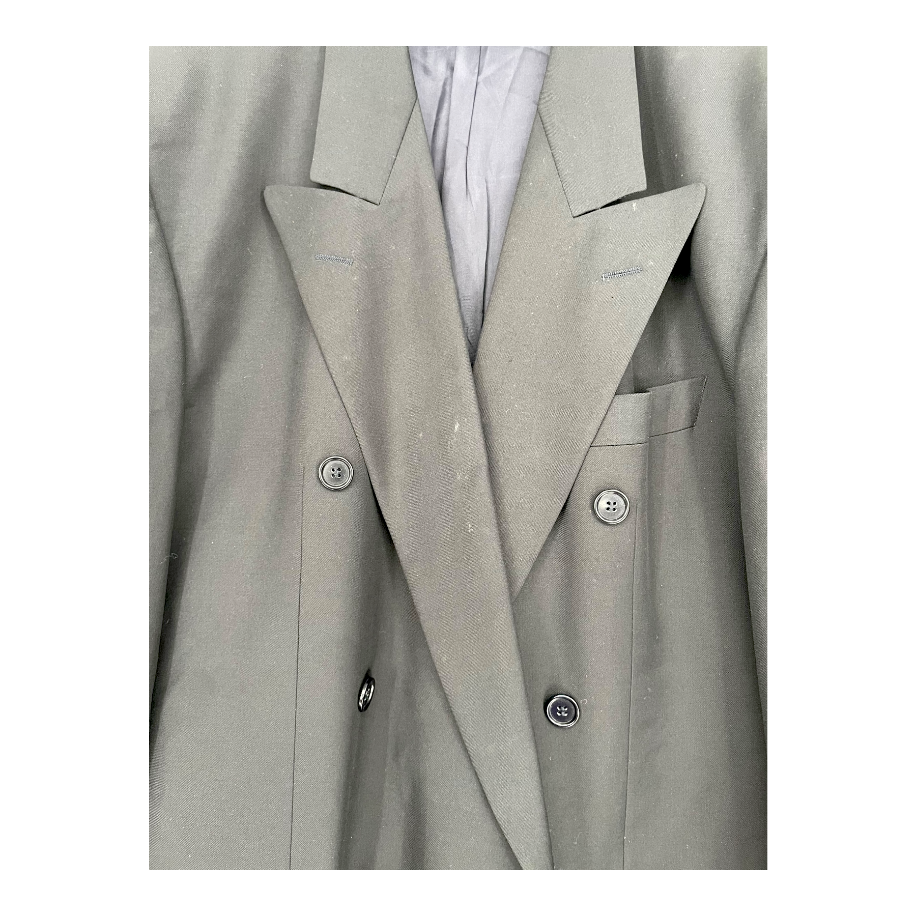 Hugo Boss mens vintage double breasted Al Capone/ Palermo jacket with large lapels, two front pockets, one chest pocket, two inner pockets and shoulder pads. There is signs of wear on the surface of the fabric as well as a few stains. The sizing most likely corresponds to mens size 2 XL.
