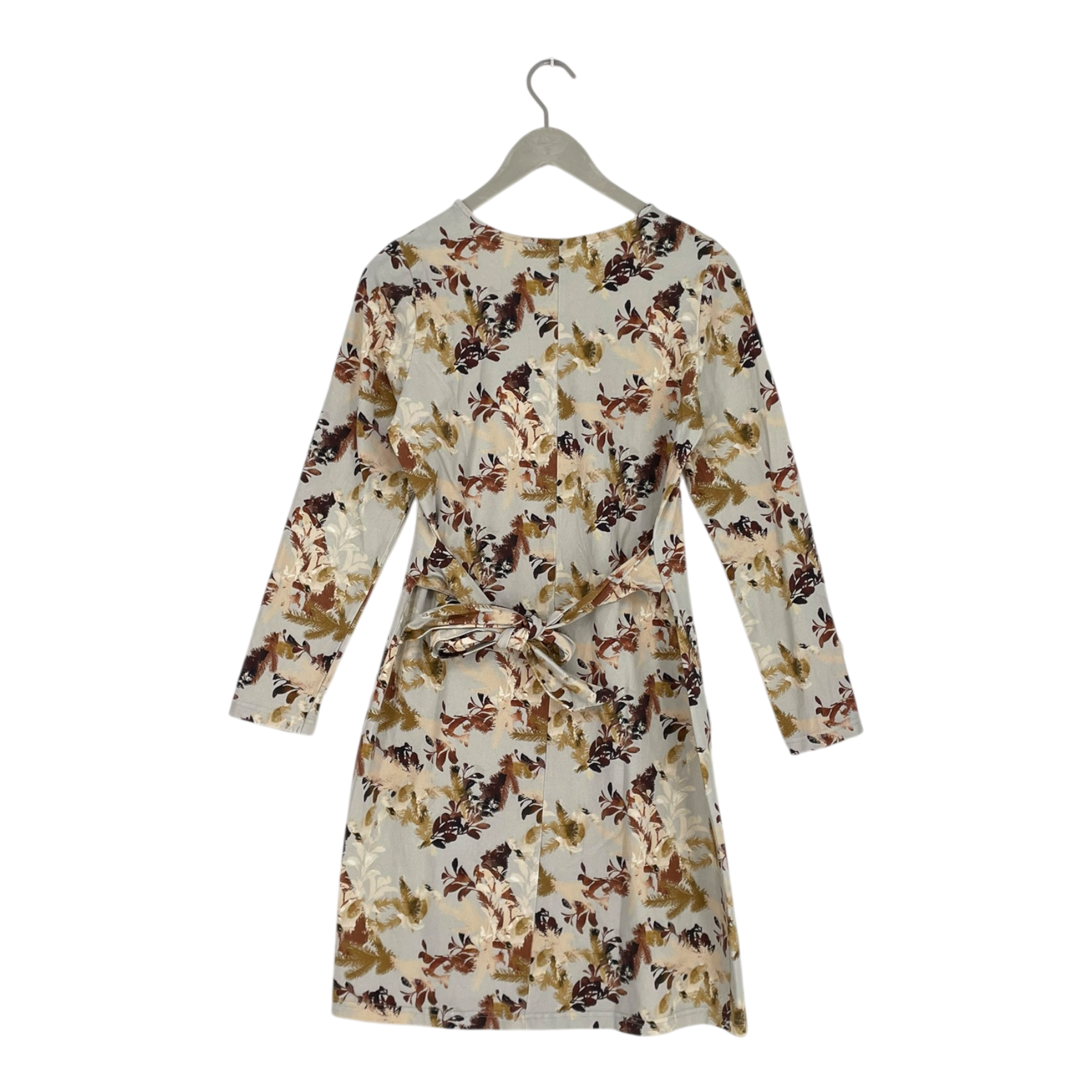 Kaiko belted dress has a slim, figure-hugging fit. Wide ribbons at the waist can be tied at the front or back. The dress has a rounded neckline, and the hem reaches down approximately to the knees.