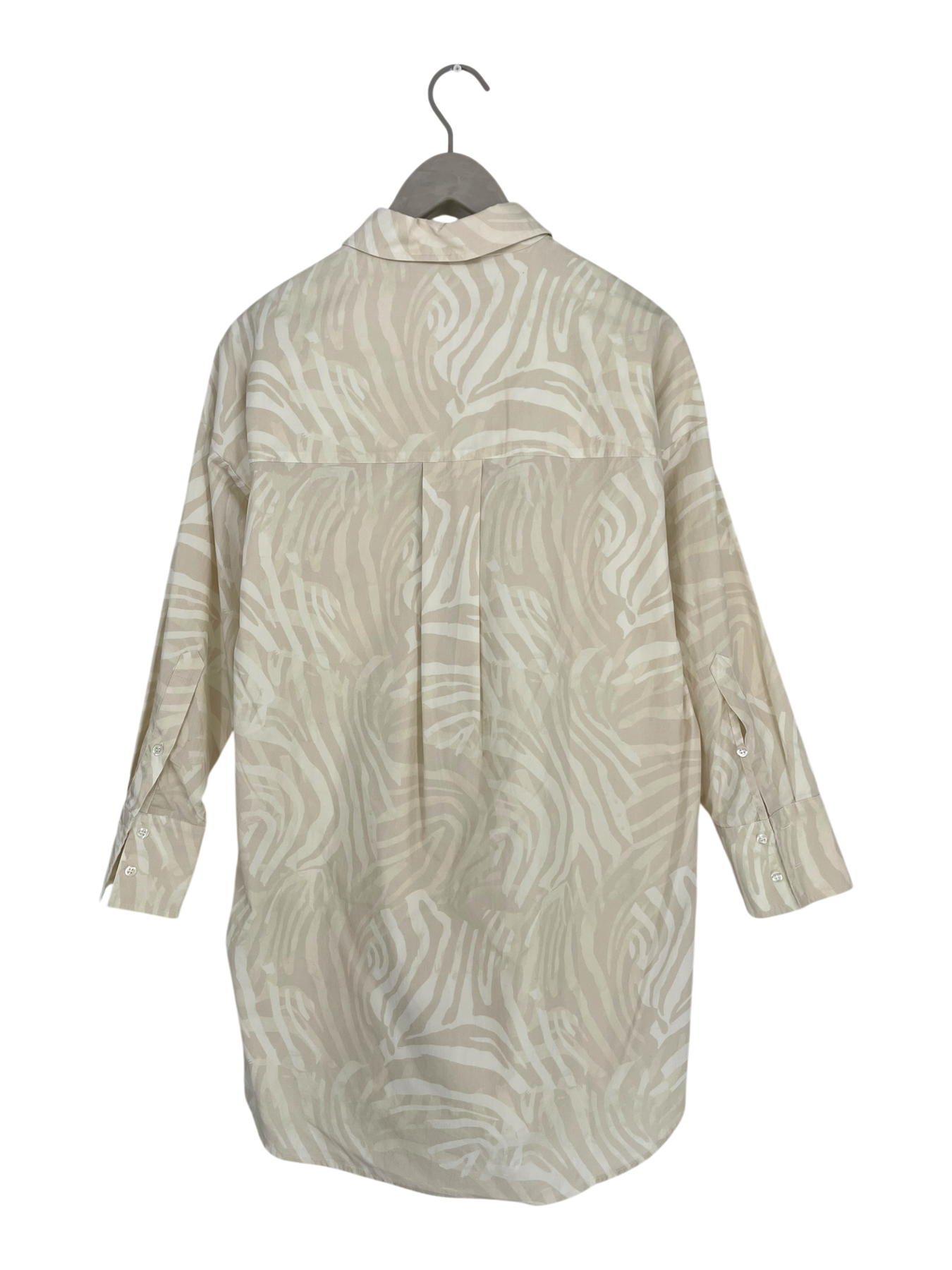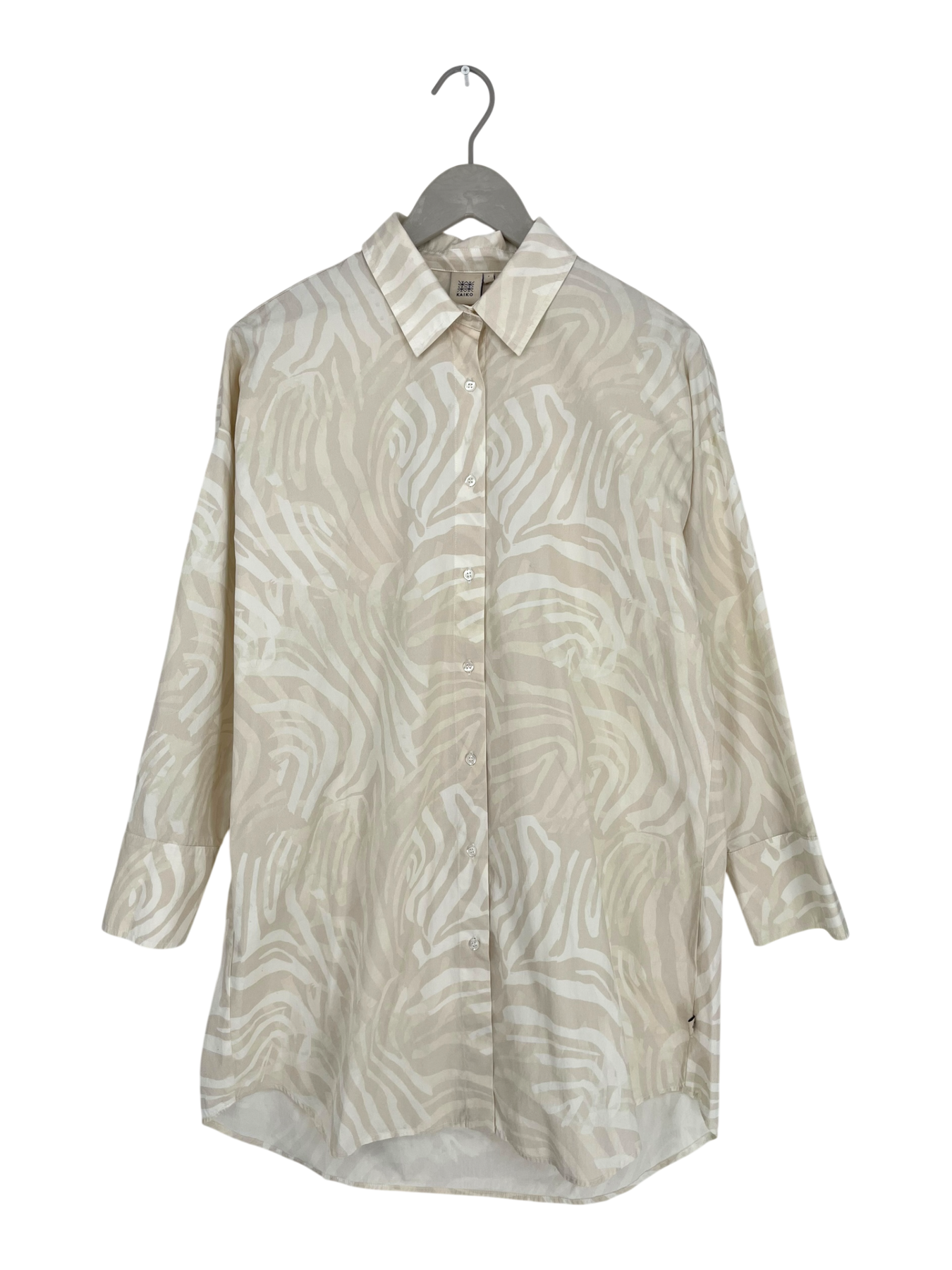 Kaiko long shirt in off-white Zebra print. This dress style shirt has collar, sleeves with buttoned cuffs and button down closure.