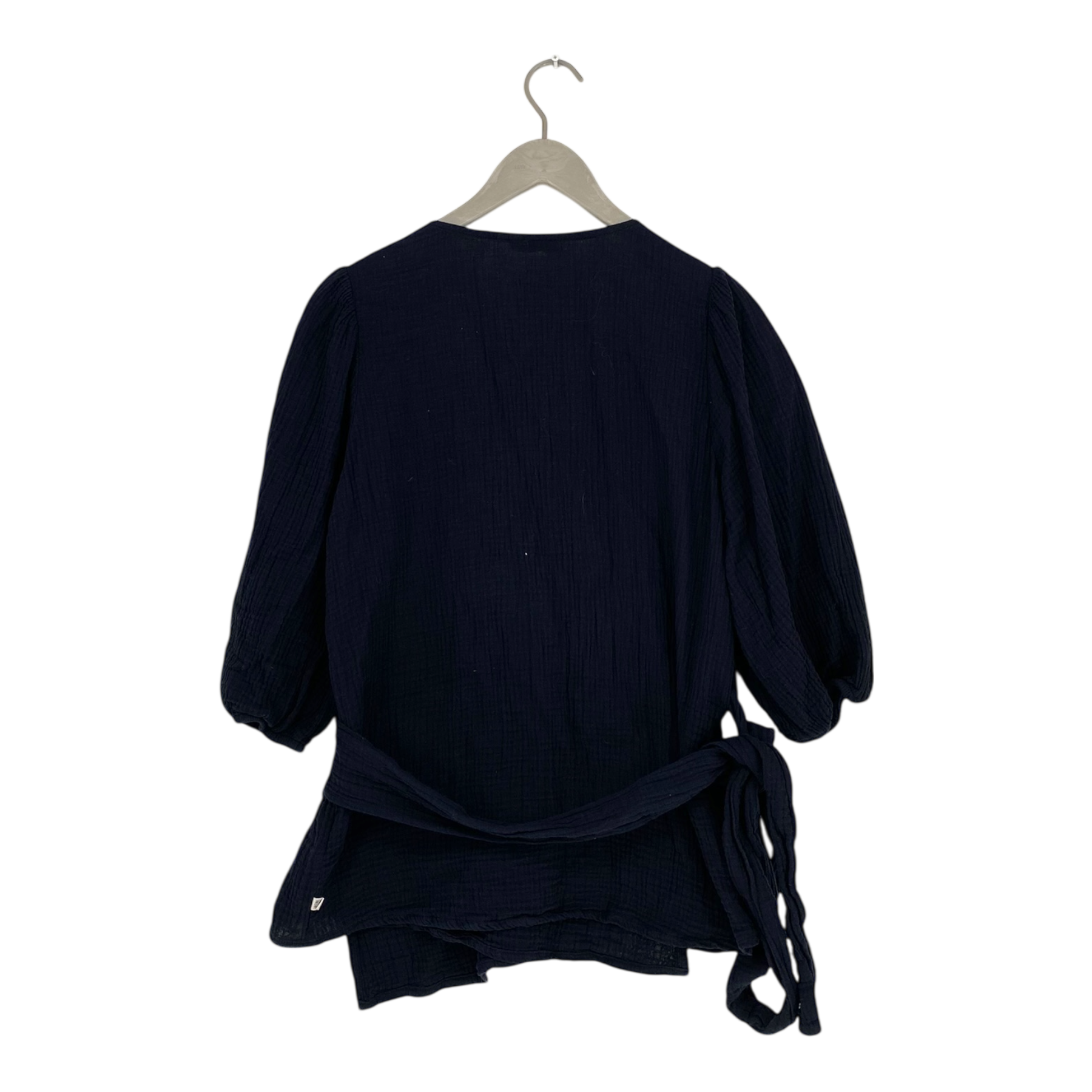 Kaiko wrap blouse has loose half-length balloon-sleeves and ties at the waist with long straps. The cuffs are elasticated, and gathering at the shoulders creates additional volume to the sleeves. Kaiko wrap blouse is made from woven organic cotton muslin with a lively texture.