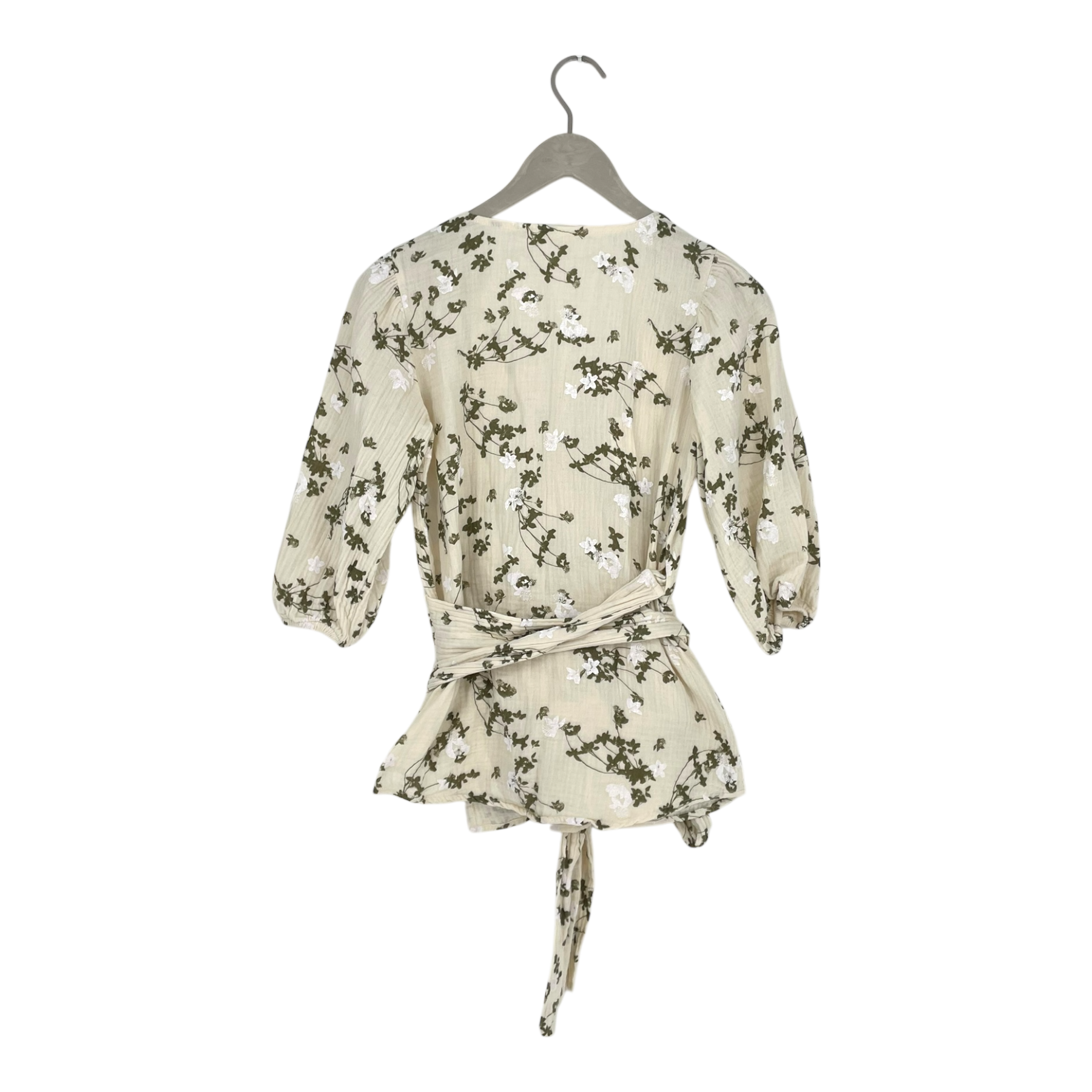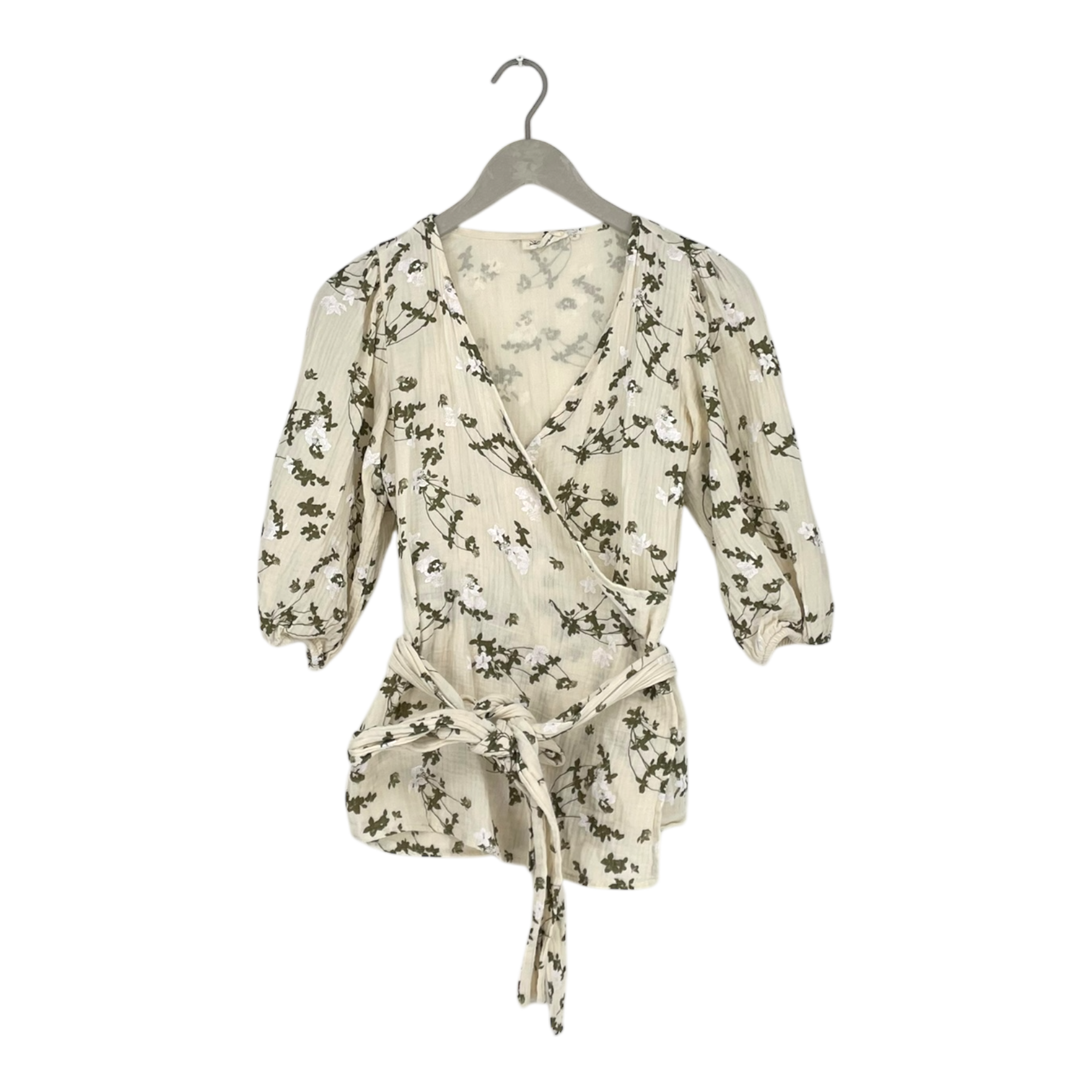 Kaiko wrap blouse has loose half-length balloon-sleeves and ties at the waist with long straps. The cuffs are elasticated, and gathering at the shoulders creates additional volume to the sleeves. Kaiko wrap blouse is made from woven organic cotton muslin with a lively texture.