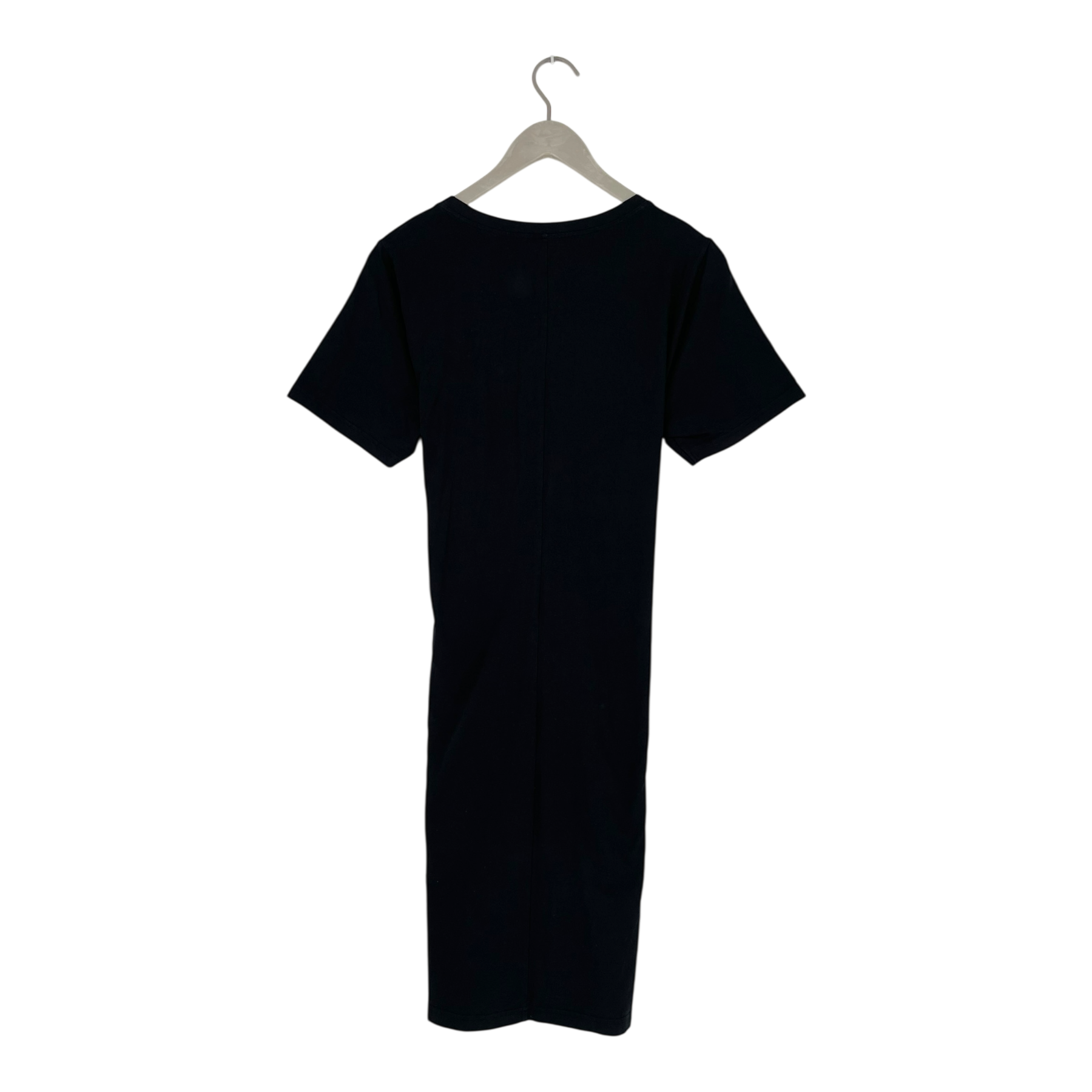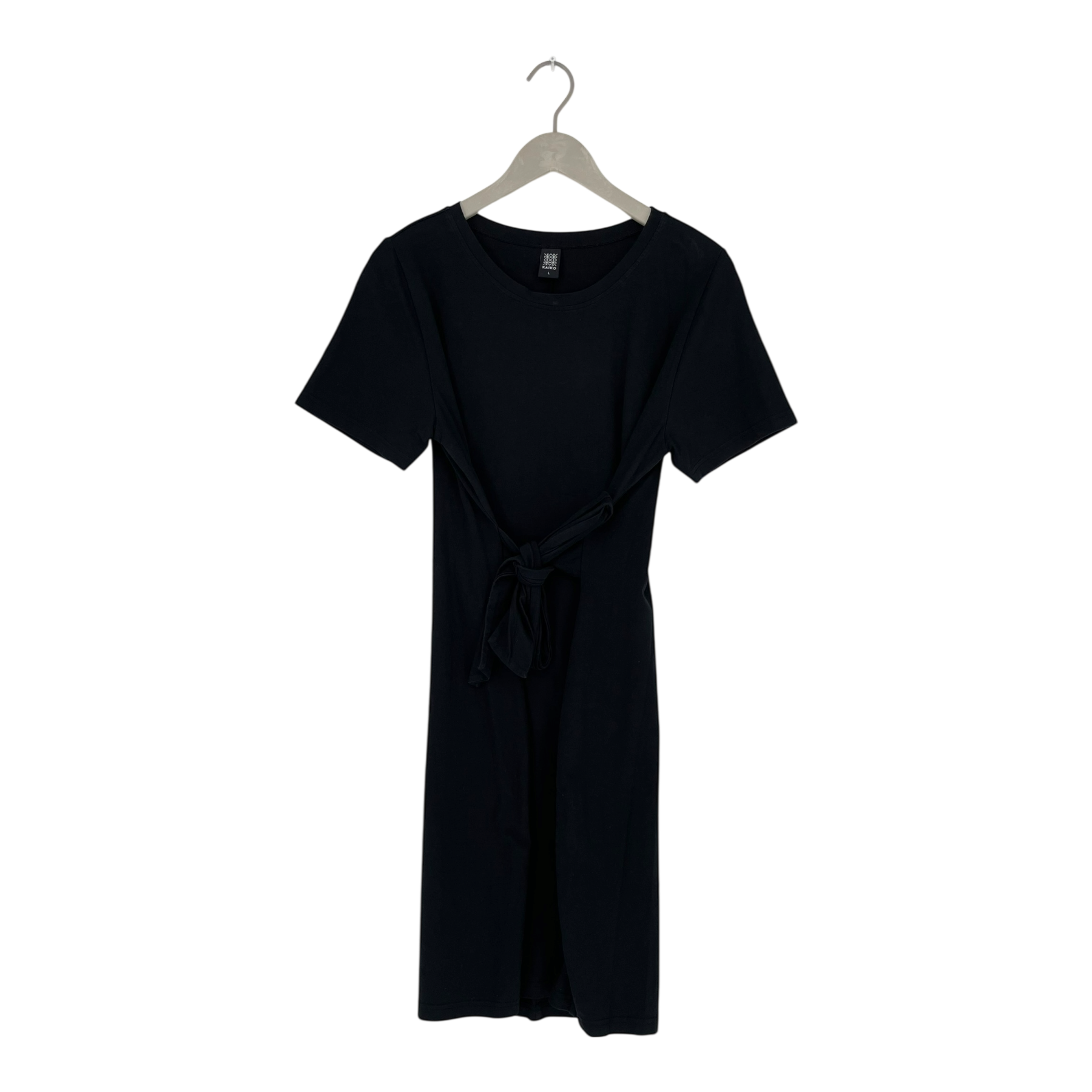 Kaiko belted dress has a slim, figure-hugging fit. Wide ribbons at the waist can be tied at the front or back. The dress has a rounded neckline, and the hem reaches down approximately to the knees.