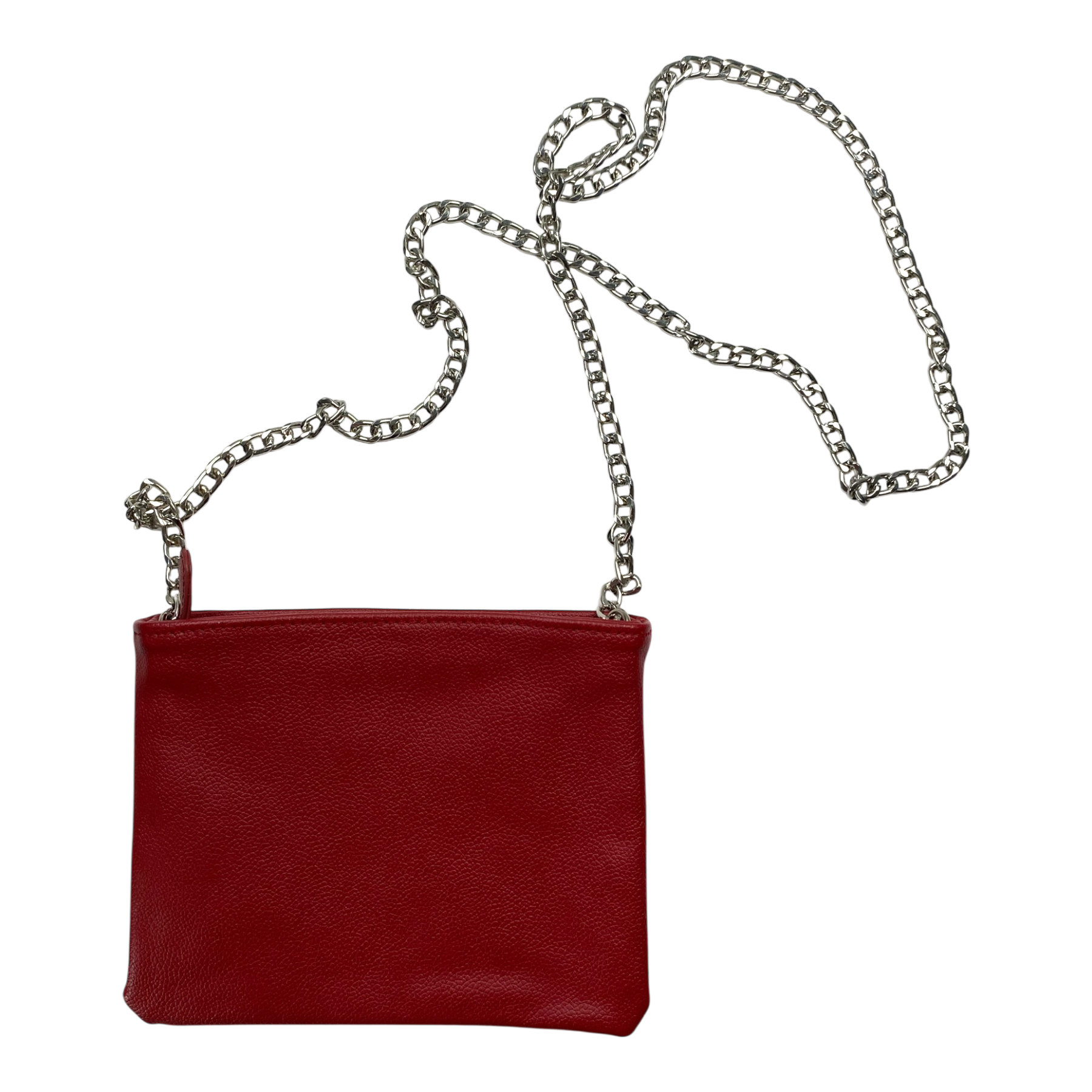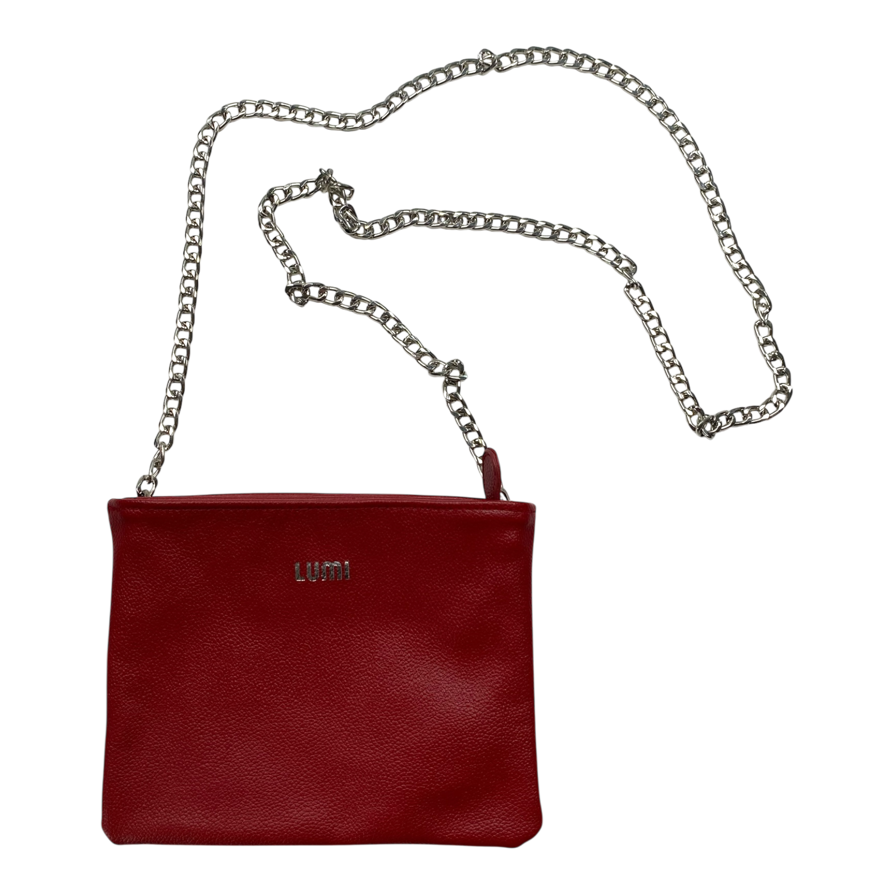 Lumi crossbody bag is made out of full grain leather with a cotton lining and silver colored metal hardware. The bag has zipper closure and one main compartment with a smaller, zippered compartment inside. The metal chain strap cannot be adjusted, 60cm of wearable length.