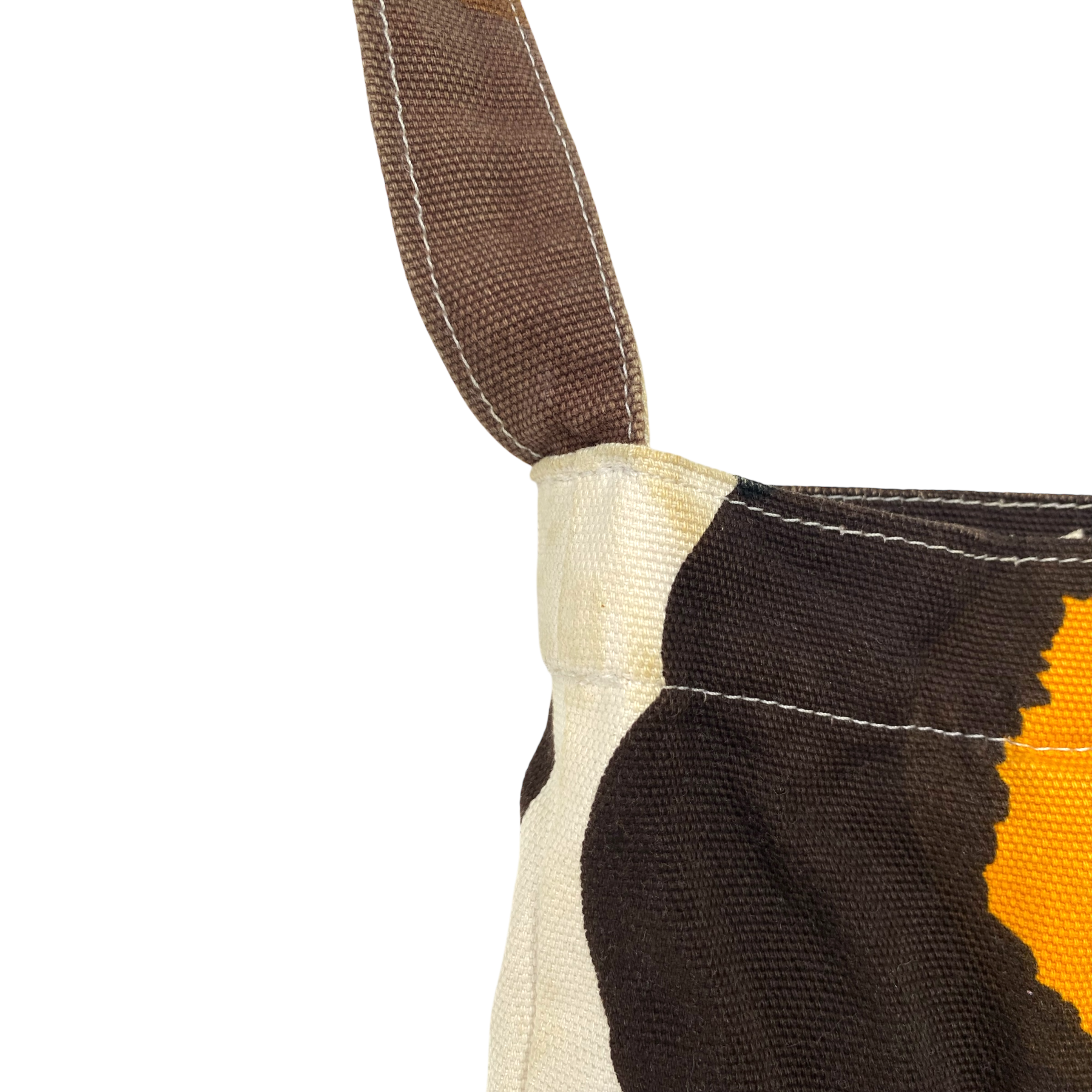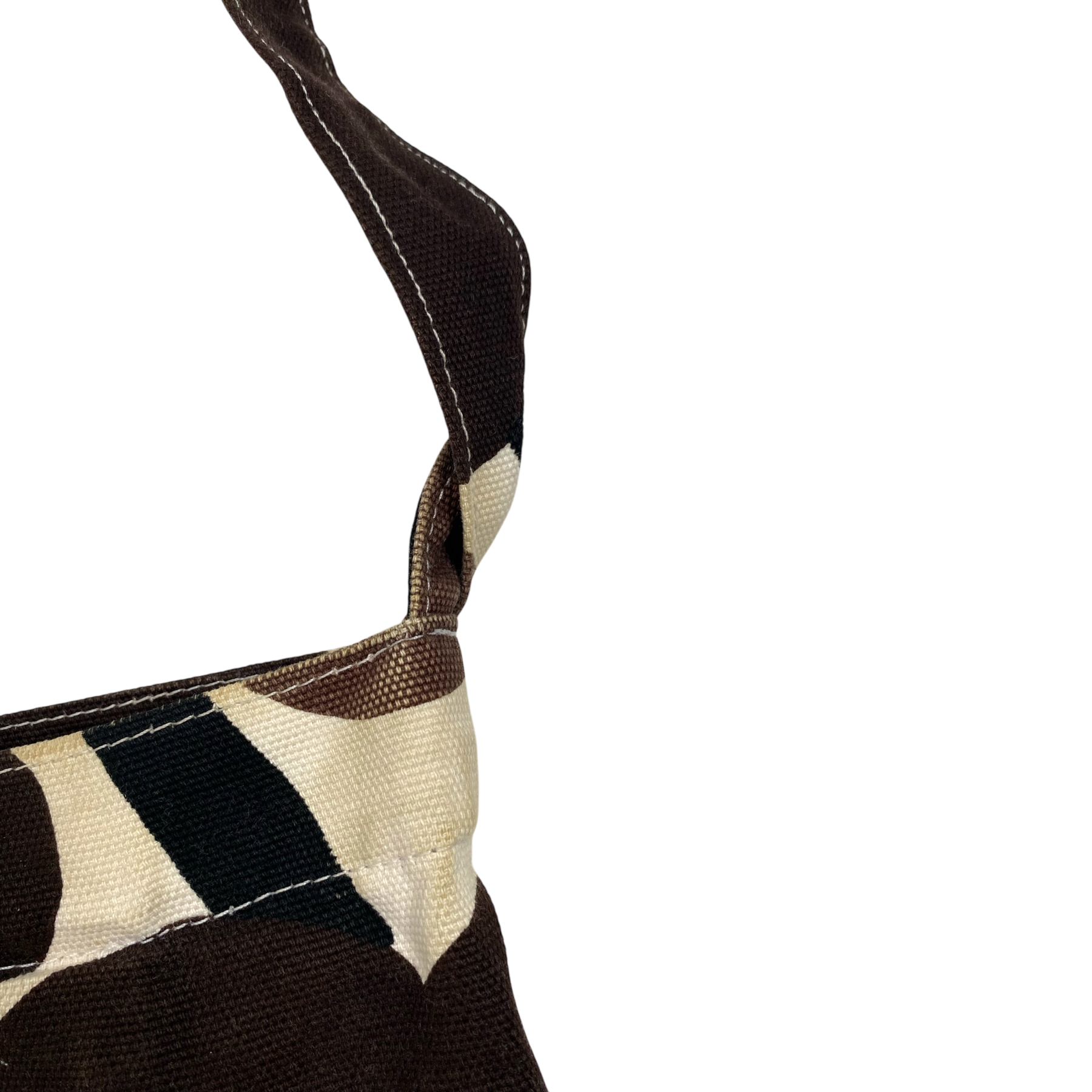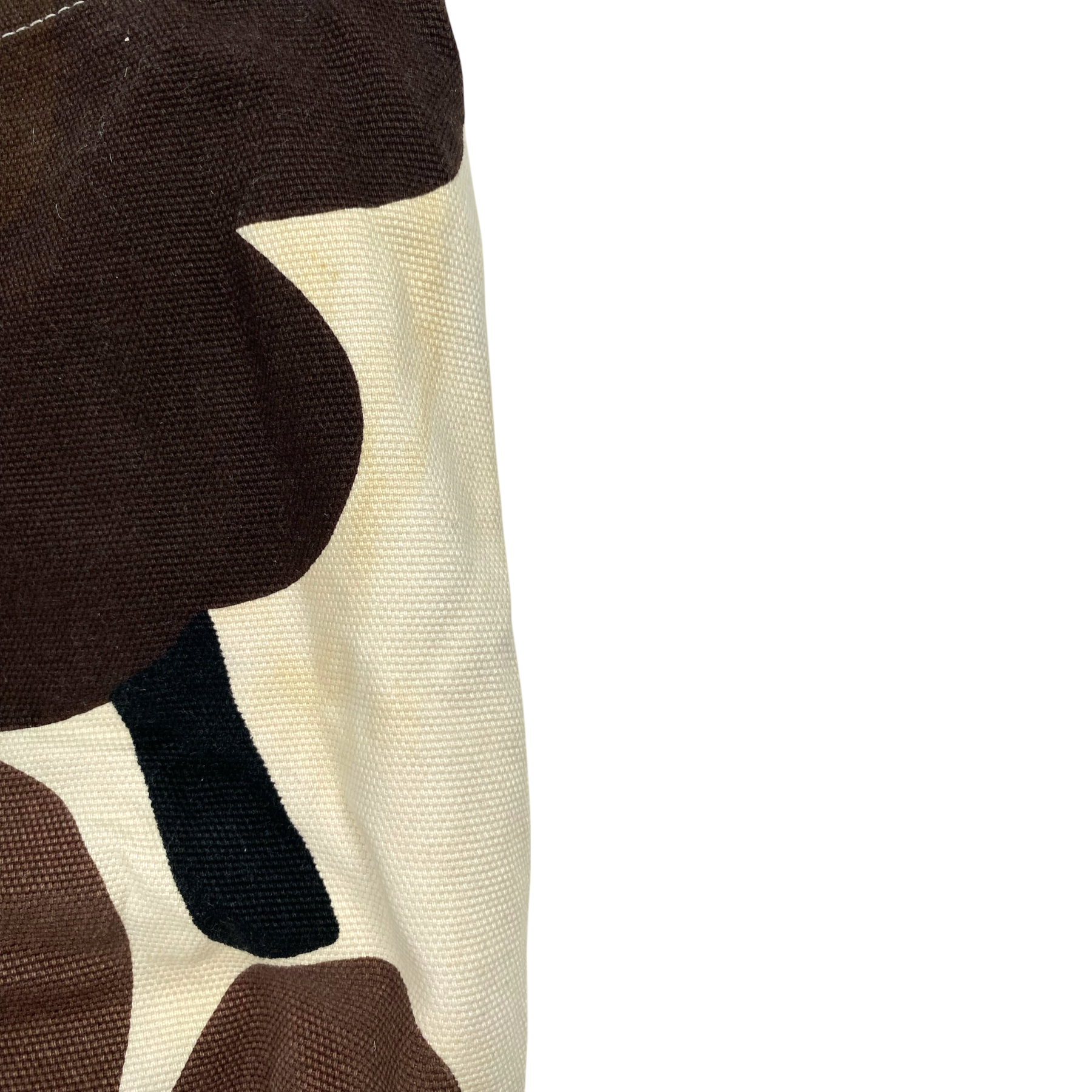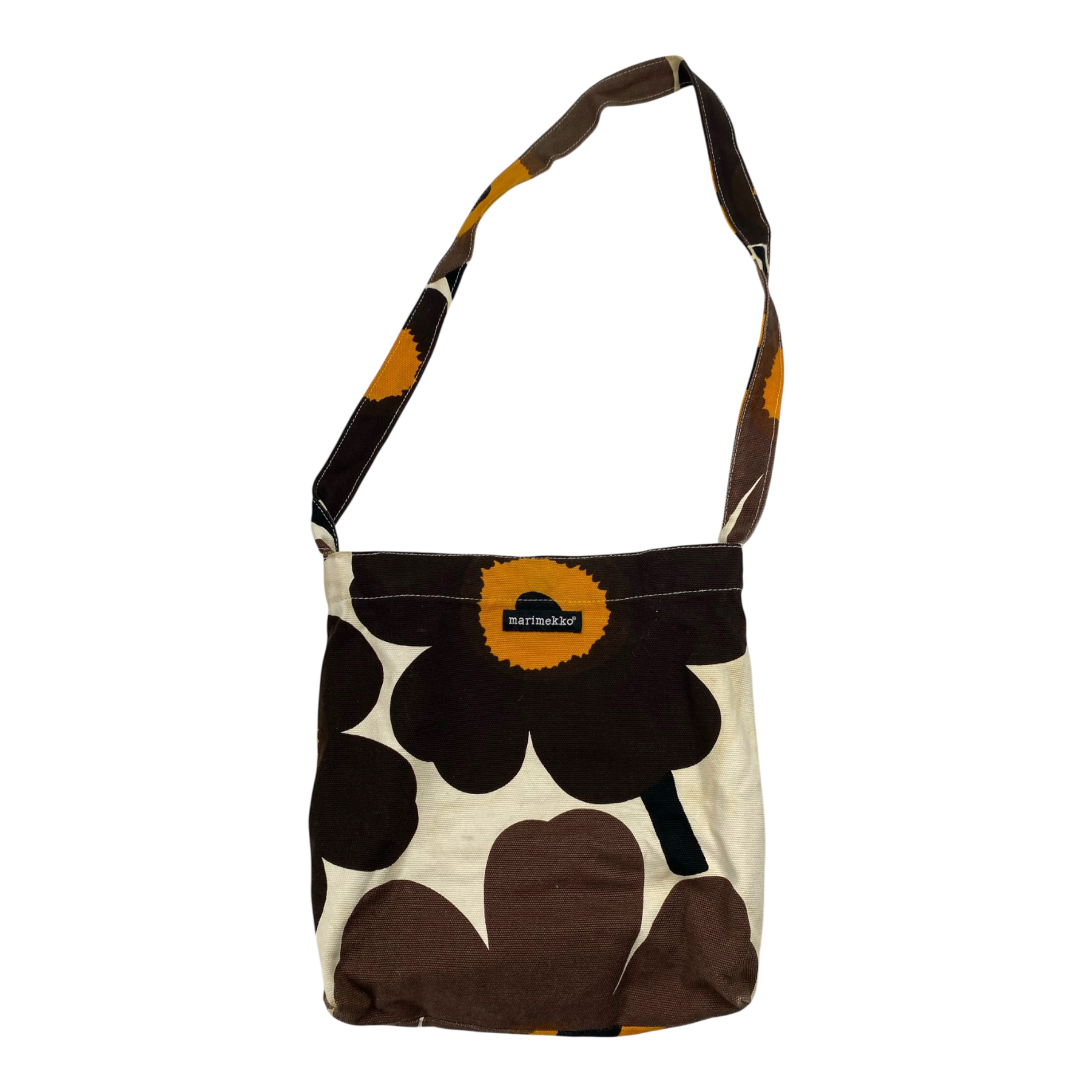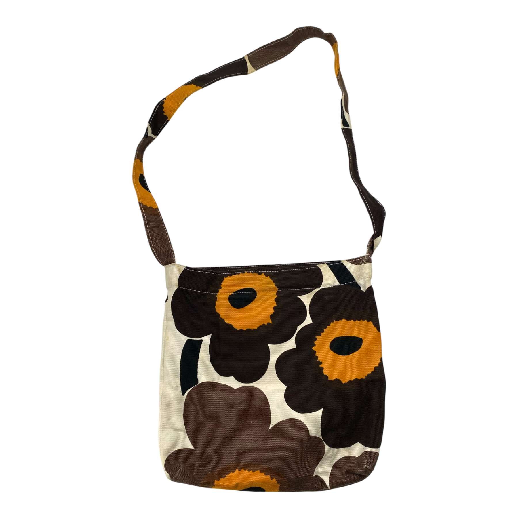 Marimekko canvas shoulder bag with one main pocket and one small pocket inside. The bag can be closed with a magnetic button. The item has some stains and color has faded off.