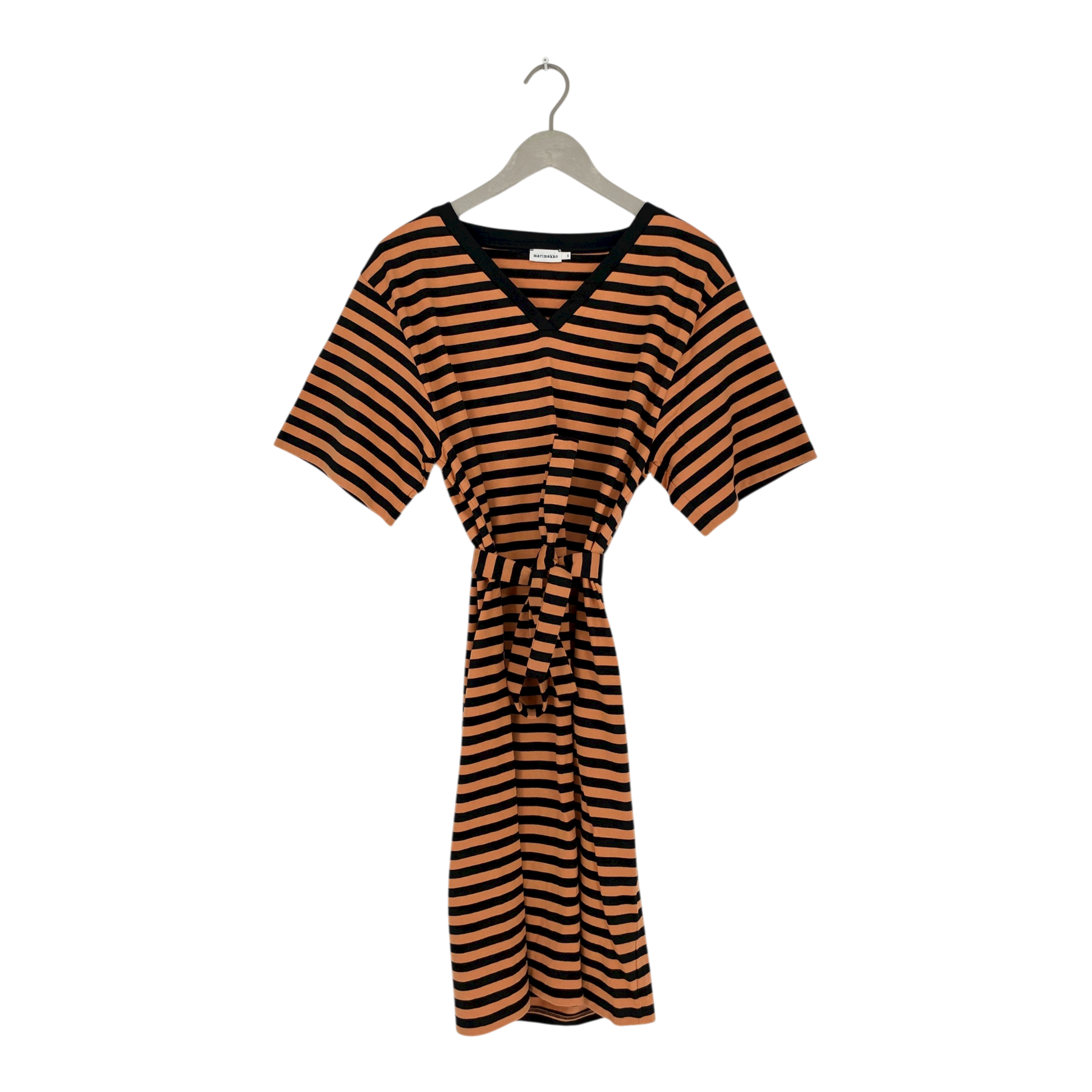 Marimekko Kalliomarne dress with V-neck and a detachable fabric belt. The size most likely fits size S as well as XS.