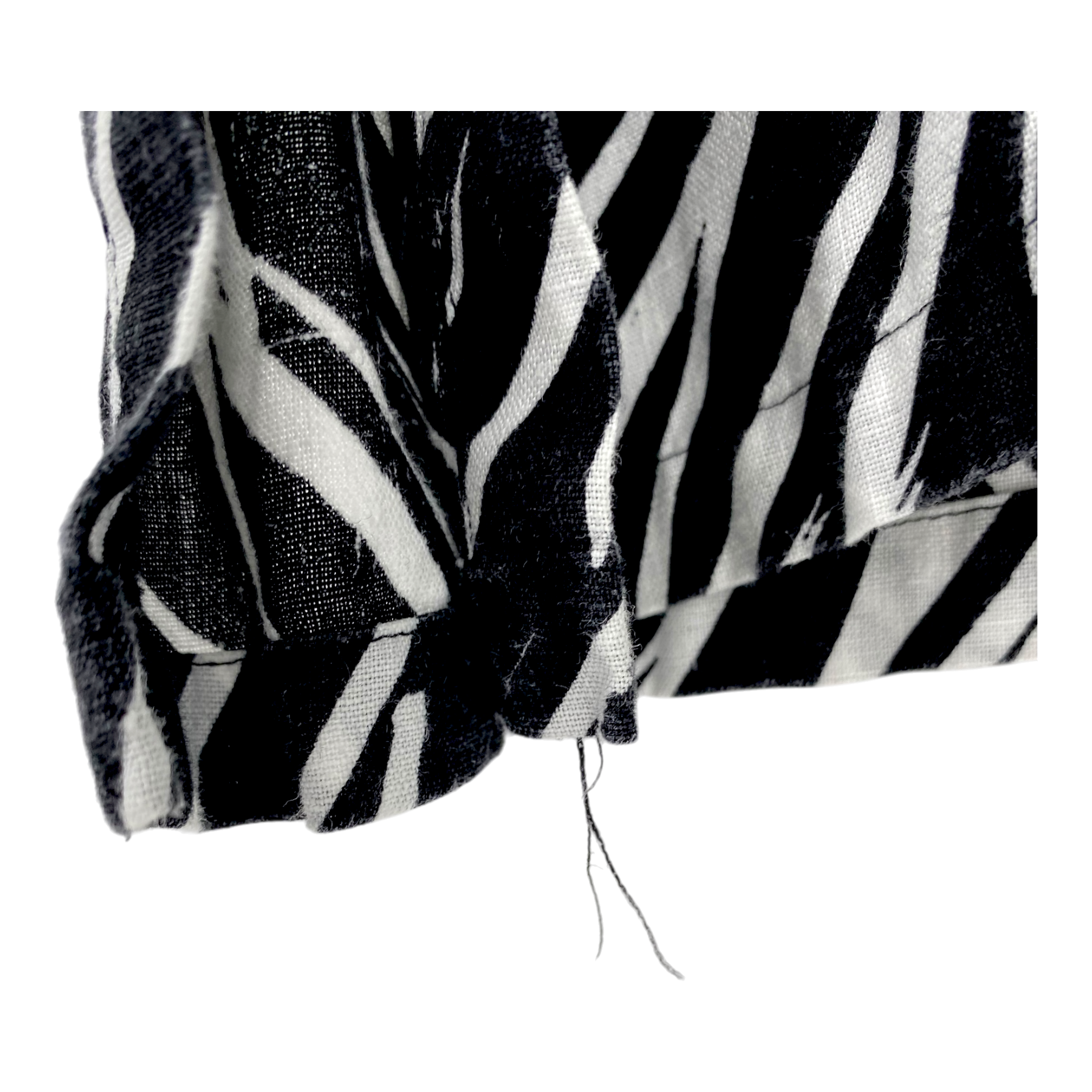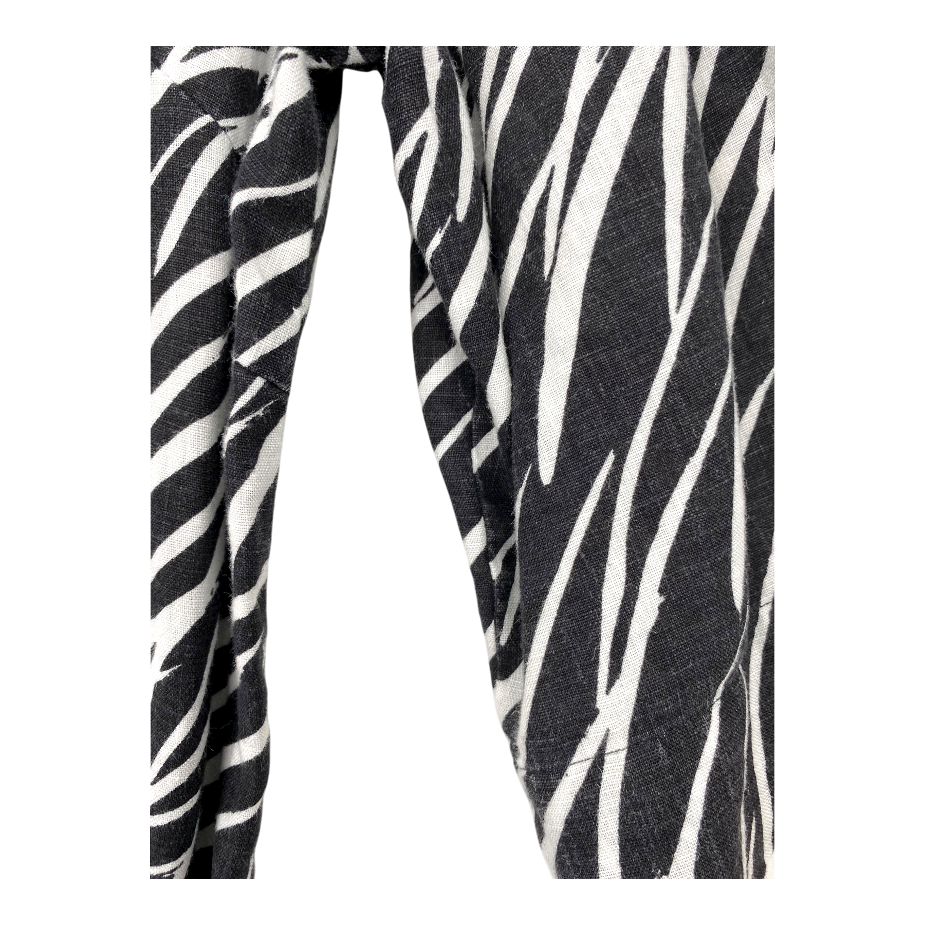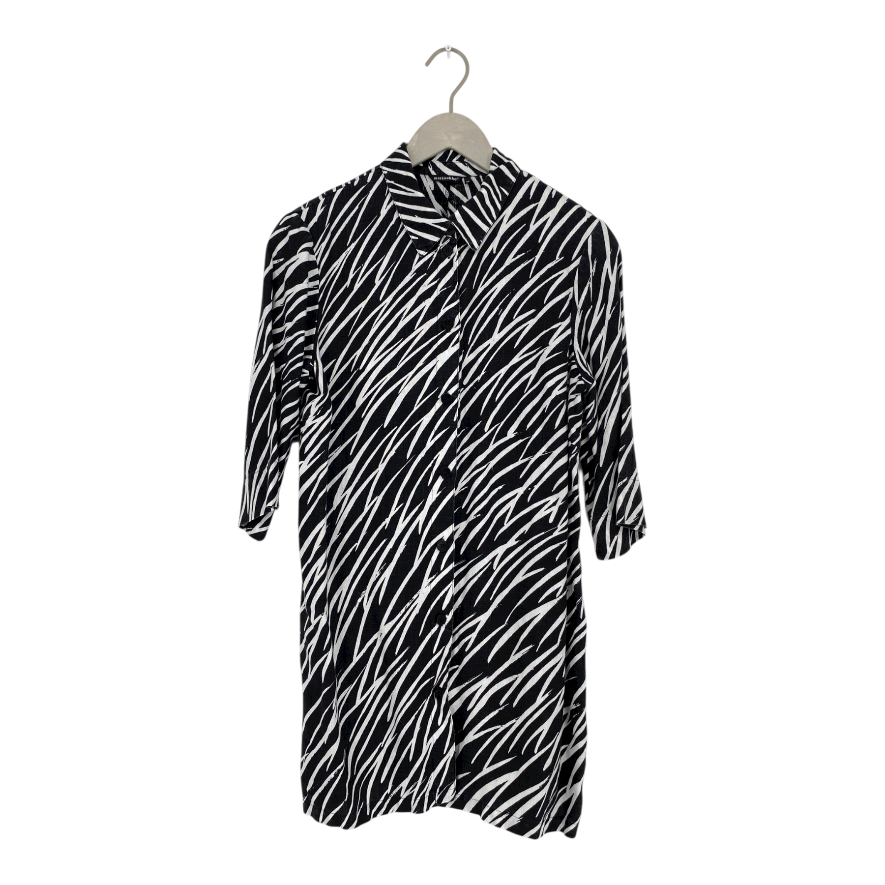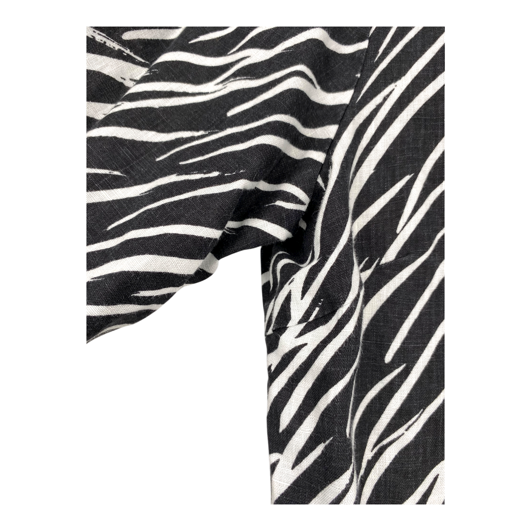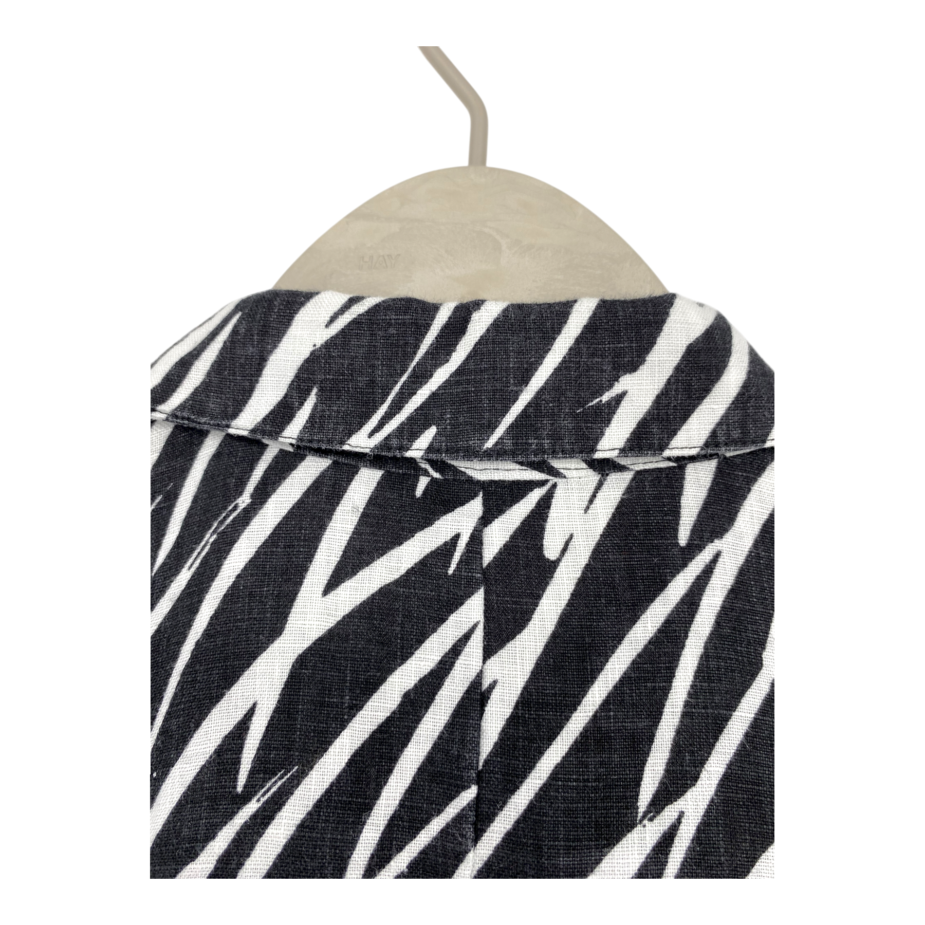 Marimekko linen buttoned dress with half sleeves and a collar in the black and white Taiga print. Spare button included in the laundry tag. The item has some signs of wear on the surface of the fabric, especially on the collar. These signs of wear are likely from the wash and are hardly noticeable in natural light.