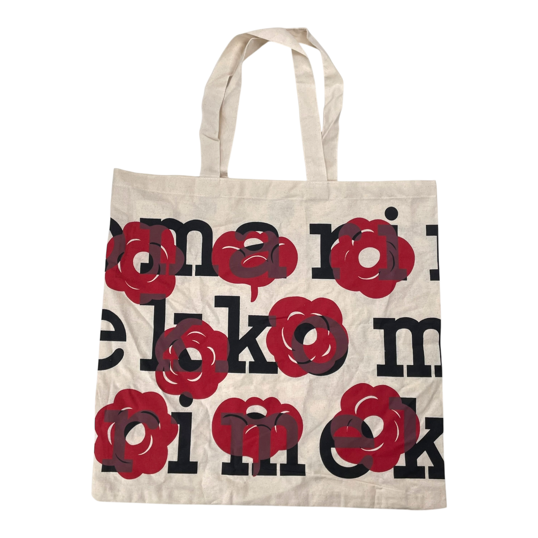 Marimekko tote shopping bag is made of lightweight cotton fabric, which features a logo pattern. The bag has two handles.
