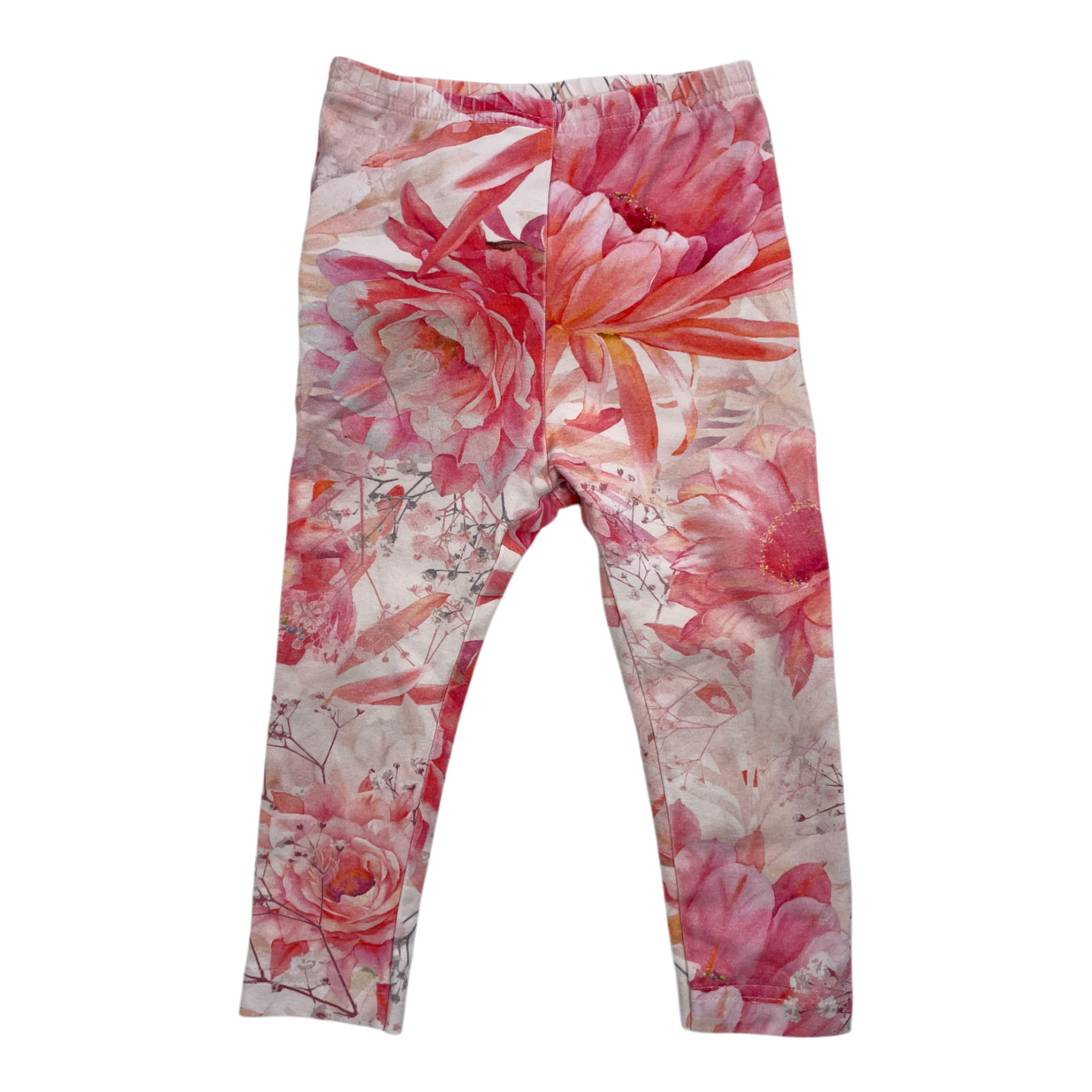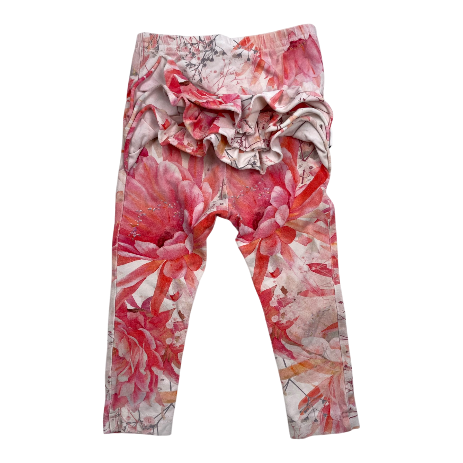 Metsola children's leggings featuring a vibrant floral print in pink and coral tones with decorative ruffle detail at the back. Elastic waistband for comfortable fit.