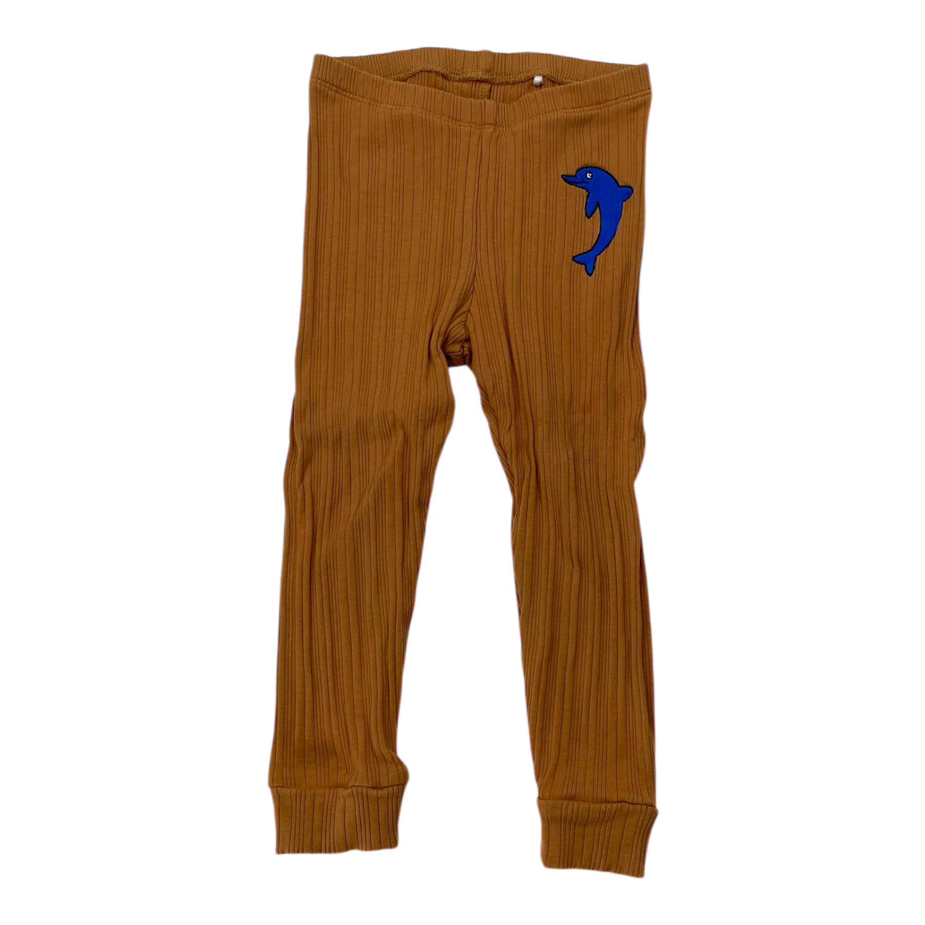Mini Rodini leggings in a think rib tricot material. The pants have an elastic waist with a drawstring and ribbed cuffs in a dolphin print.