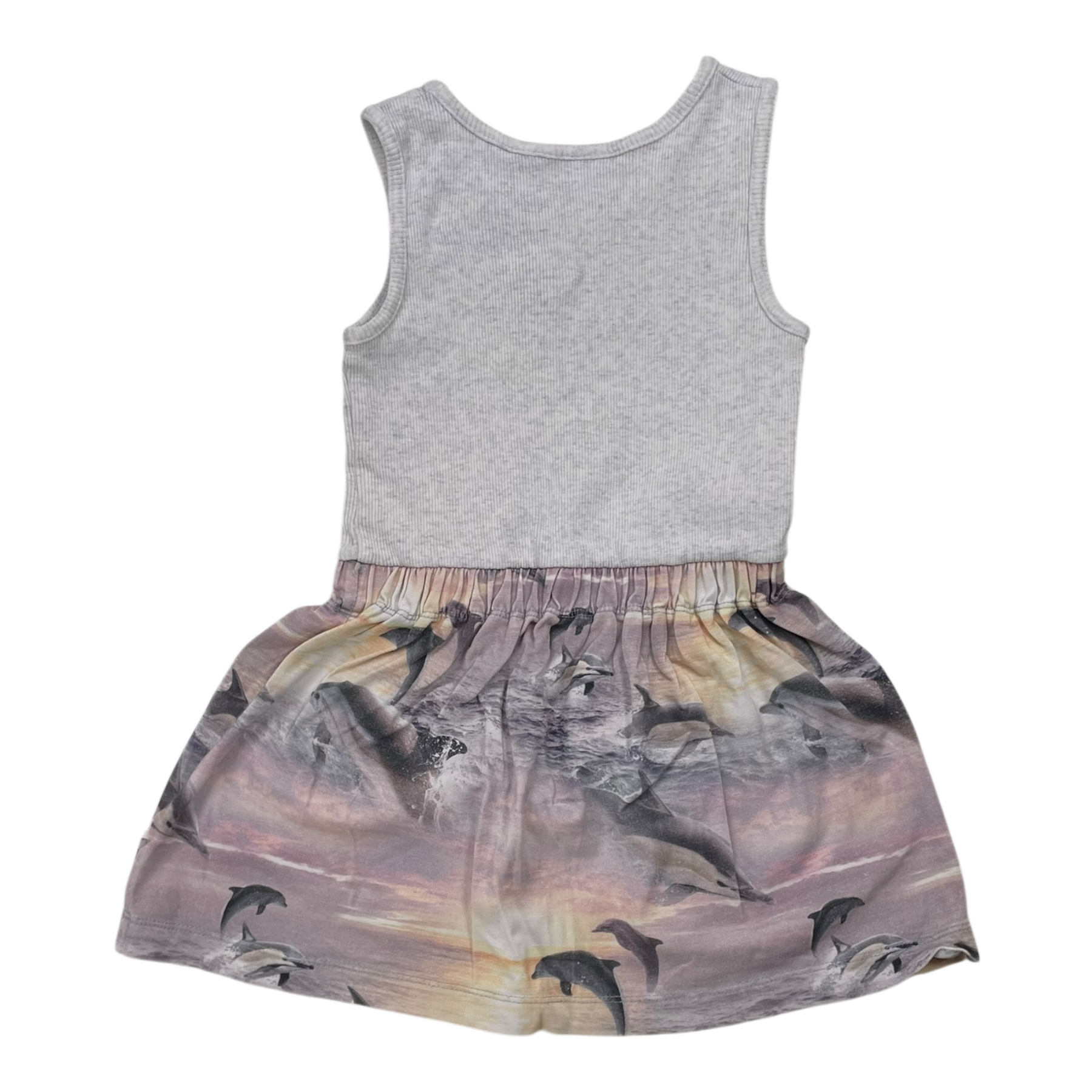 Molo Colleen dress in dolphin print at the hem. The top is fitted and the hem is stretchy and gathered on the waist.