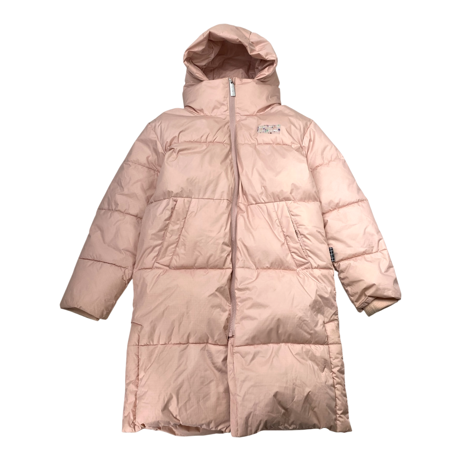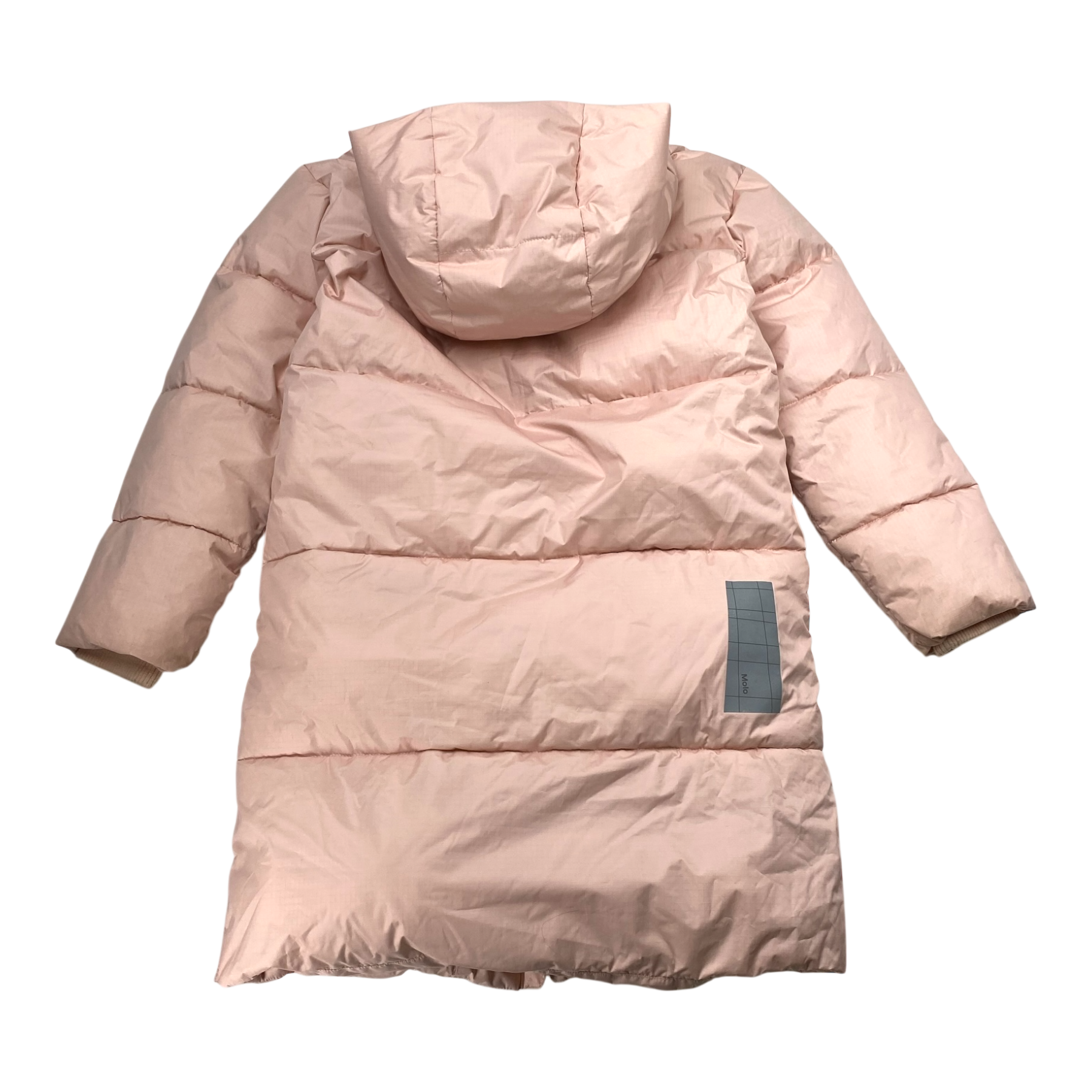 Molo Harper long winter puffer jacket has a zipper closure in the front and a warm removable hood. This item is otherwise in very good condition but there is some staining on the sleeve and the hang on the inside tag is broken.