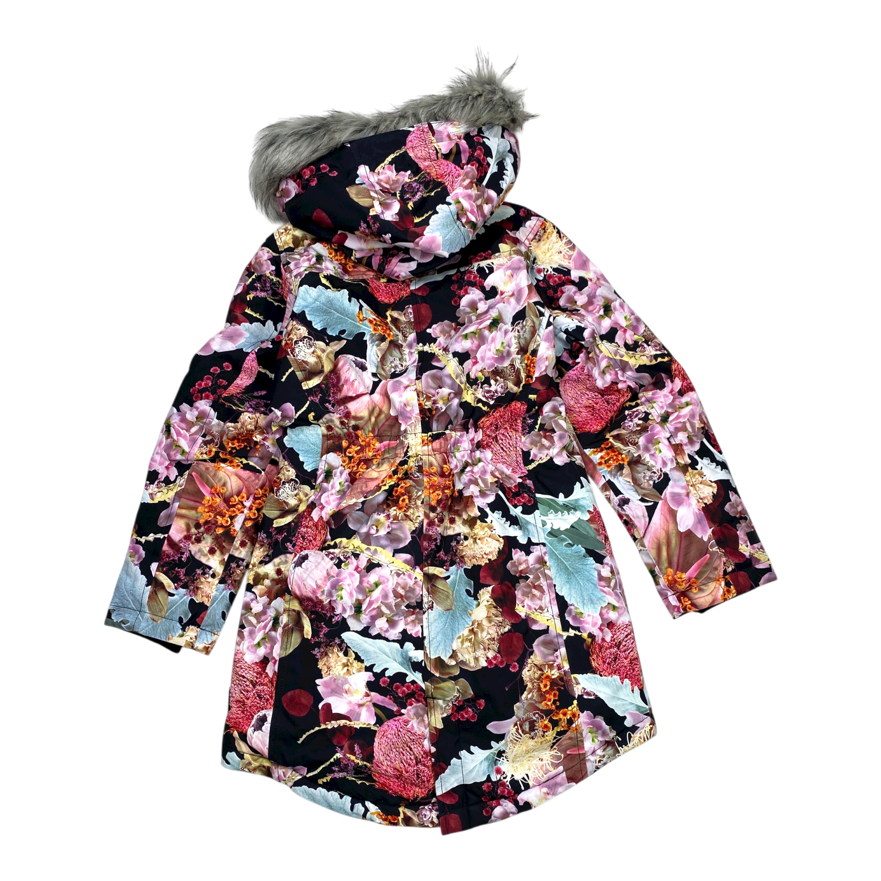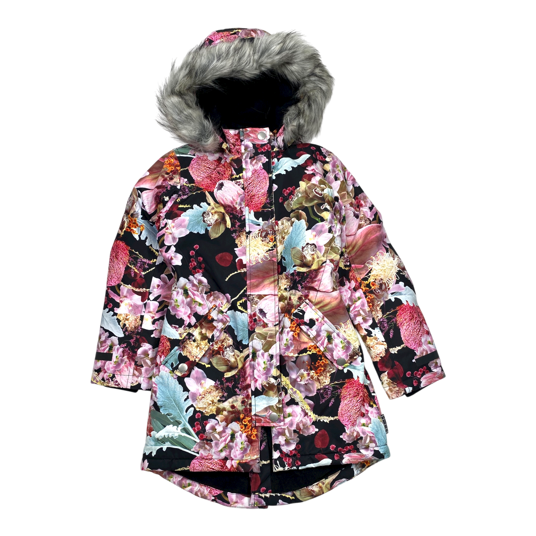 Molo Peace waterproof winter parka jacket with a detachable hood with a detachable faux fur edge, reflector, a hidden zipper with a placket, sleeve openings with a wind flap, three front pockets and an elastic at the back for a fitted shape.