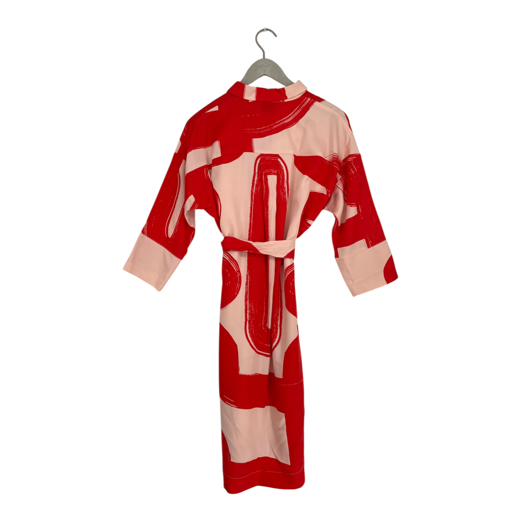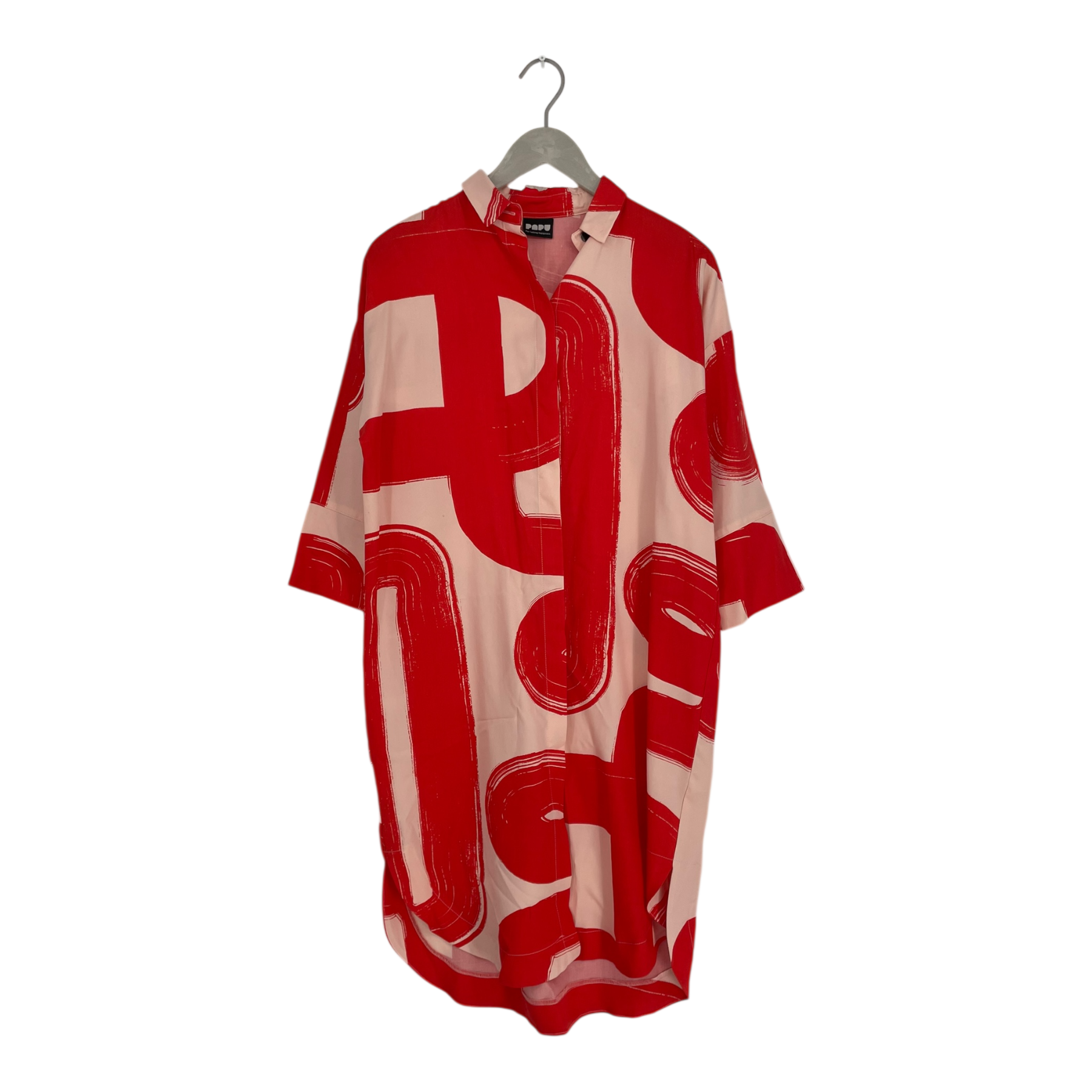 Papu women's woven lyocell button-up dress with collar. Hidden buttons down the front, separate fabric belt, no belt loops. Uneven hem is longer from the back. 3/4 sleeves.