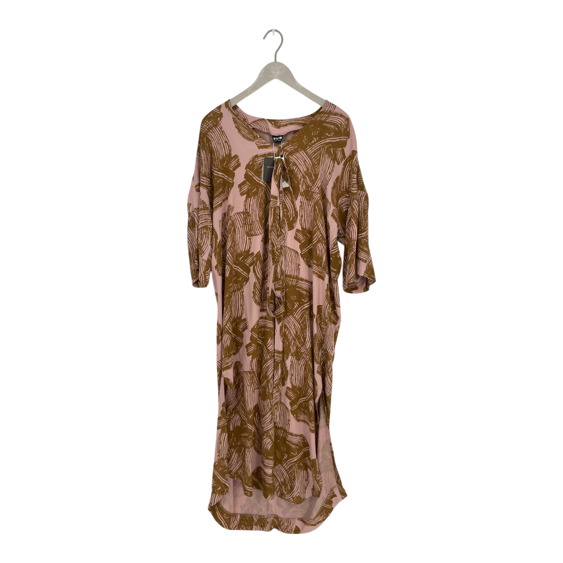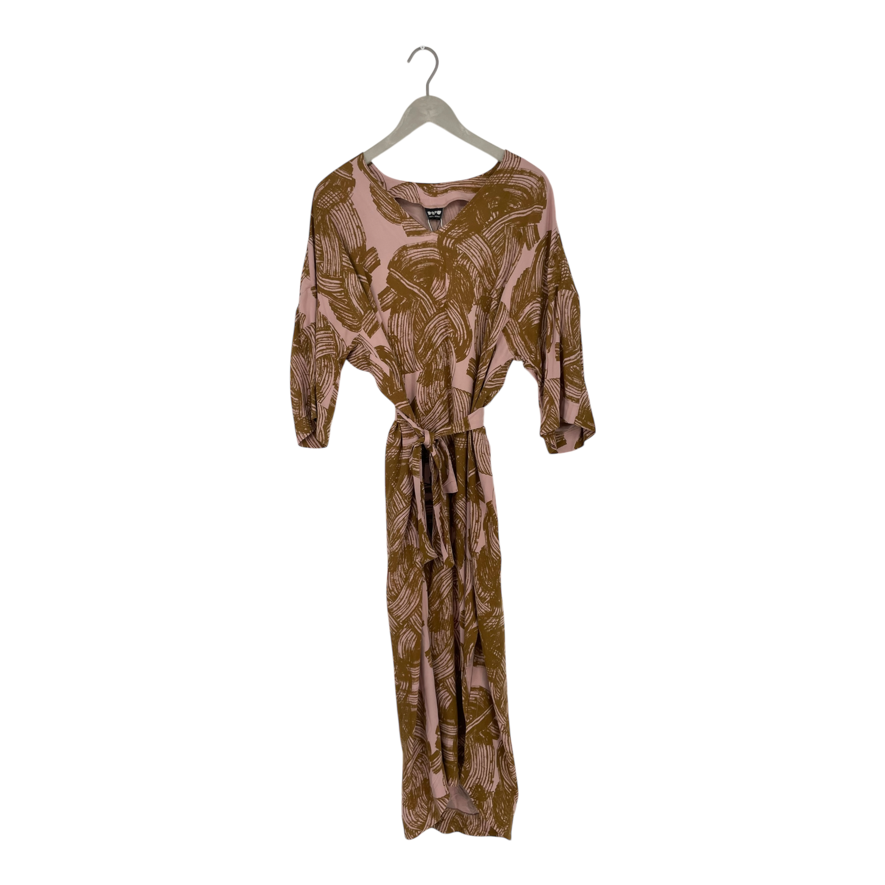 Papu women's long caftan in the Crossroads print with a matching fabric belt. The dress has dropped shoulders with half sleeves, long slits on the rounded hem and a v-neckline.