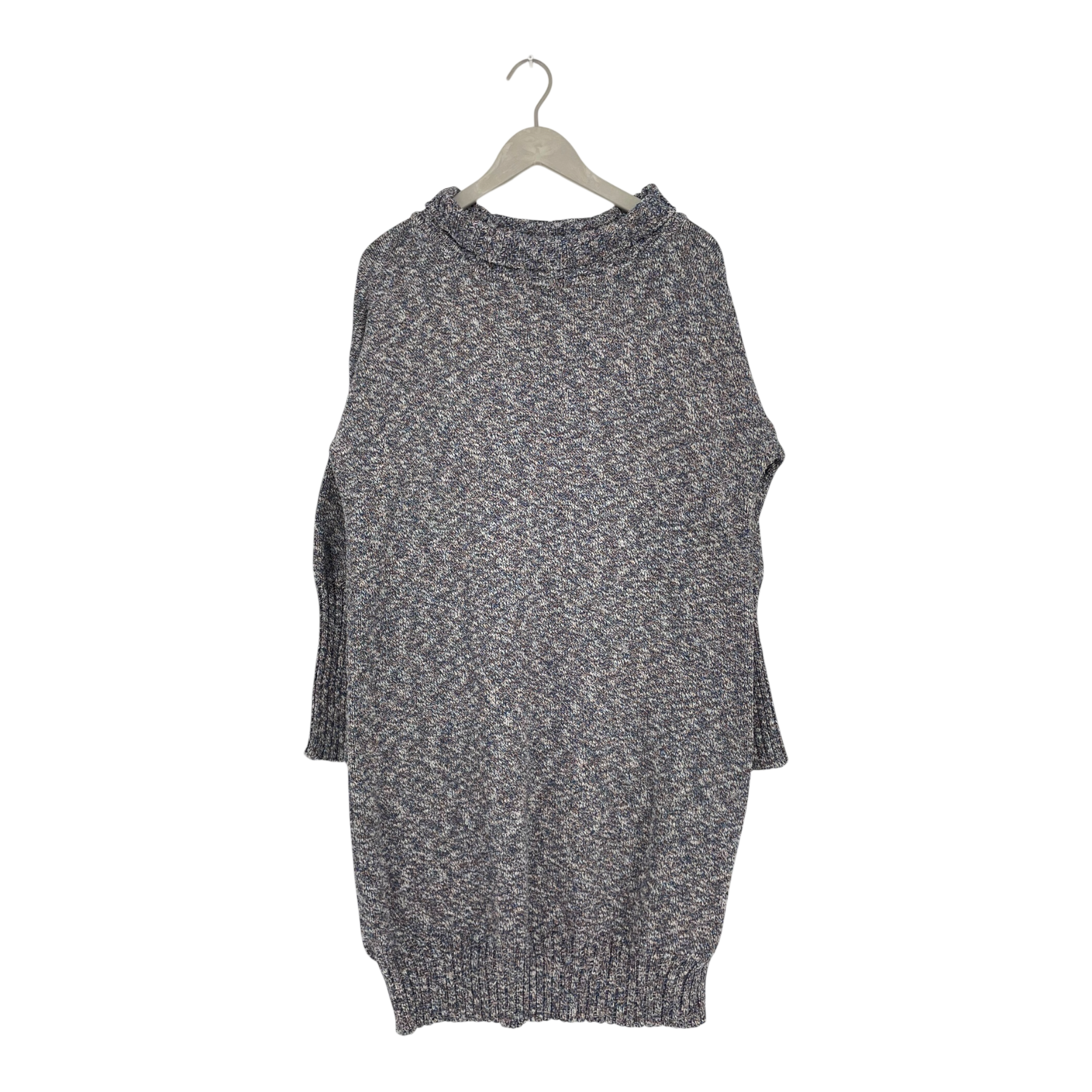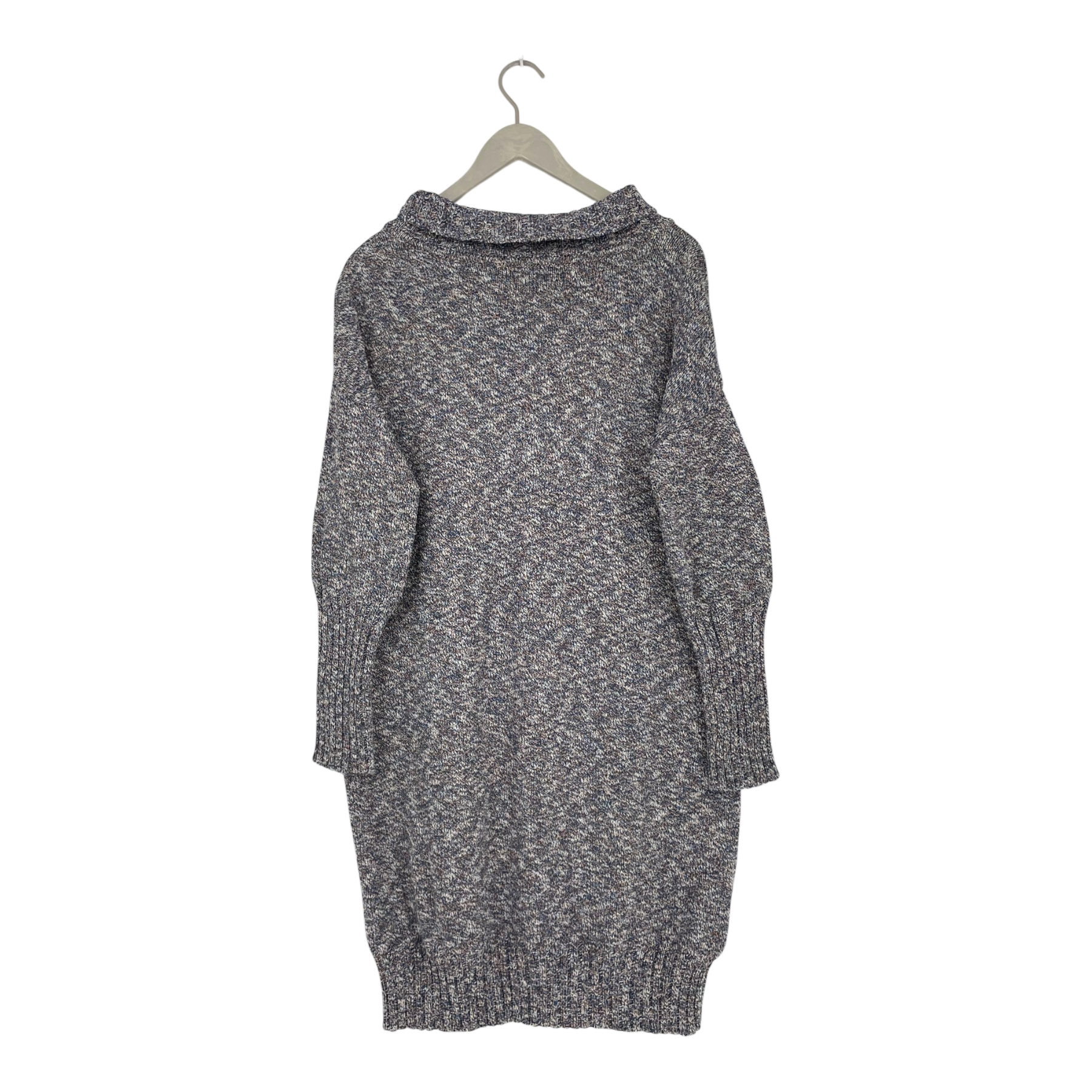 Papu women's knitted dress. The dress has a foldable neckline and foldable cuffs. This dress has one run of thread on the sleeve and the fabric shows slight signs of wear.