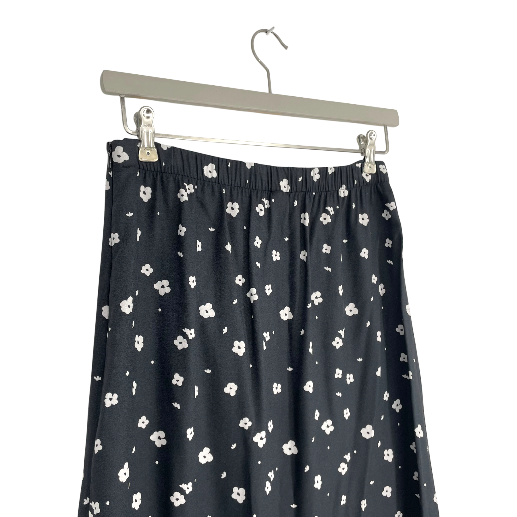 R-Collection skirt in white all-over floral print. The skirt features a midi-length cut, zipper on the side and a stretchy elastic waist band on the back.