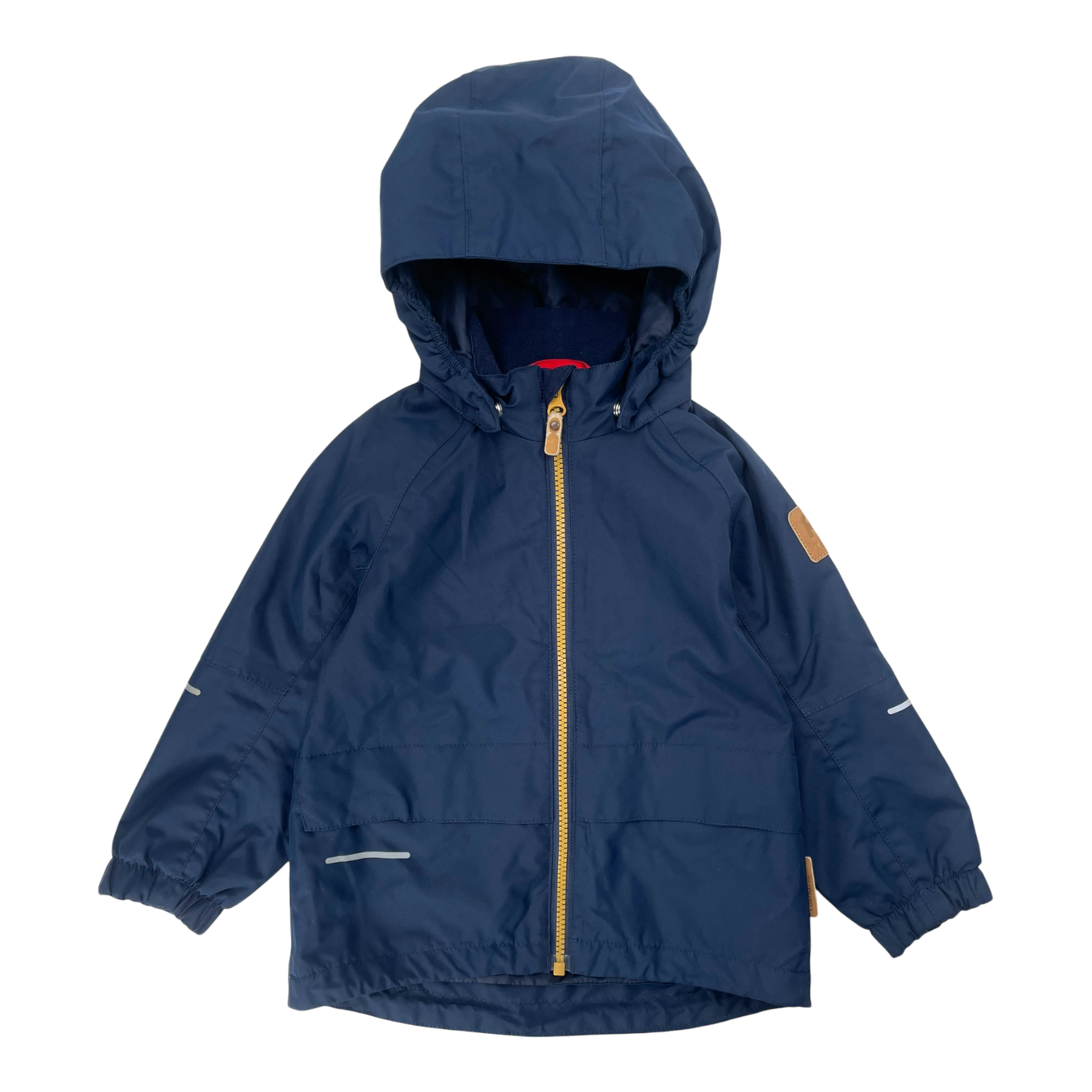 Reima Aho jacket with detachable hood, two front pockets and adjustable elastic on the hem. The material is originally waterproof and dirt-repellent.