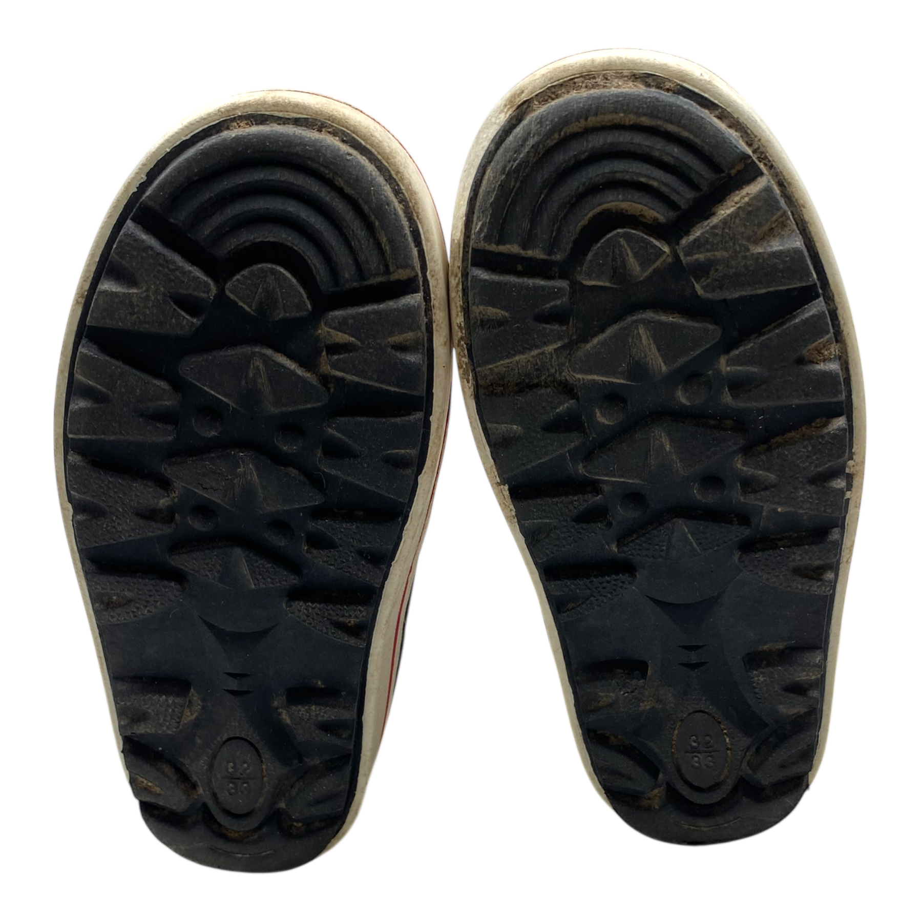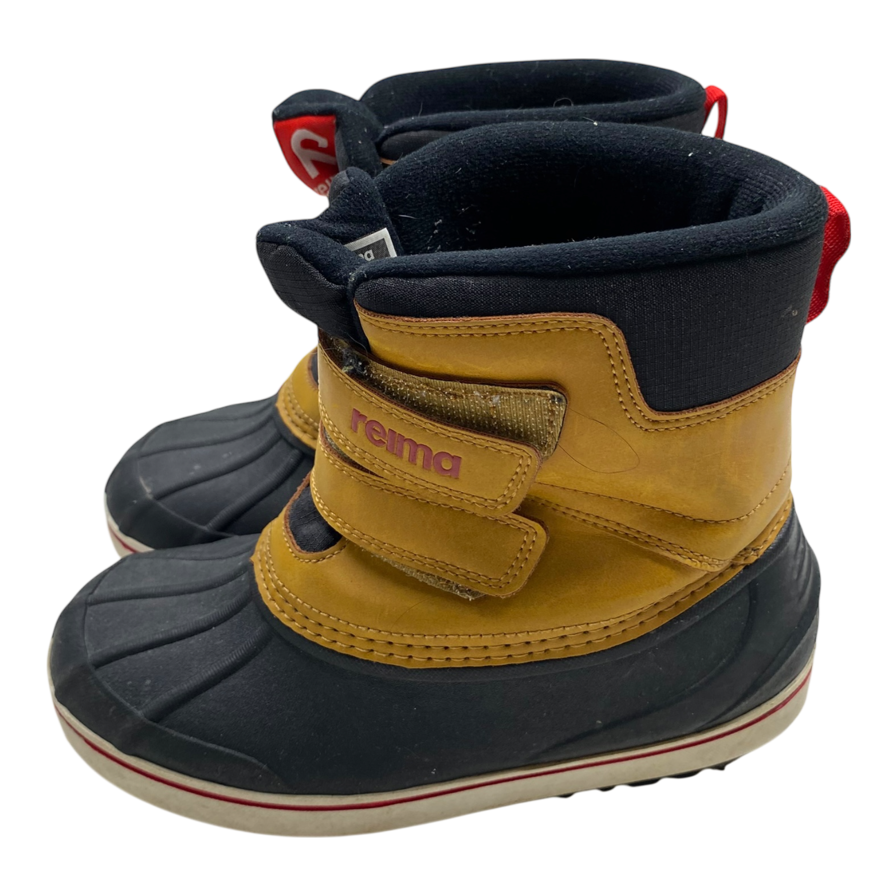 Reima Coconi winter shoes with waterproof galoshes are a great choice for winter. The uppers are made of synthetic material, and the warm wool mix lining keep the toes warm. Thanks to the velcro fastening the shoes are easy to put on and the kid is ready for outdoors in a flash. The item has some signs of use.