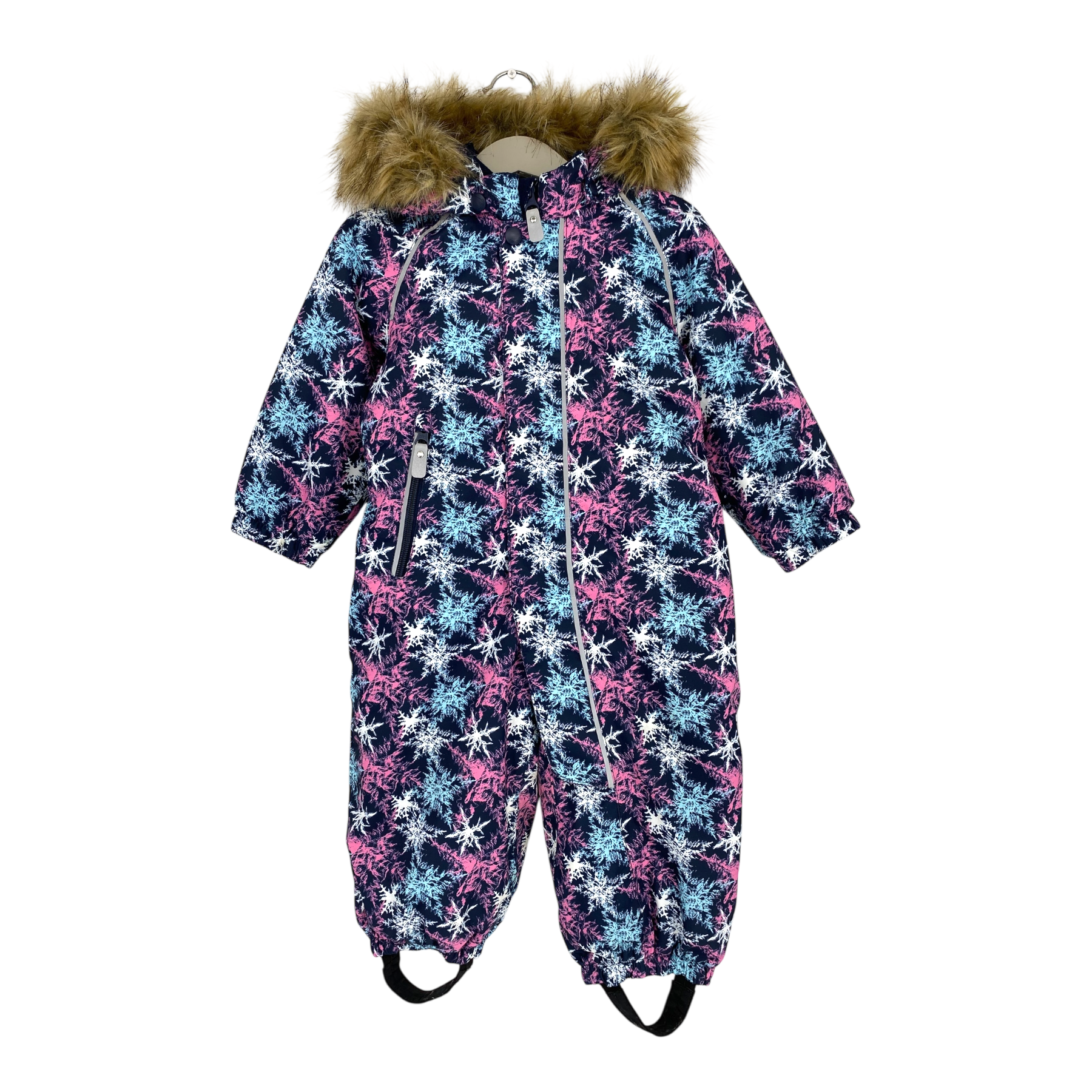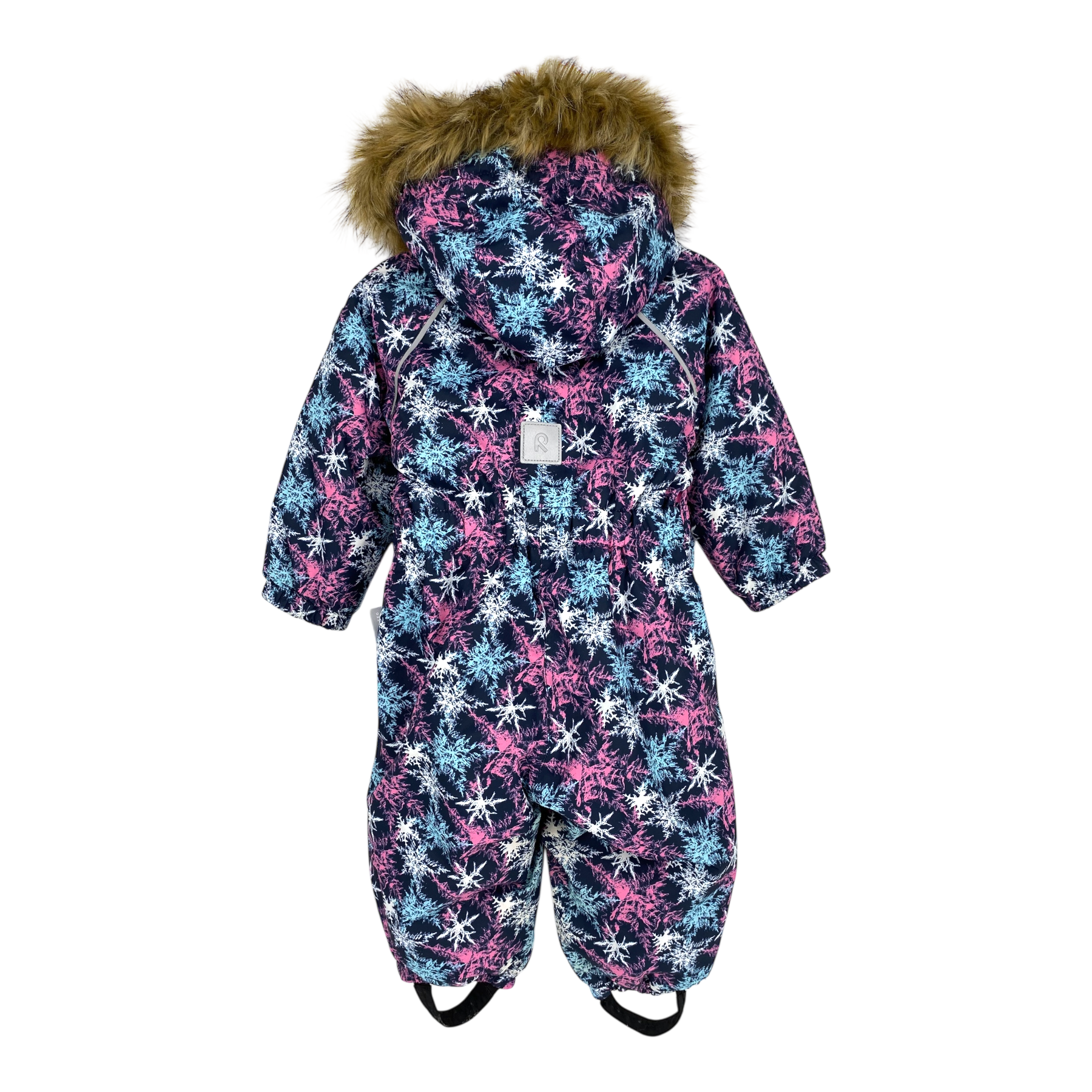 Reima Hulaus winter overall with detachable faux fur hood, zip pocket and foot loops. material is originally wind- and waterproof.