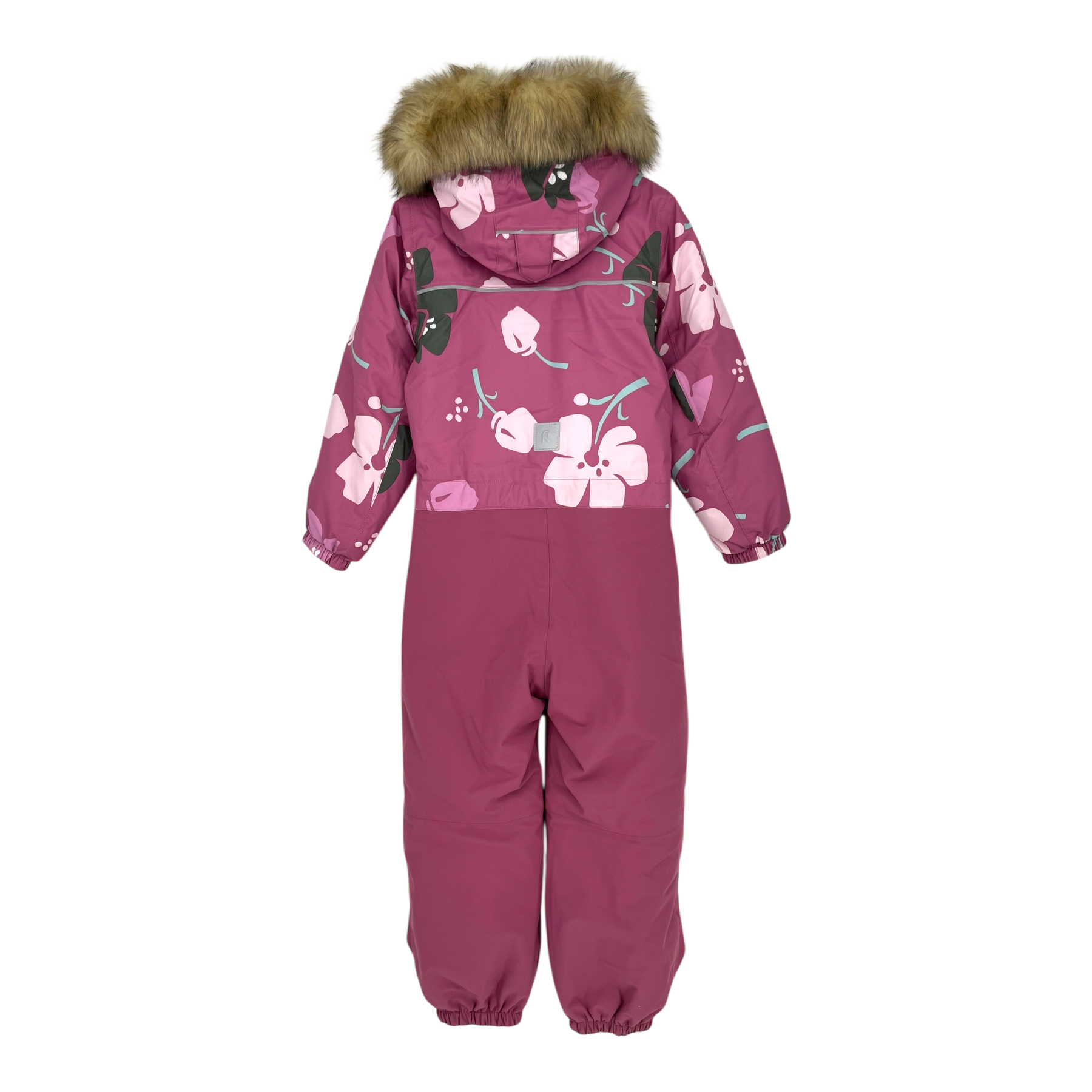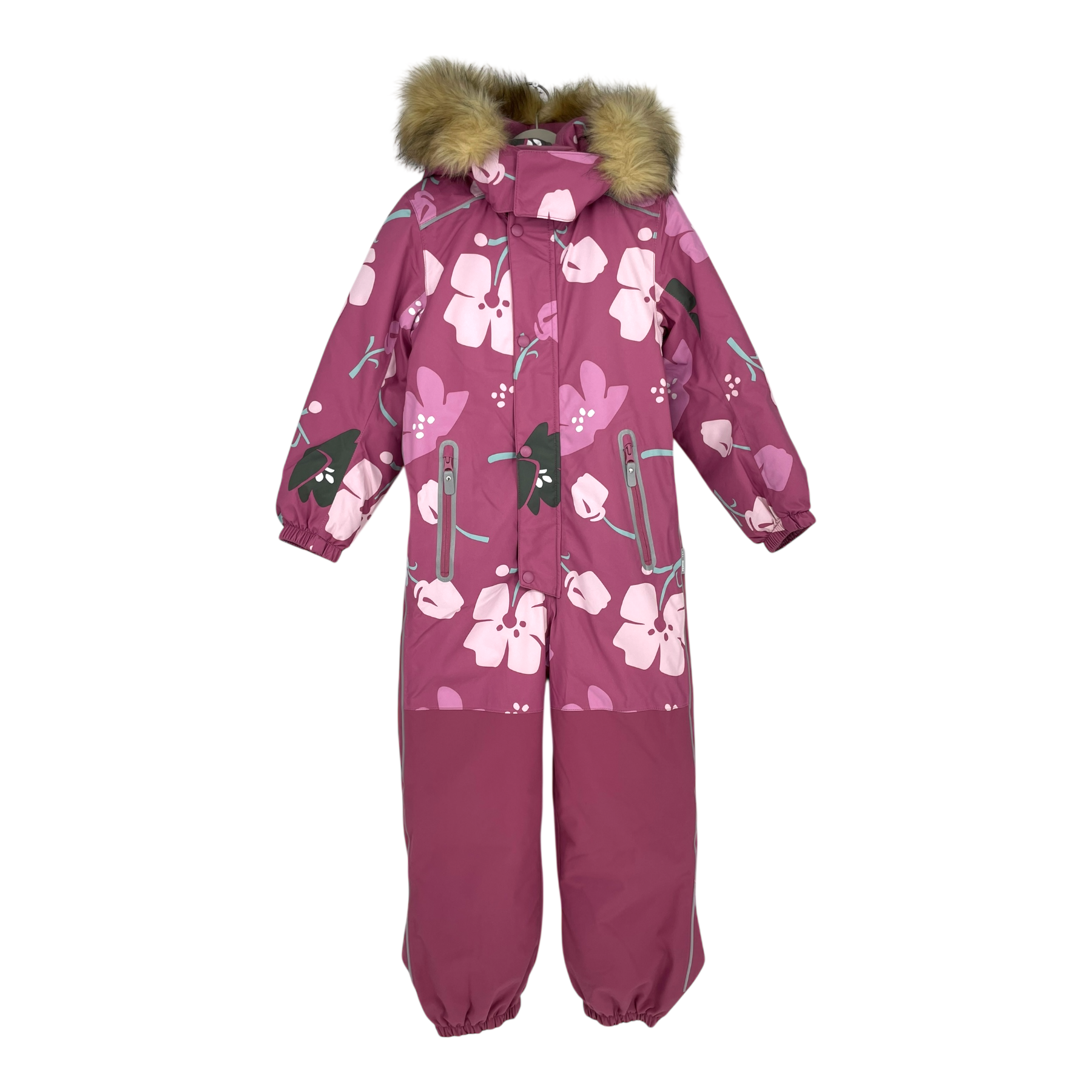 Reima Kipina winter overall with detachable faux fur hood, zip pockets on sides, reflective details, adjustable elastic on the waist and durable foot loops.