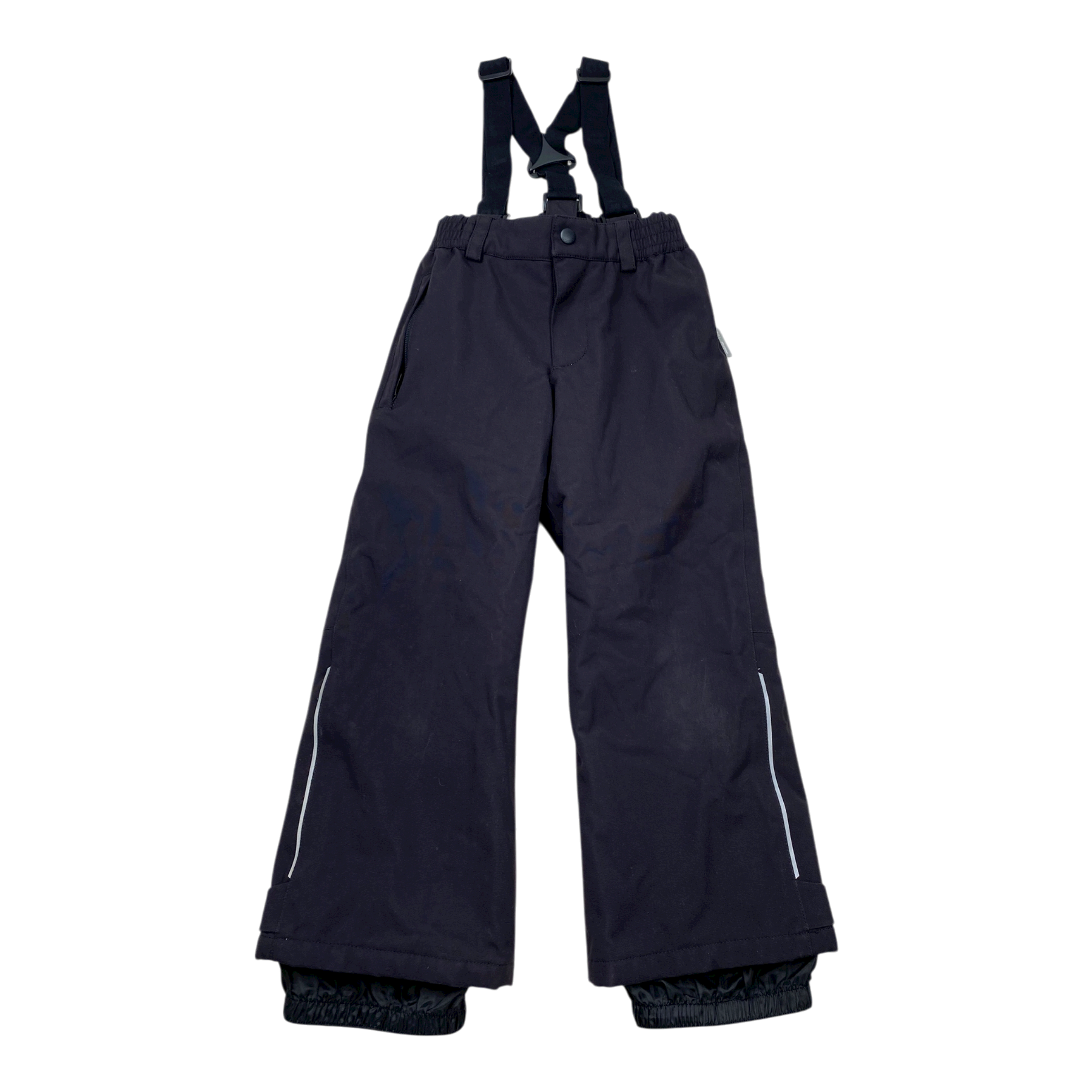 Reima Loikka outdoor pants with elastic and adjustable suspenders. Pants have a zip pocket, elastic waist, adjustable leg ends with snow locks.
