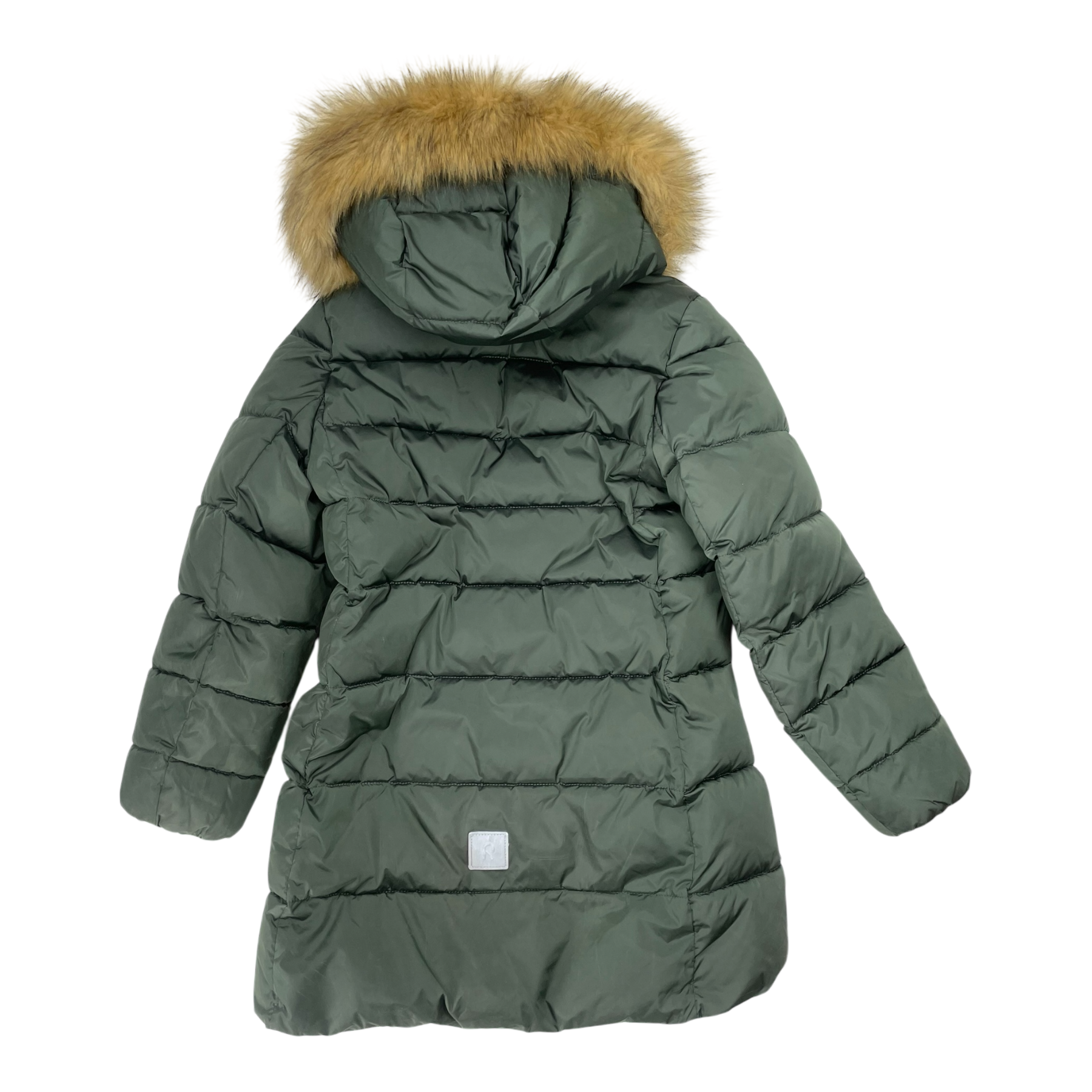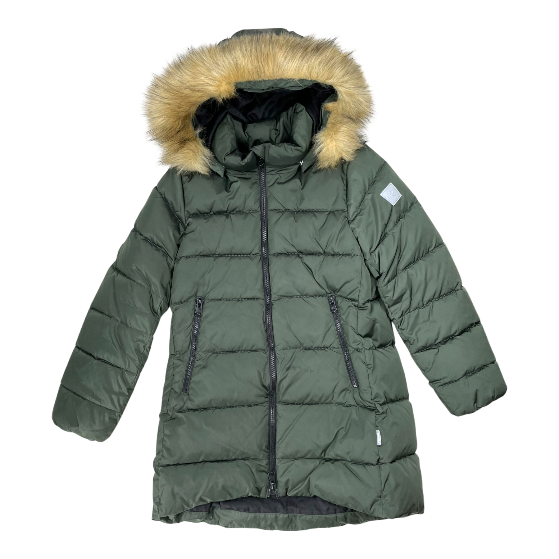 Reima Lunta winter jacket with a removable faux fur hood, side pockets, and a zip closure. Material is originally water-repellent and windproof.