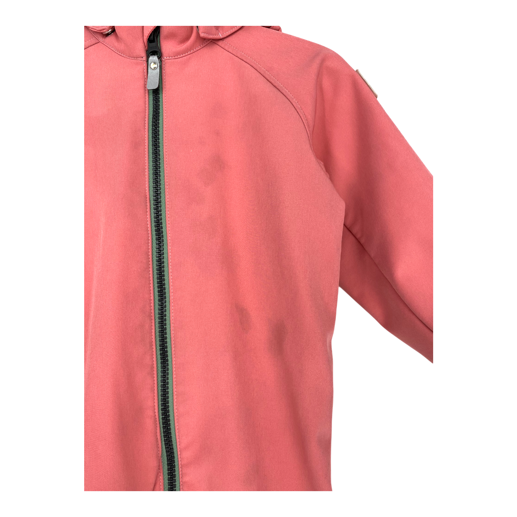 Reima Mjosa softshell midseason overall with detachable hood, one zipper pocket, reflective details, and detachable foot loops in hems. The material is originally waterproof up to 10,000mm water column, and the bottom part is very durable. The item has stains.