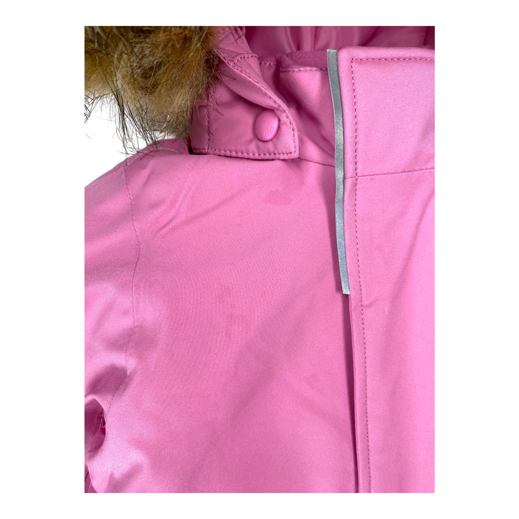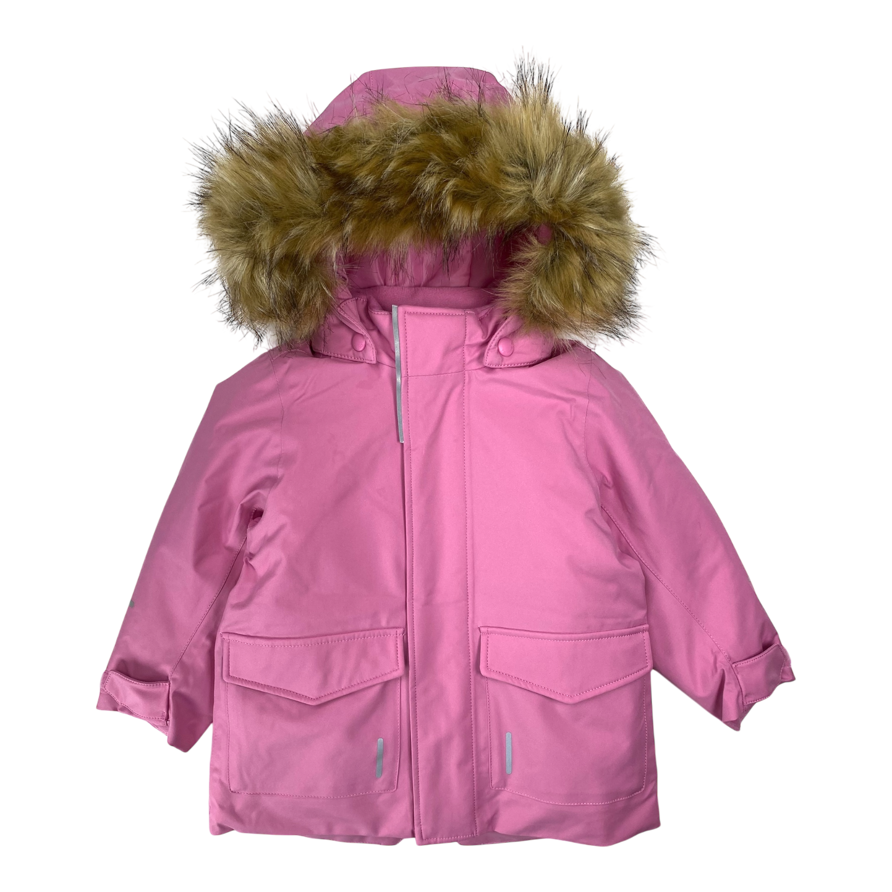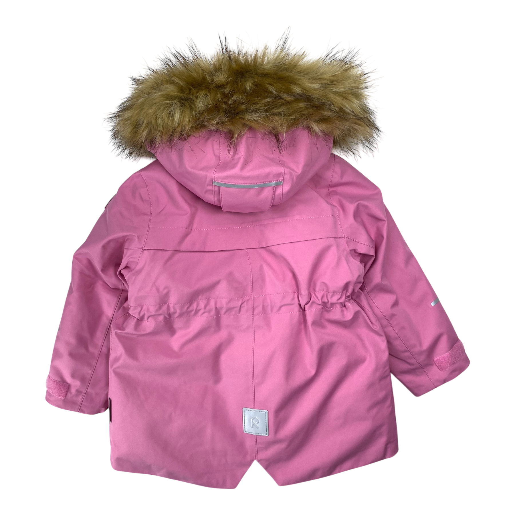 Reima Mutka winter parka with detachable faux fur hood, two flap pockets and adjustable elastic on the waist. The material is originally waterproof up to 10,000mm water column and all seams sealed.
