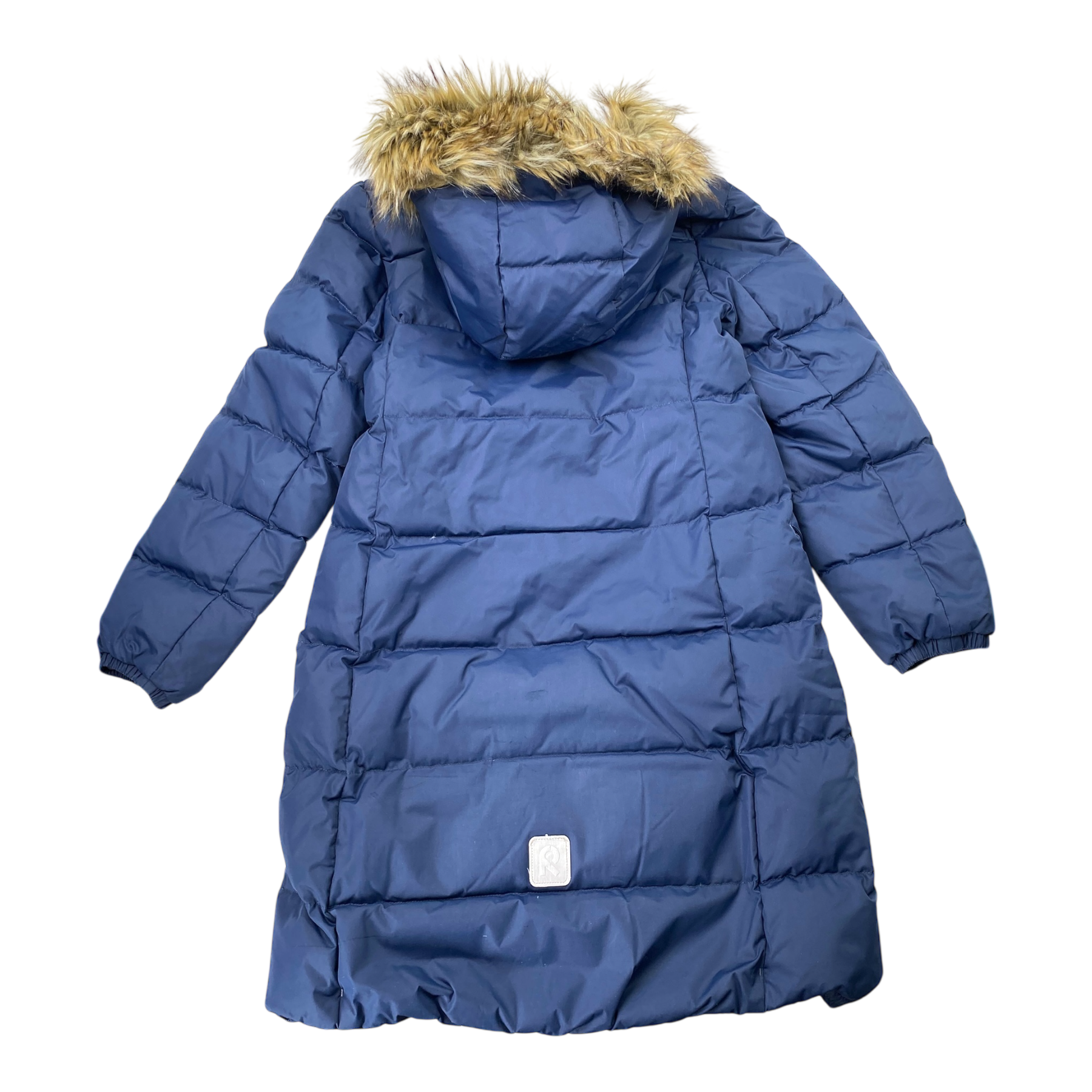Reima Satu down long winter jacket in burgundy. Detachable hood with faux fur trim, elastic sleeve cuffs and snap button pockets. Reflecting details for extra safety.