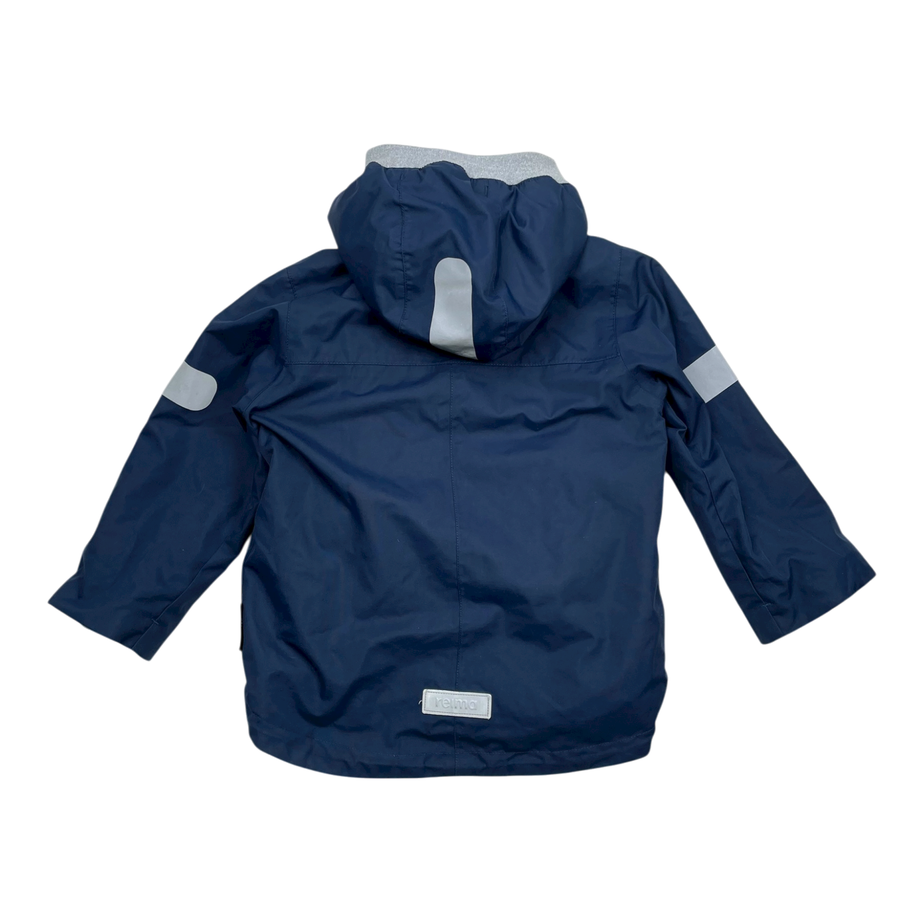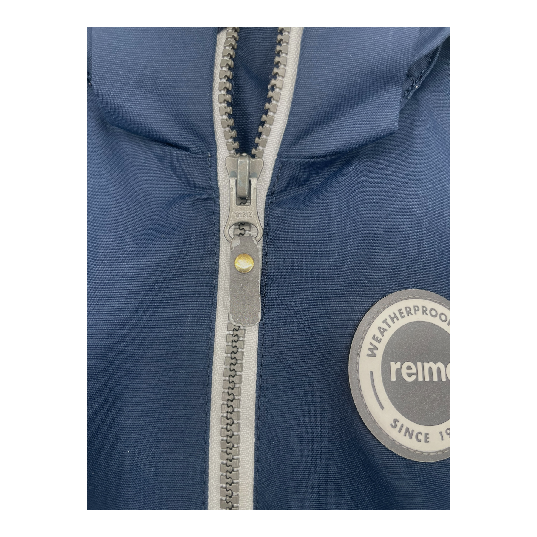 Reima Sydvest midseason jacket with detachable lining to adjust the warmth of the jacket. Detachable hood, two flap pockets and zipper closure. Jacket has originally been waterproof.