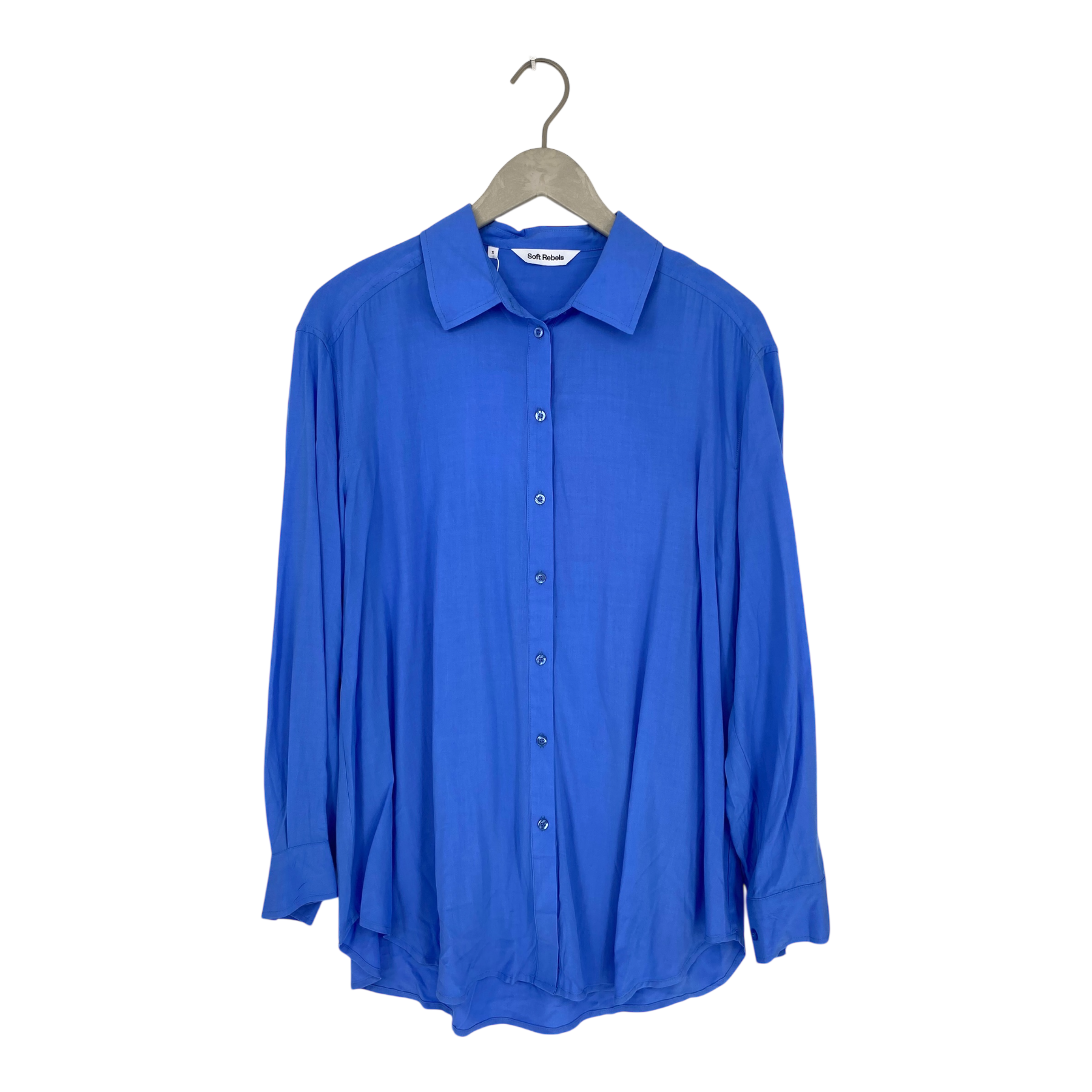 Soft Rebels Freedom blouse with collar. Button closure, curved hemline which is slightly longer from the back, and buttons on cuffs.