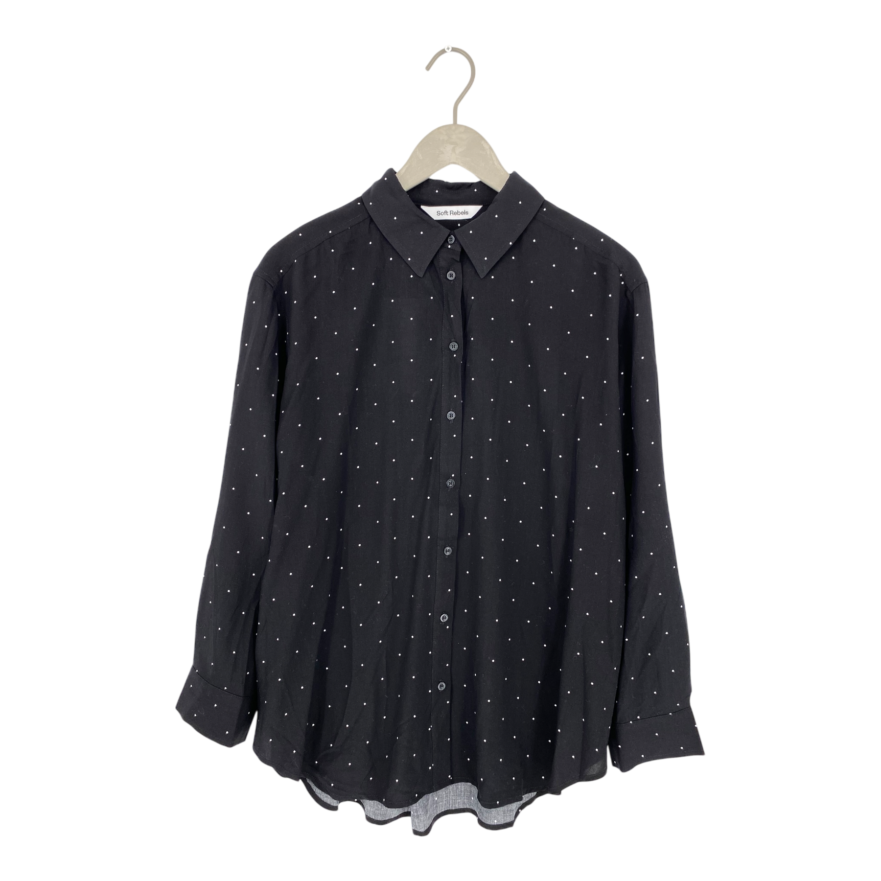 Soft Rebels Margot blouse with collar. Button closure, curved hemline which is slightly longer from the back, and buttons on cuffs.
