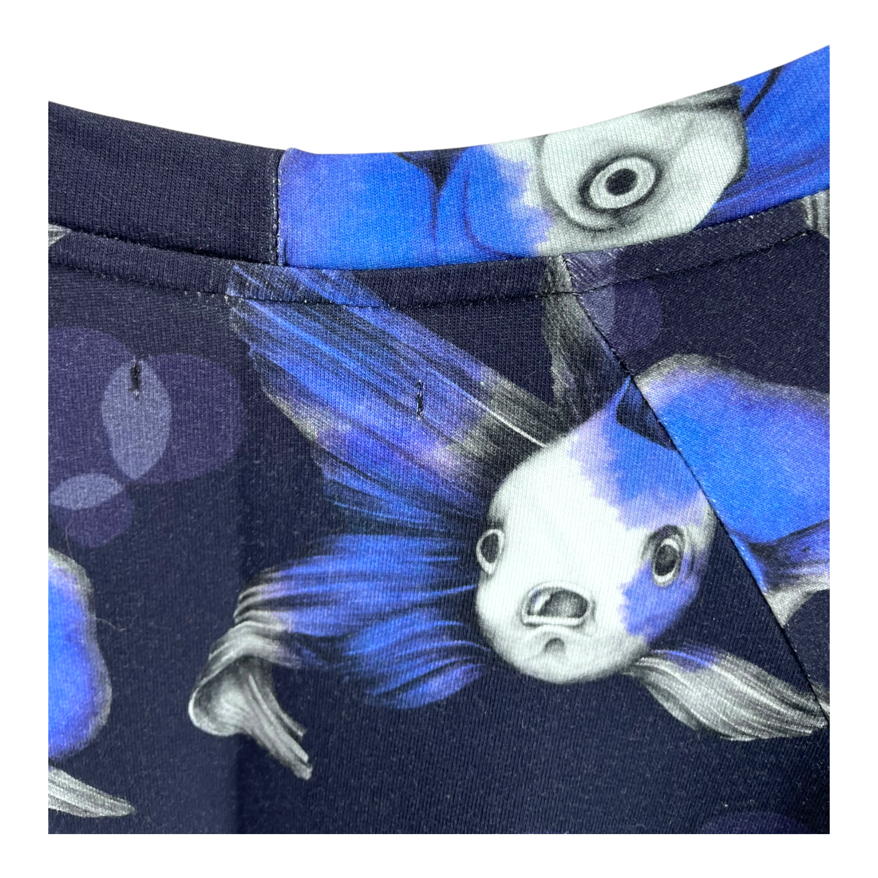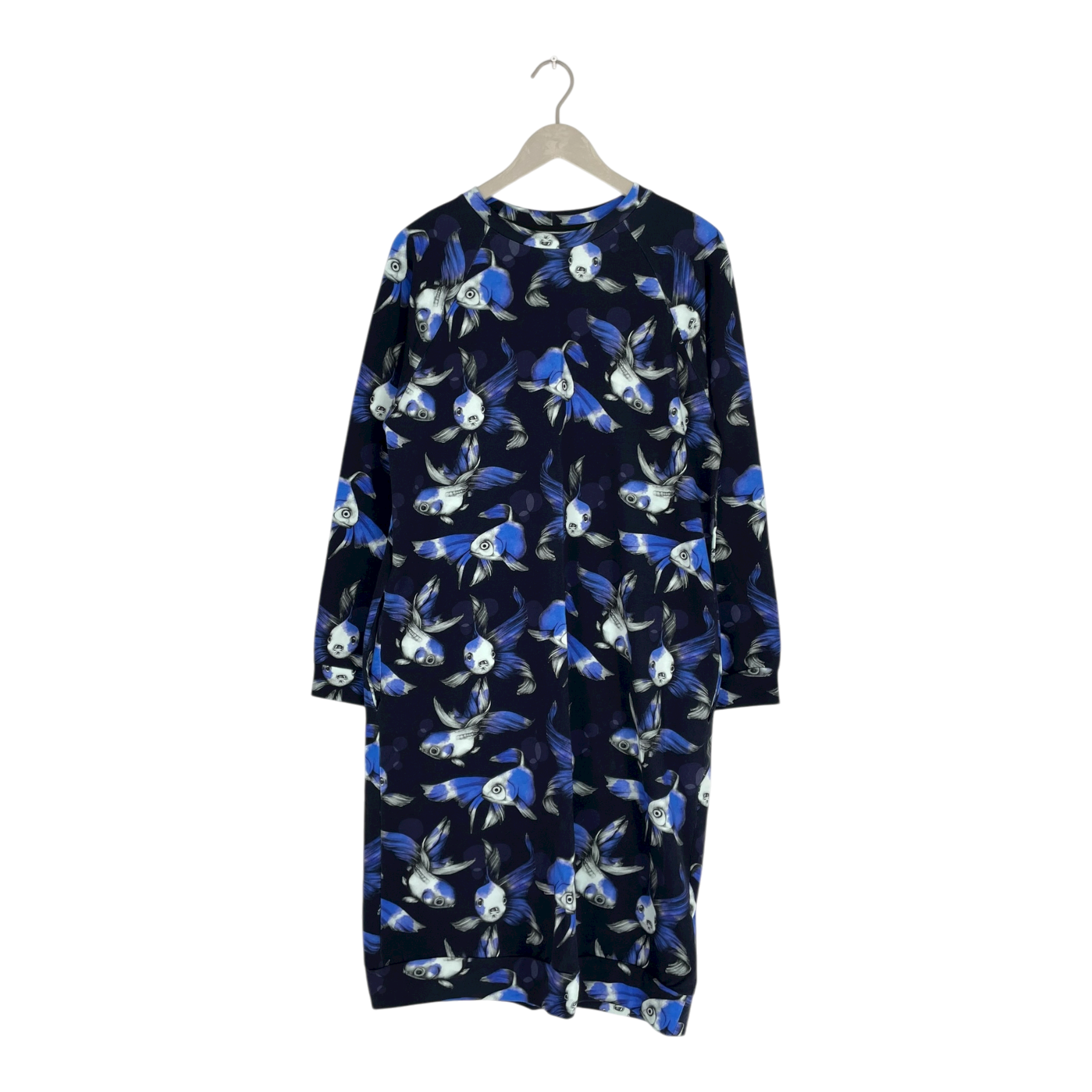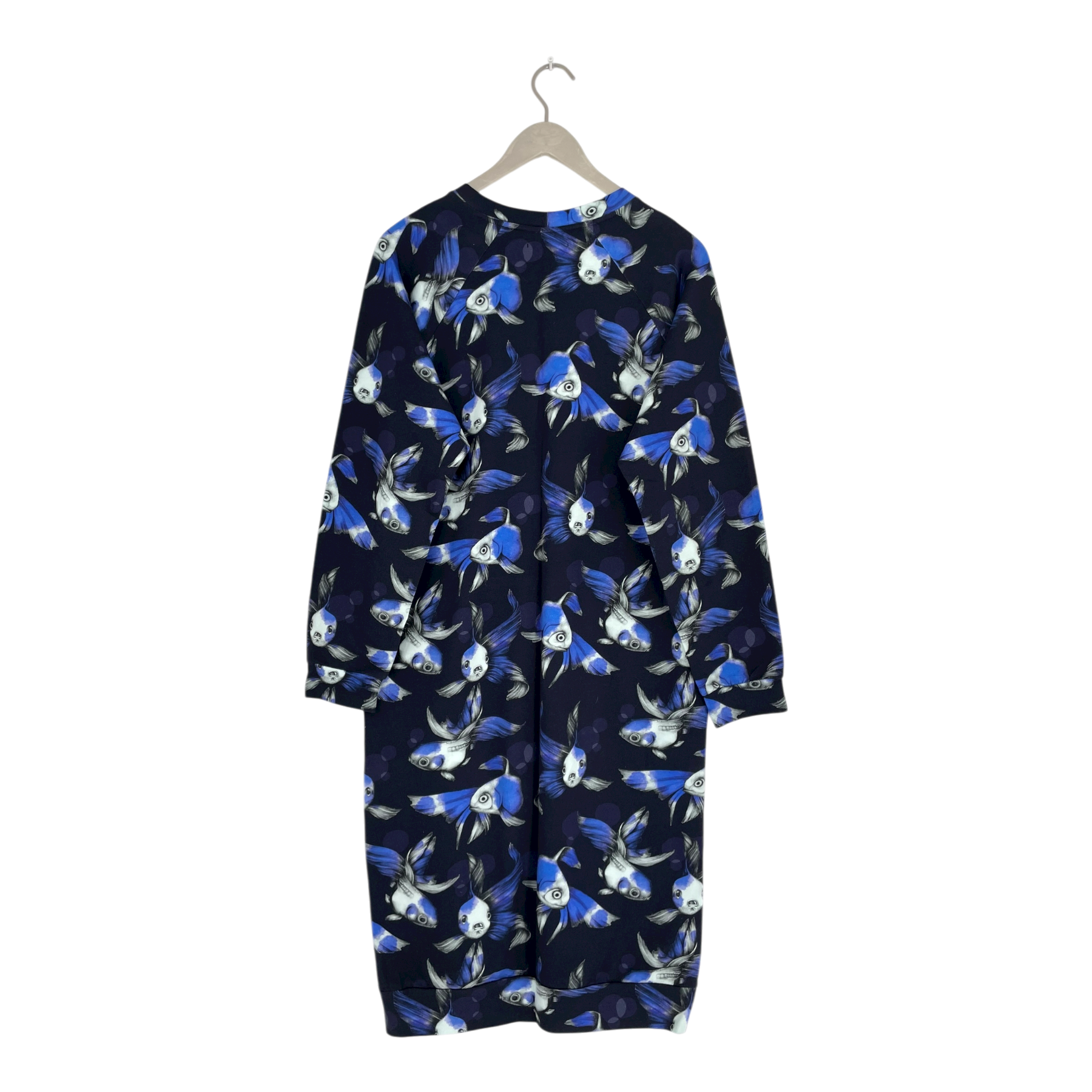 Vimma college dress with long sleeves and pockets in a fish print. One size corresponds to around size M/L. The item has some slight fading on the seams, as shown in the picture.