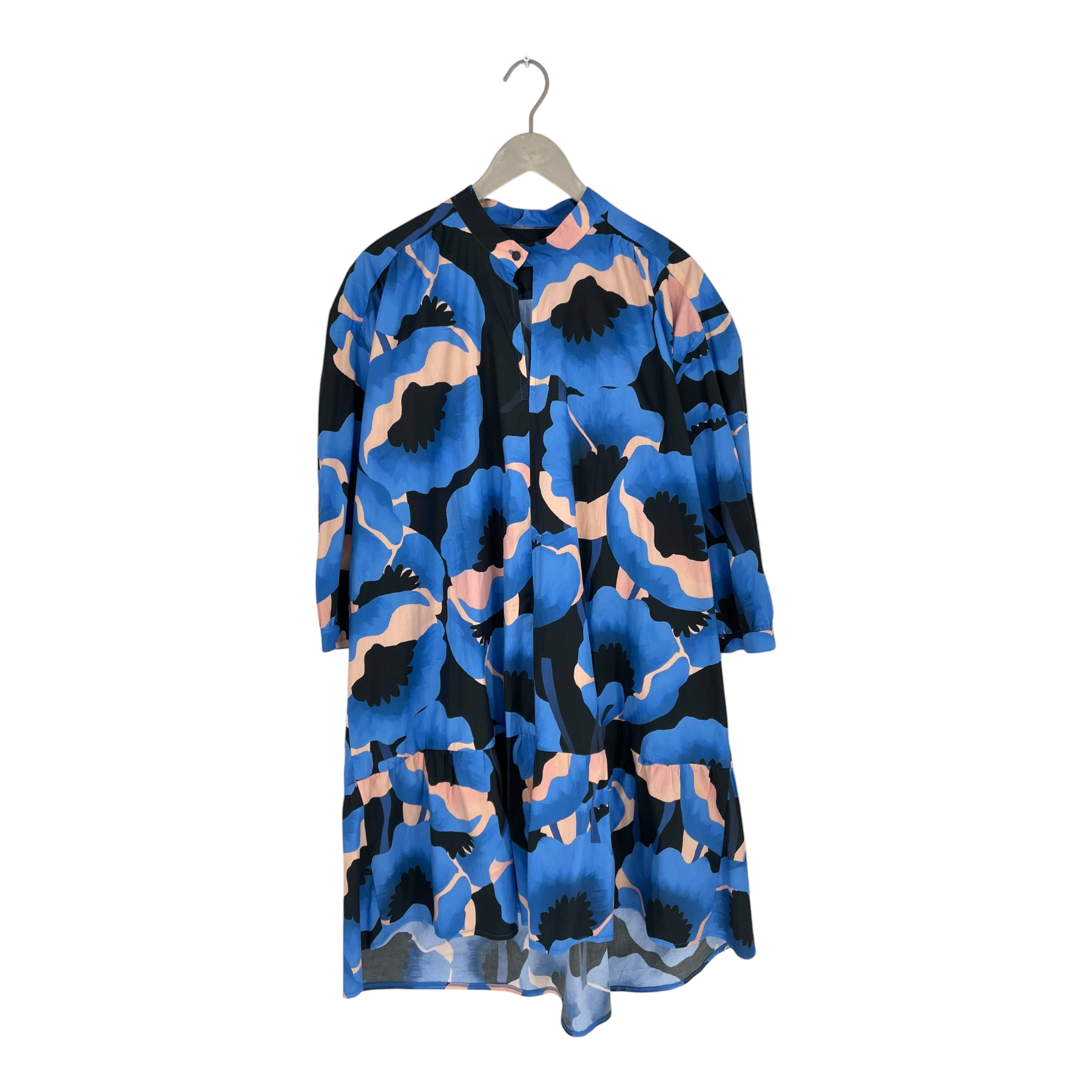 Vimma Tuuva dress with a round neckline, frill hem, large sleeves and pockets on the sides in Kesäyö print.