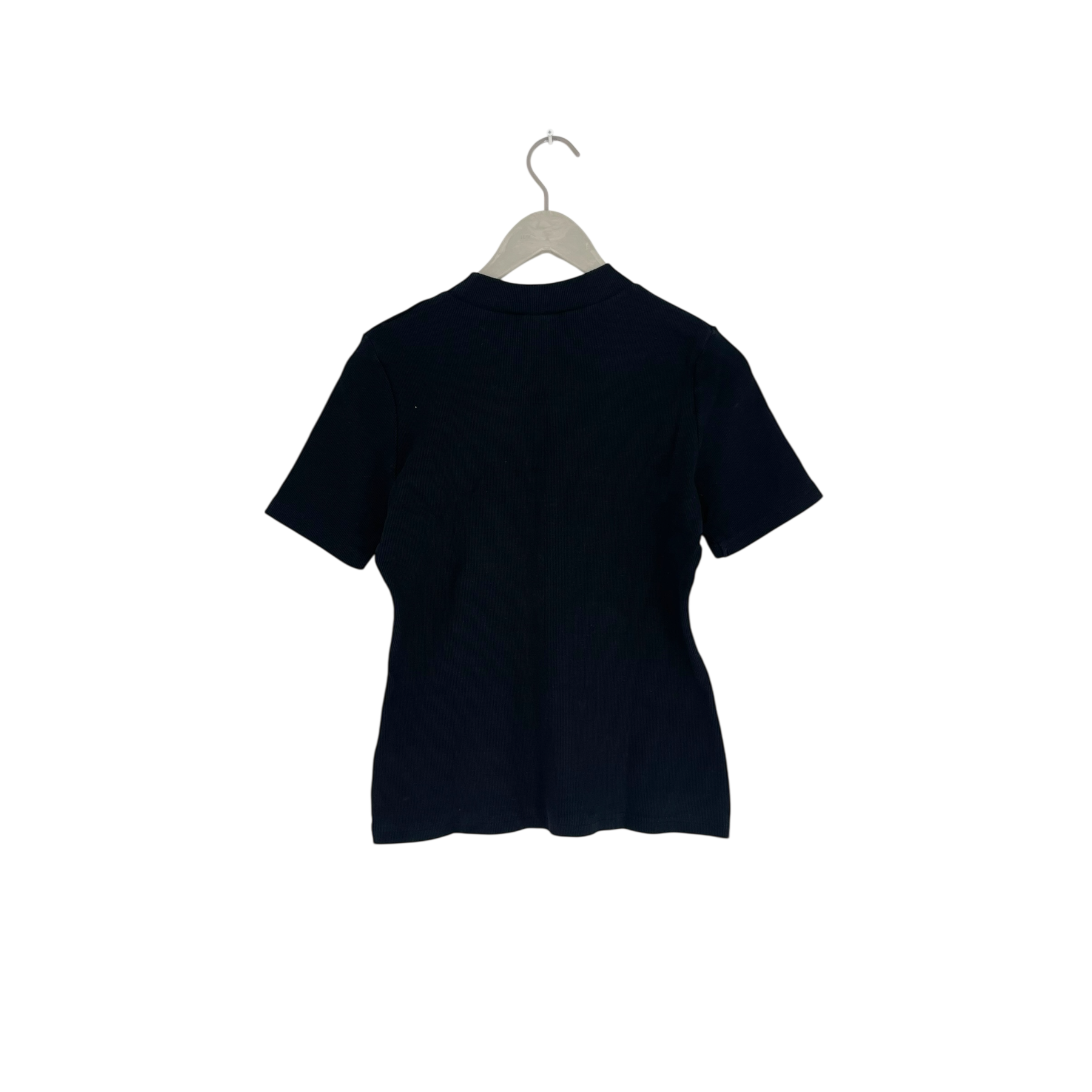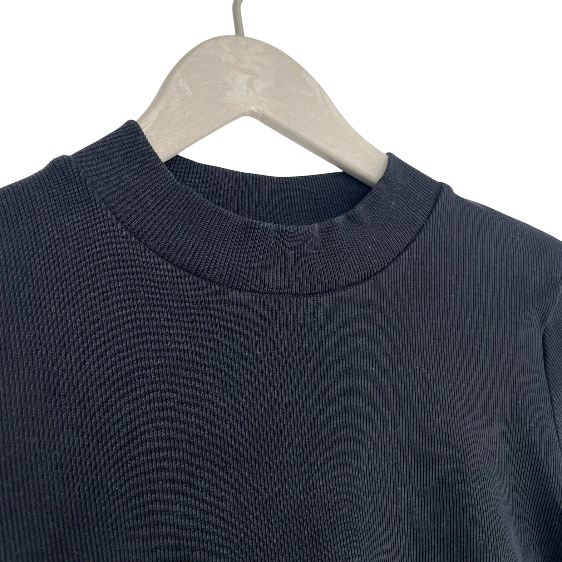 Aarrelabel women's t-shirt with large rib texture, small turtle neck and detailed hemlines.