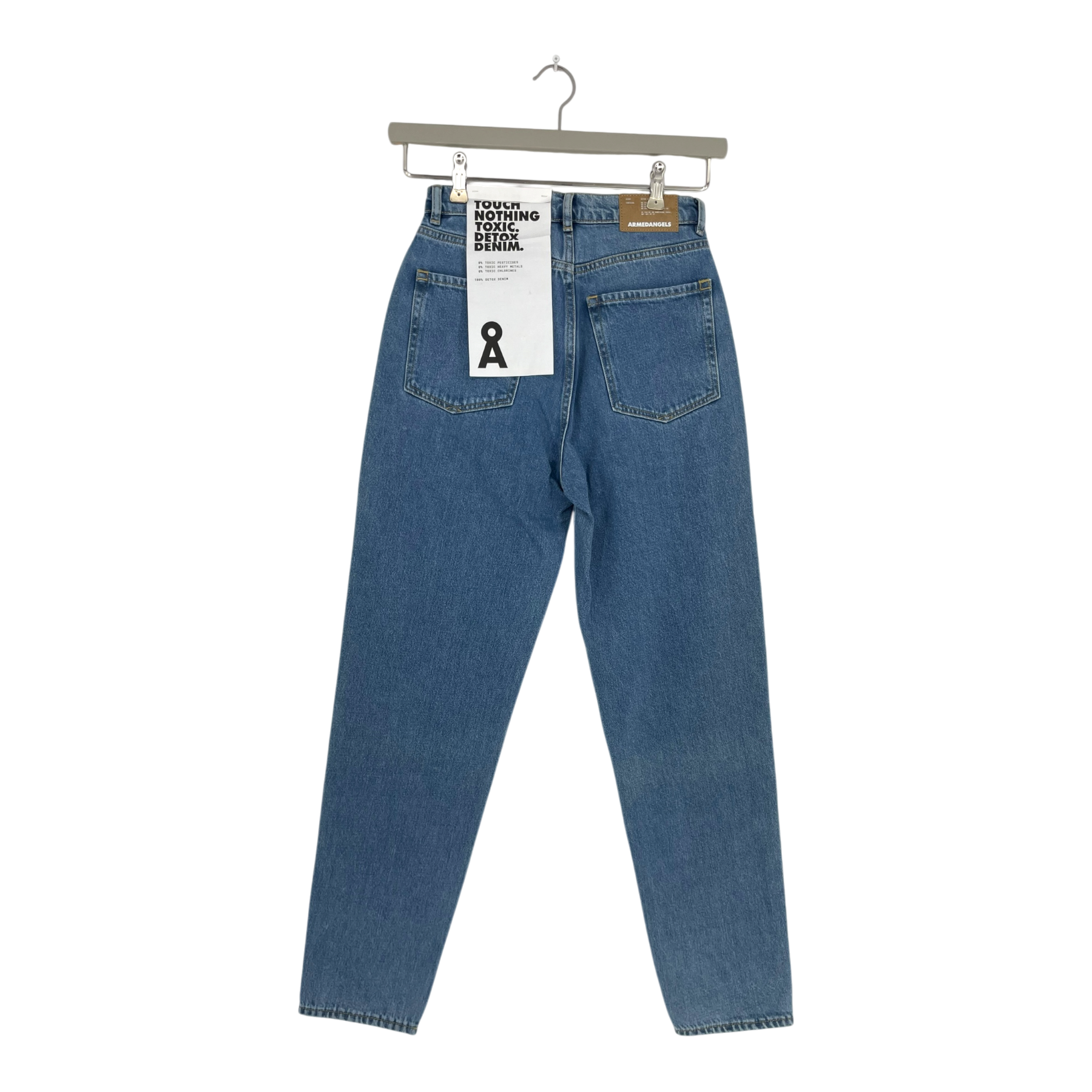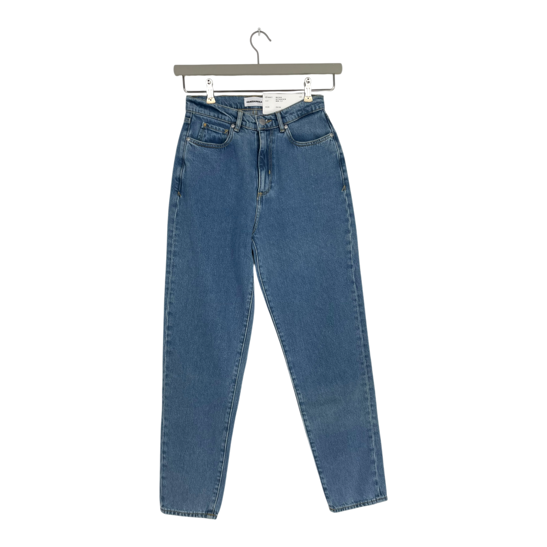 Armedangels high-waisted straight leg jeans with classic five-pocket styling. Features zip closure and belt loops.
