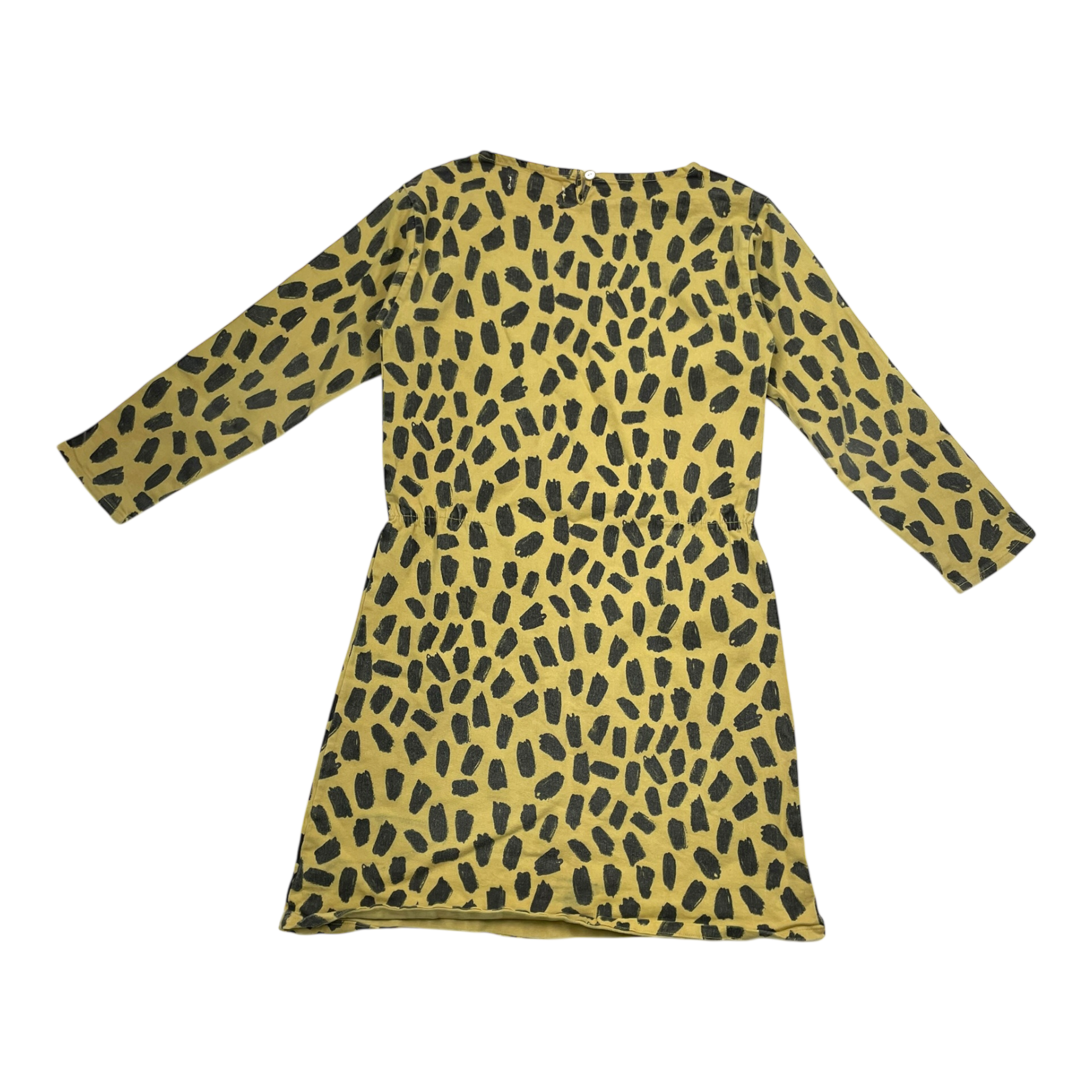 Bobo Choses woven dress in yellow with black dots. Buttons in front. There is a small stain on the back hem of the dress.