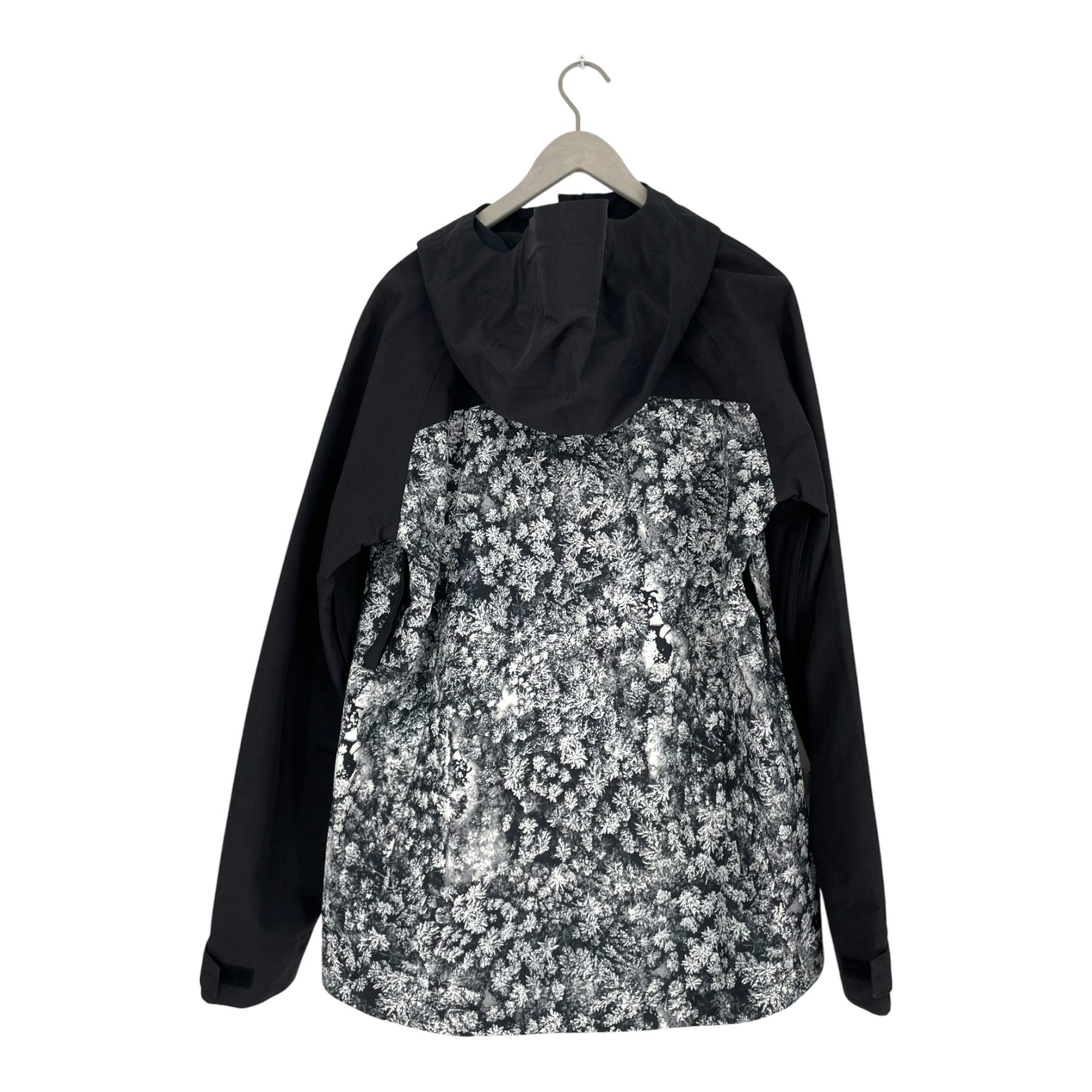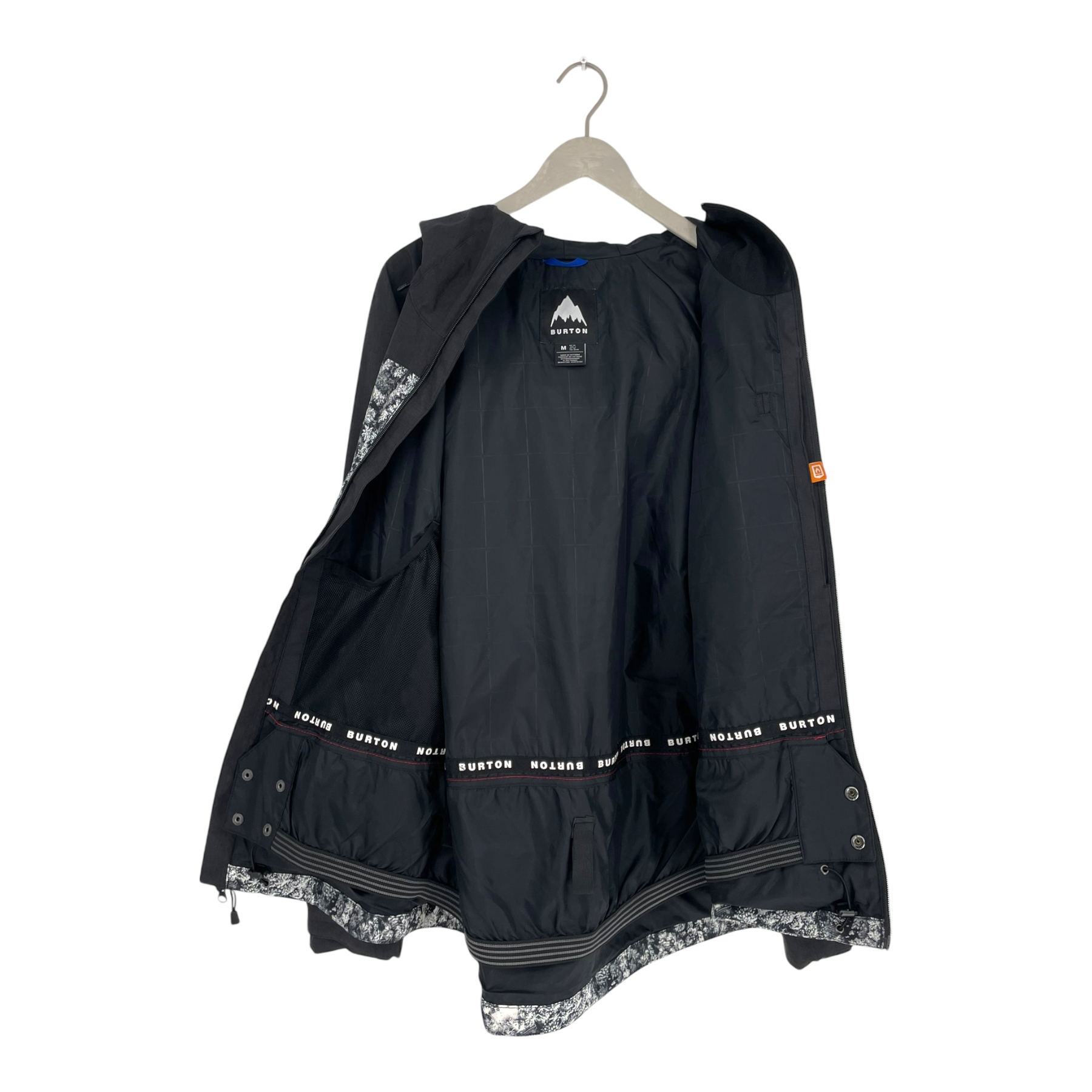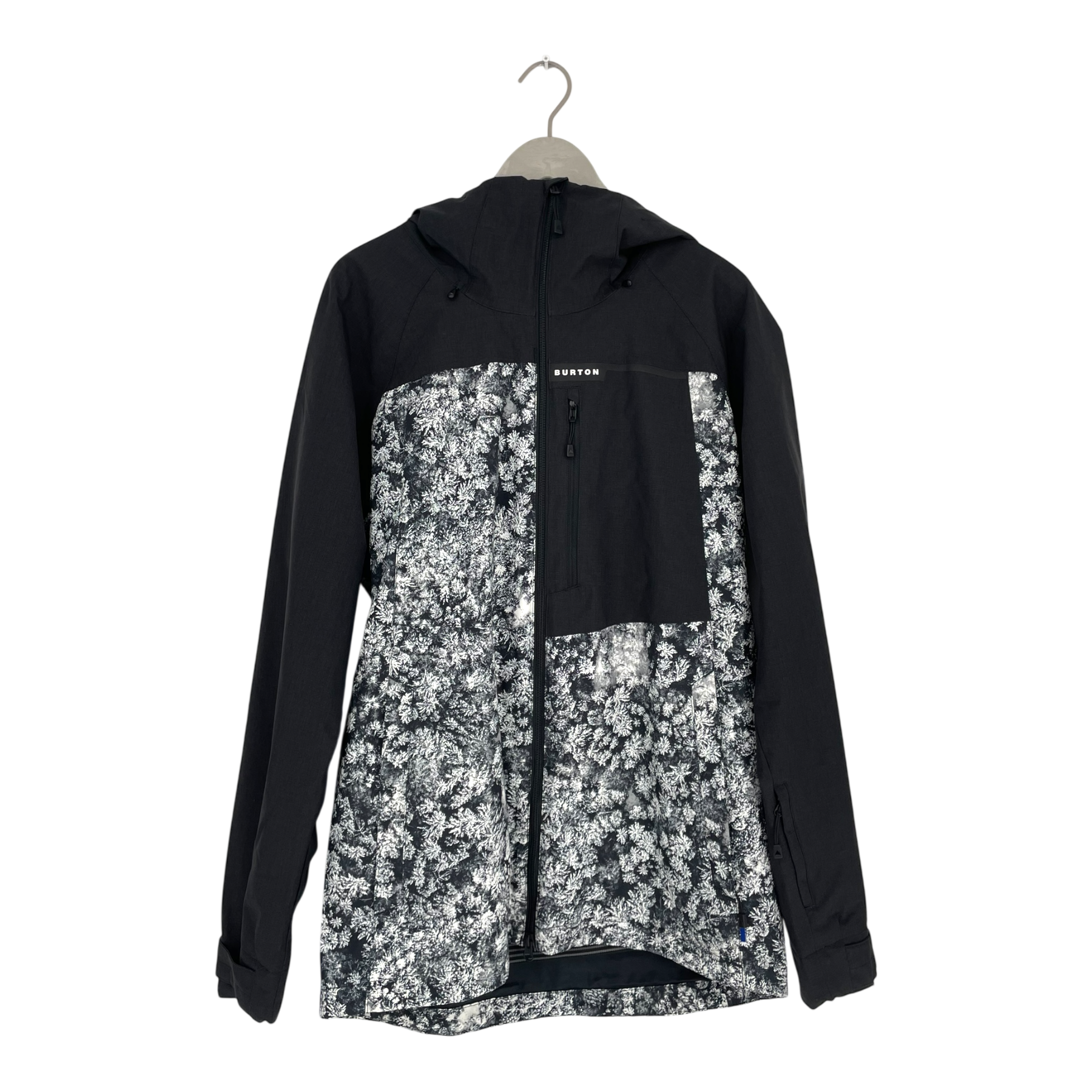 Burton snowboarding/ski jacket in a gey and white print. The jacket has multiple zippered pockets, zippers for ventilation and a snow lock in the hem.