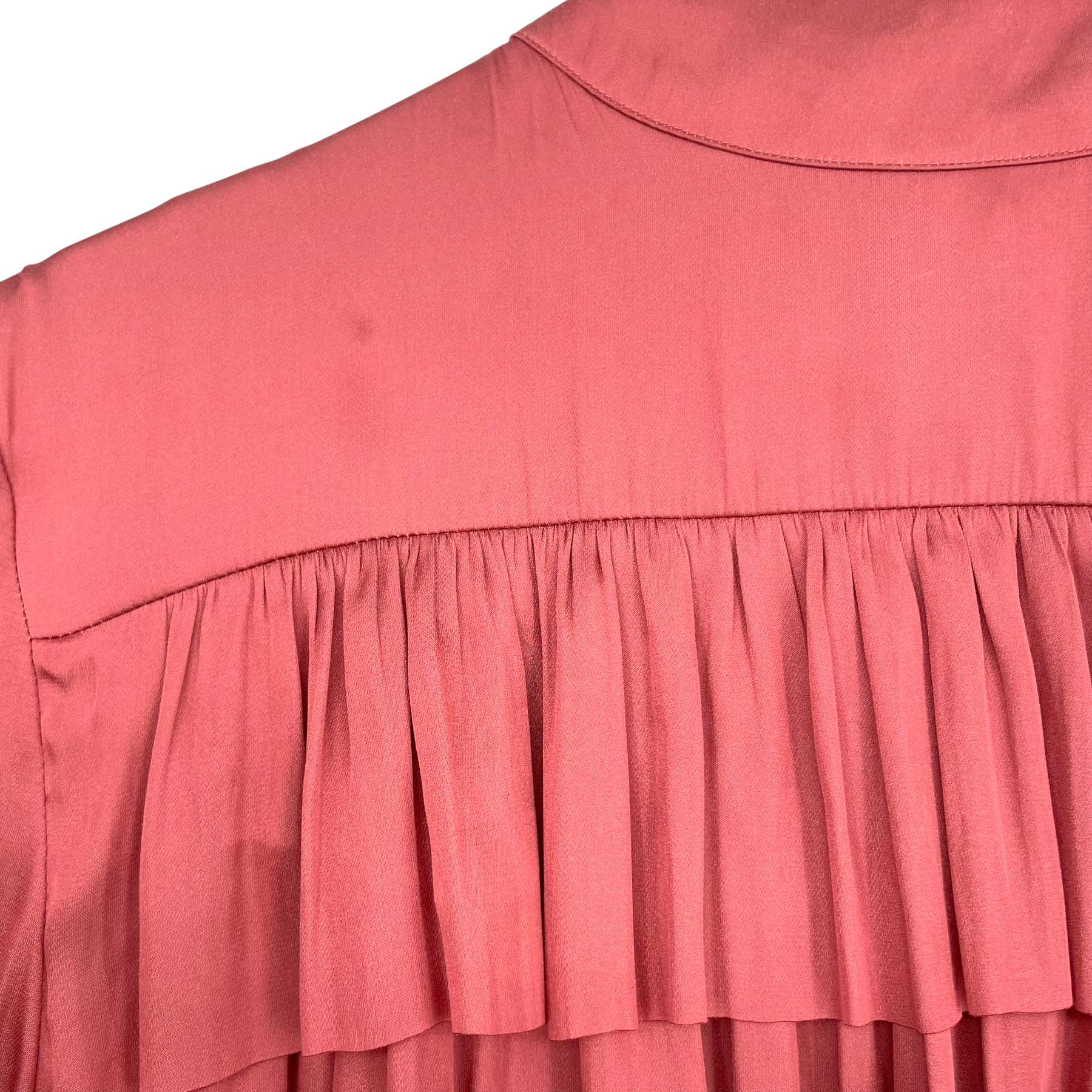DAY Birger et Mikkelsen woven frill style dress with 3/4 bell sleeves. There is a large tie that can be worn as a bow or you can let it flow as straight as in the pictures. Neckline is turtleneck.