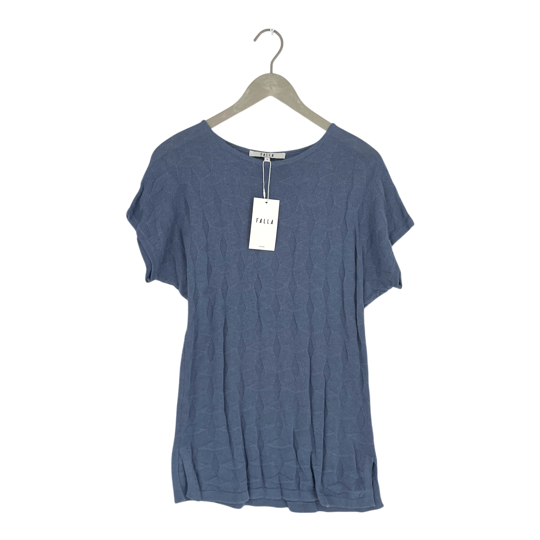 Falla Finland Hippu Knitted Shirt with short sleeves and a geometric pattern knitted into the fabric. The material is wonderfully soft to the touch, making it comfortable to wear throughout the day.