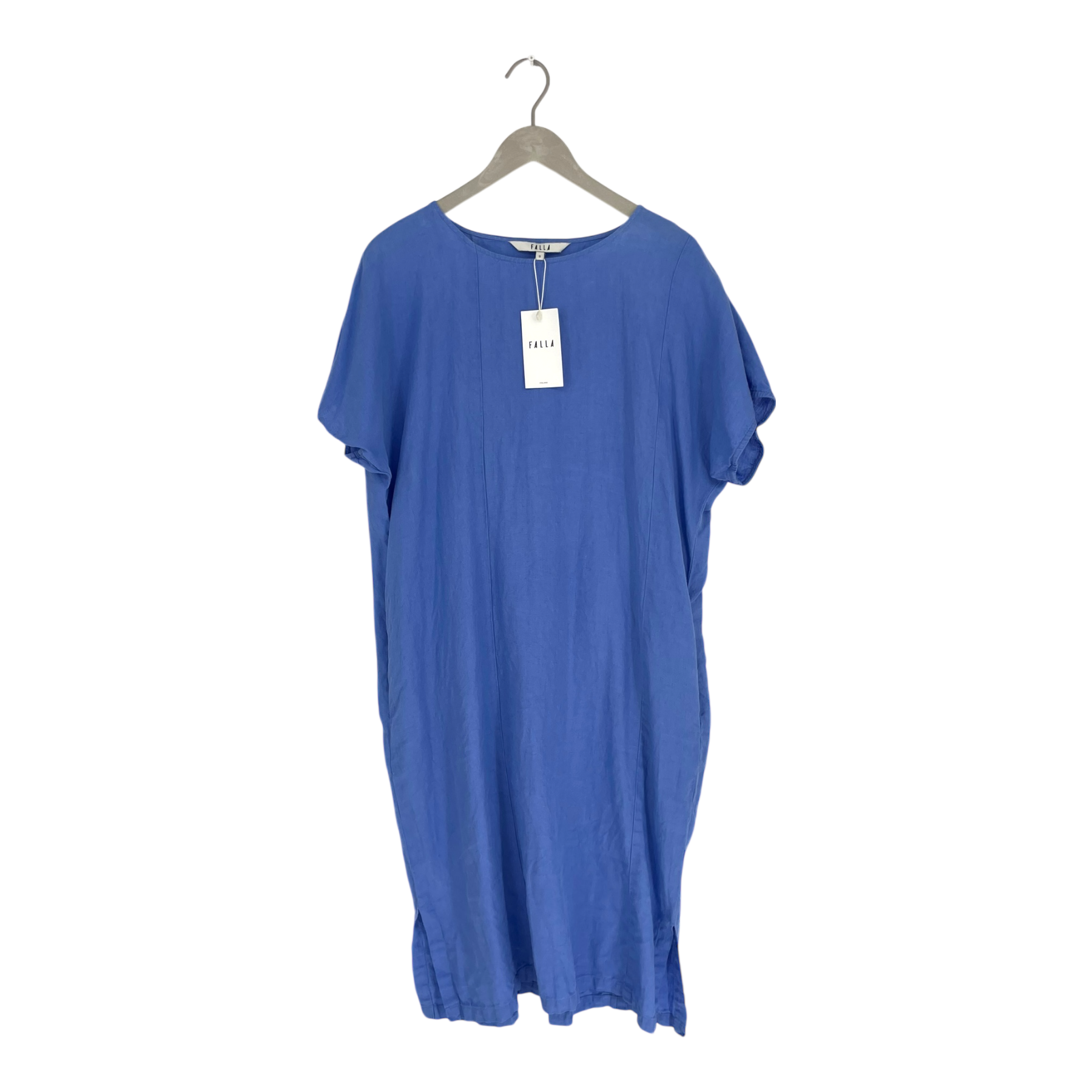 Falla Taivas Dress is a solid-colored, loose-fitting, and straight-cut dress. It features a round neckline, short cap sleeves, and pockets, with stylish slits at the hem. The dress comes with a detachable belt to accentuate the waist.