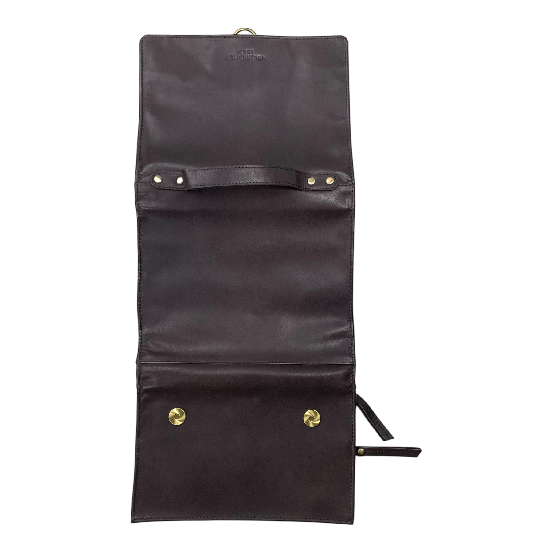 Holzrichter Berlin leather toiletry bag with fold-up design. Crafted from premium full-grain leather, this elegant toiletry bag from Holzrichter Berlin features a classic fold-up construction with a top handle for easy carrying. Inside, multiple zip  and snap button compartments and organizational sections to keep personal care essentials neatly arranged. When opened, it lays flat for convenient access; when closed, it forms a sleek, structured silhouette. Ideal for both travel.