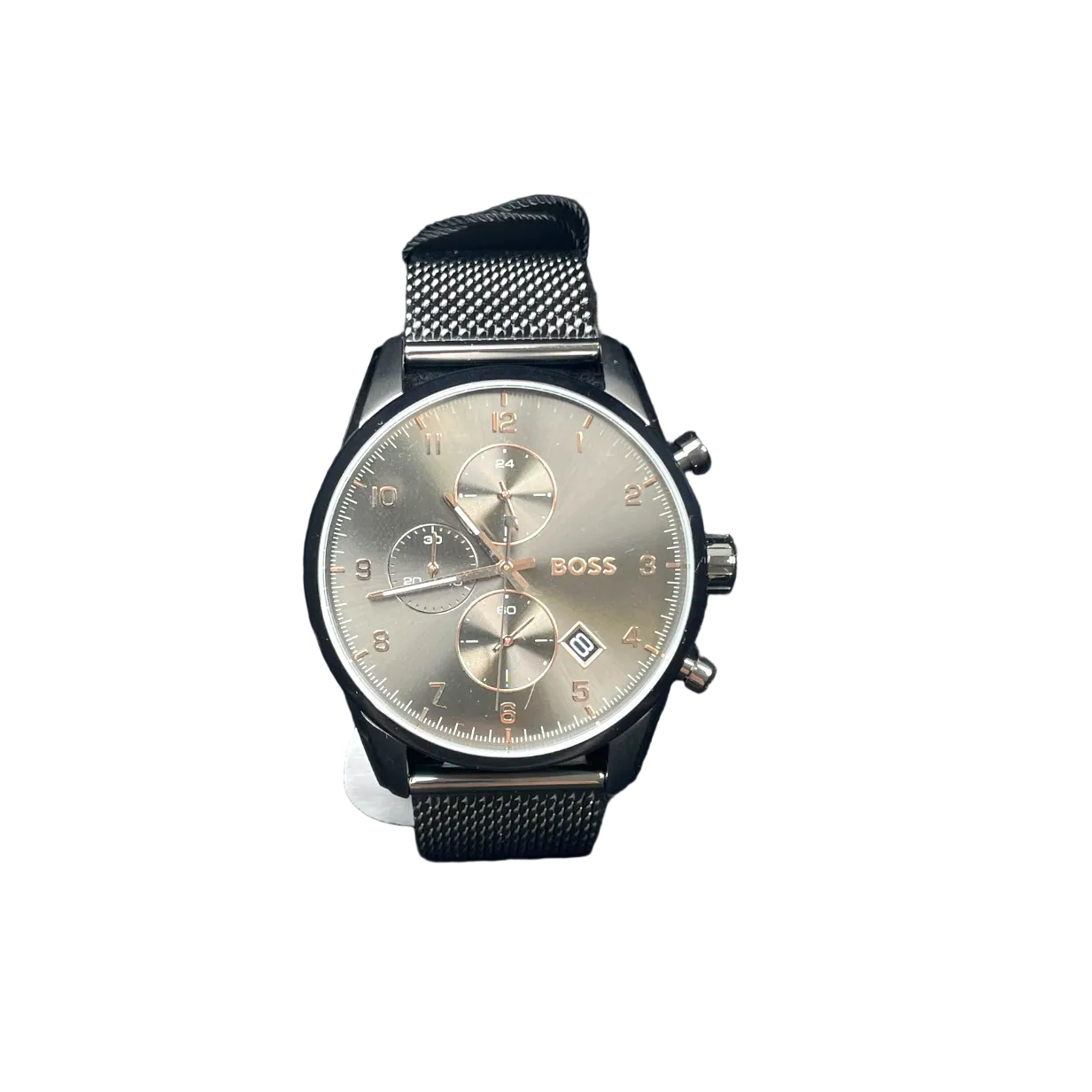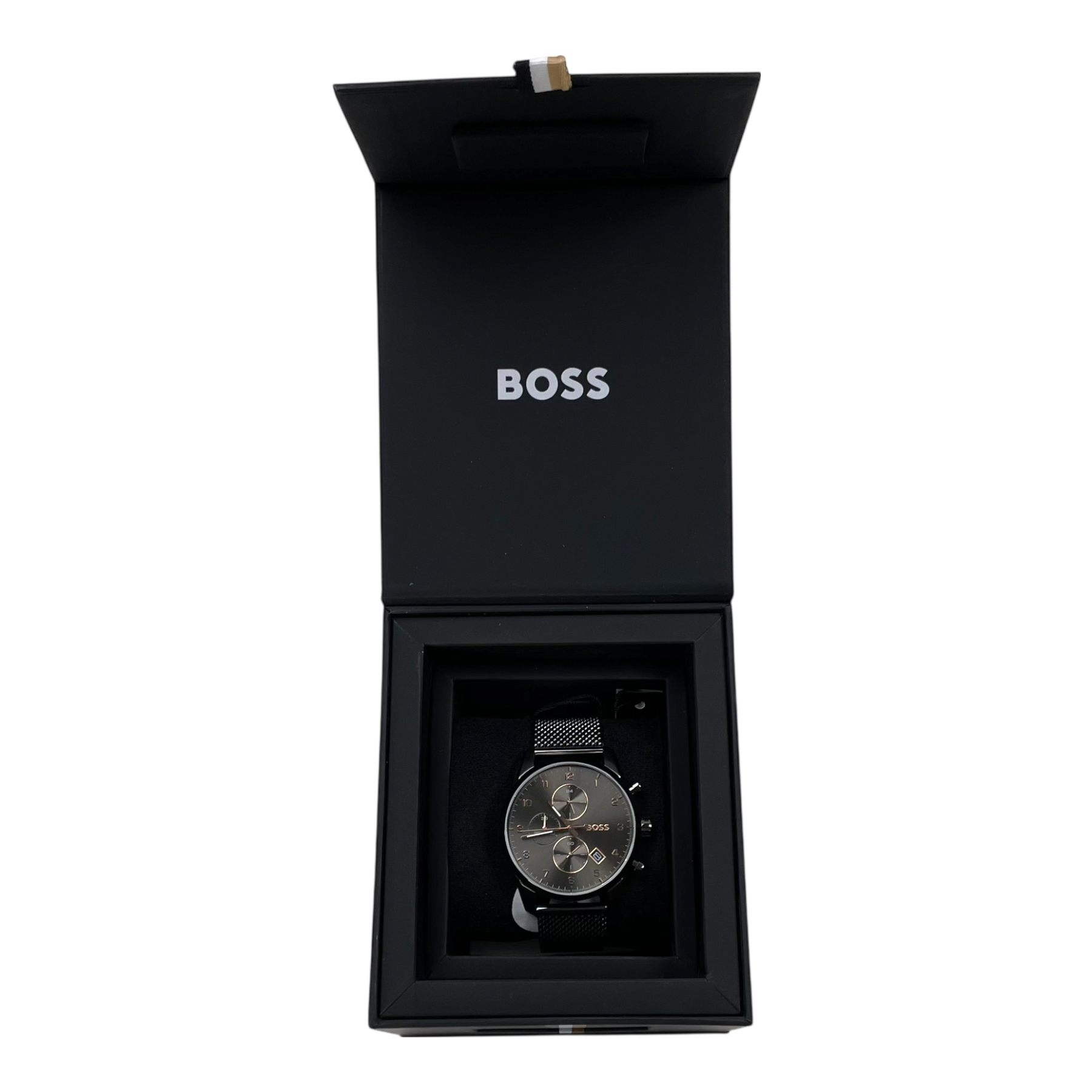 Hugo Boss Skymaster mens watch. This watch is made out of stainless steel, has a 44mm diameter, and a 5 Atm water resistance. Comes in the original box with tags still attached.