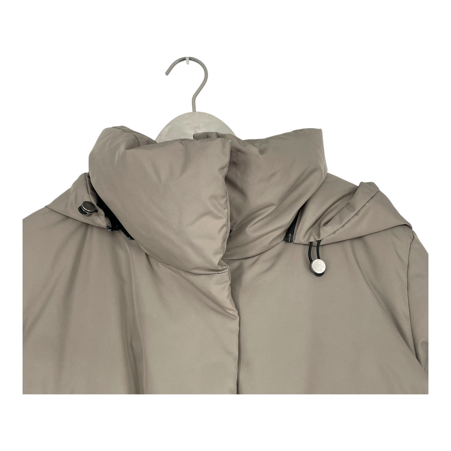 Joutsen Laulu jacket is a down jacket perfect for the colder weathers. There is two pockets with concealed zippers. The snap buttons and the double-slider fastening zipper adds comfortability and daily functionality in the front. There is a large warm hood that that can be adjusted with a drawstring or removed with a zipper. The sleeves can be rolled up for a better fit.